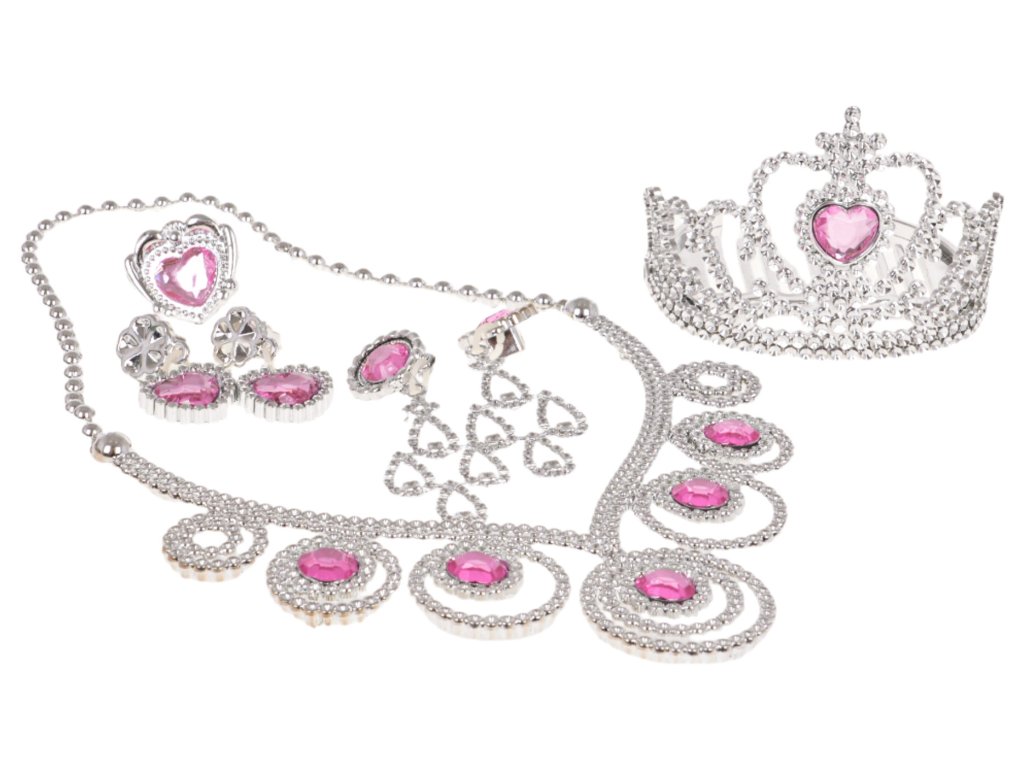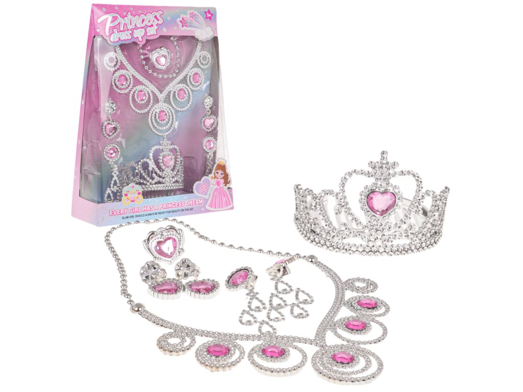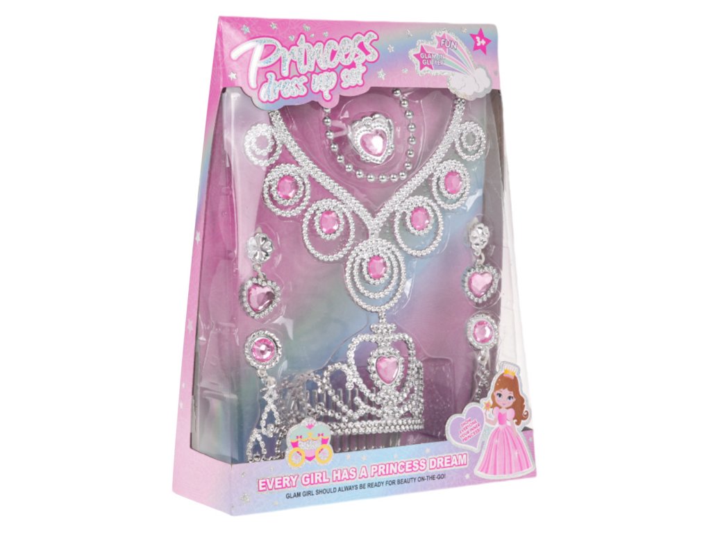 A richly equipped little princess set for children from 3 years of age. The set was made with attention to detail and includes a tiara, necklace, earrings and a ring. Every little girl will feel like a princess in it. The details in this set are made of plastic diamonds and imitation gemstones, in silver and pink colors. Everything is packed in a box, perfect for a gift. Kit features: