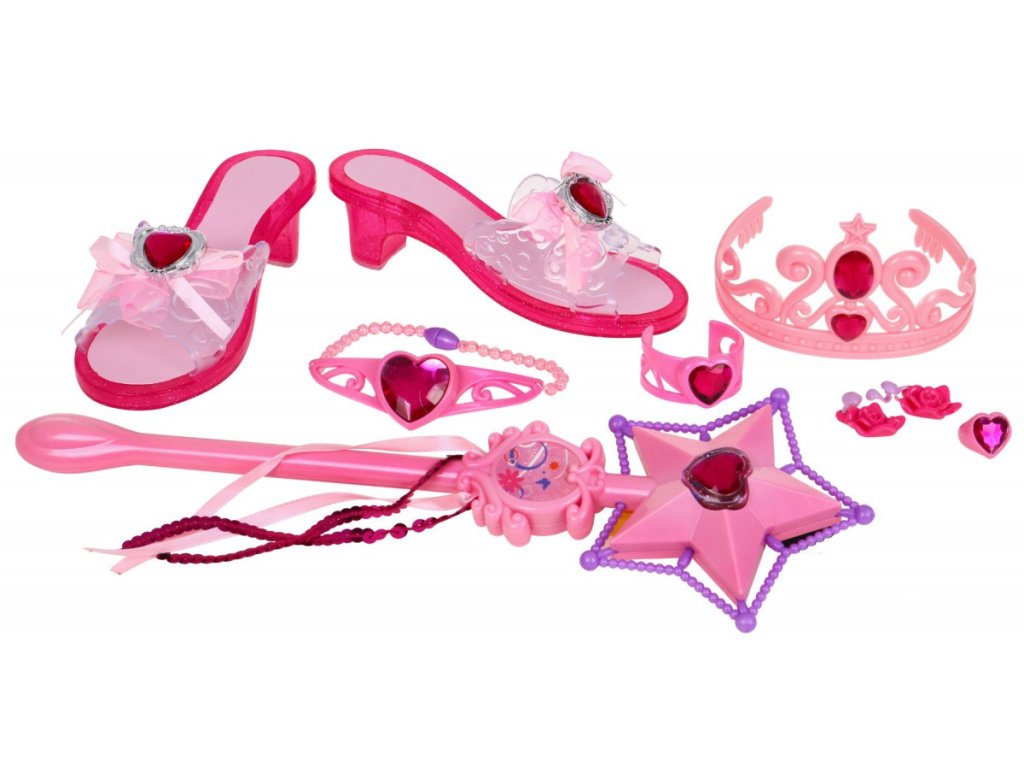 - 2 x slippers (length approx. 19 cm, width approx. 7 cm, heel height approx. 4 cm), - wand (about 15.5 cm x 11.5 cm), - diadem - necklace, - bracelet, - 2 x earrings, - ring. | |