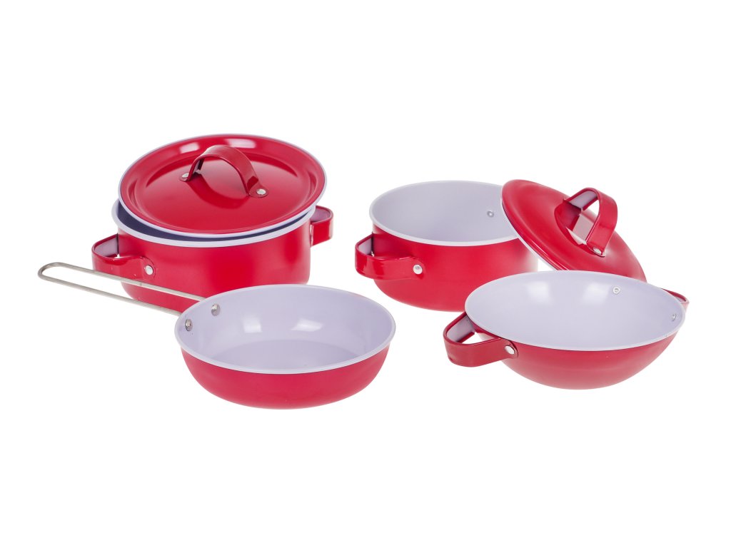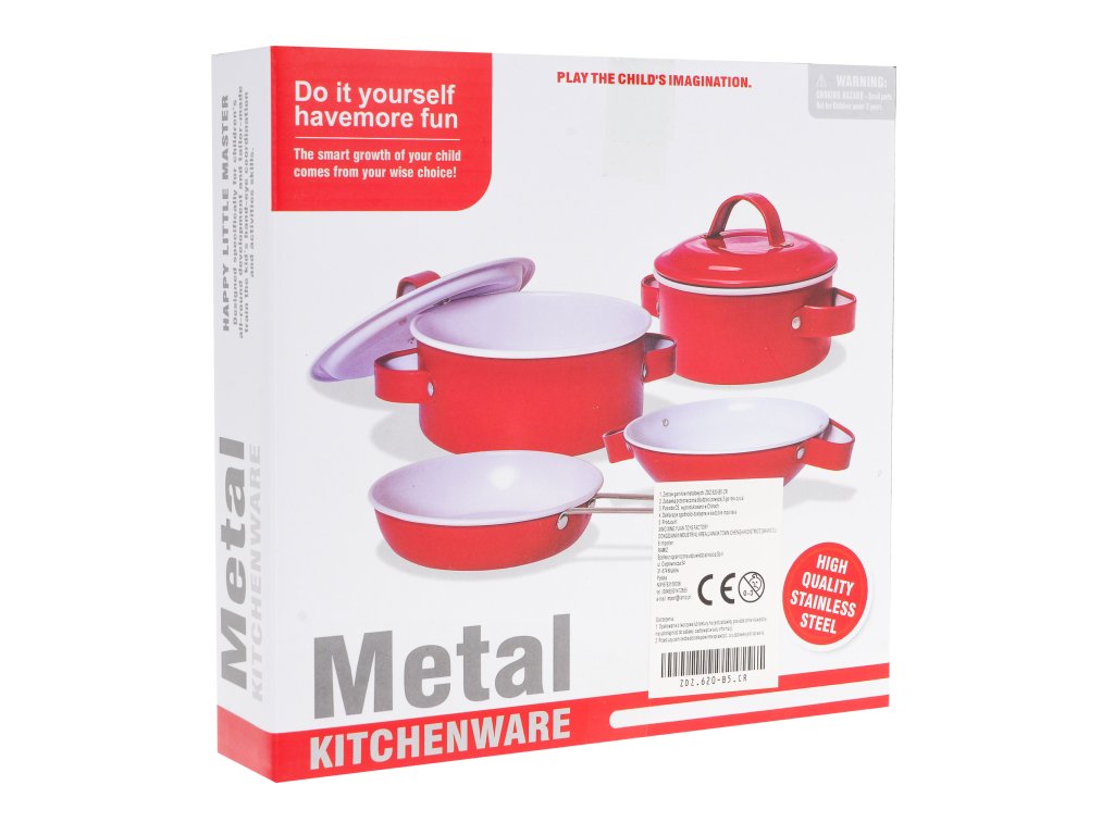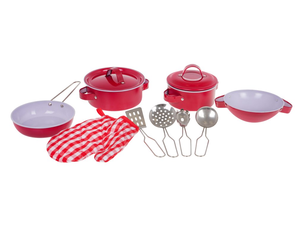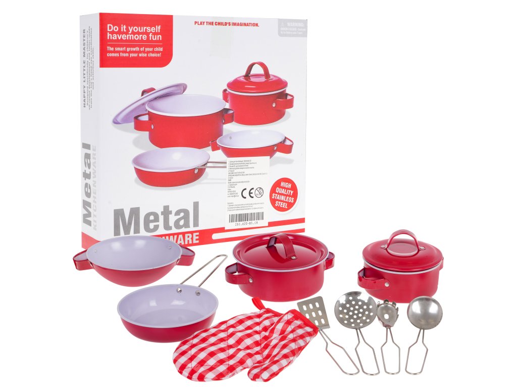 A set of metal pots for children from 3 years of age. The set includes two pots with a lid, a bowl and a frying pan, as well as a glove and kitchen utensils. The pots look very similar to real ones. Not only do they look beautiful, they are also durable and solid. |
