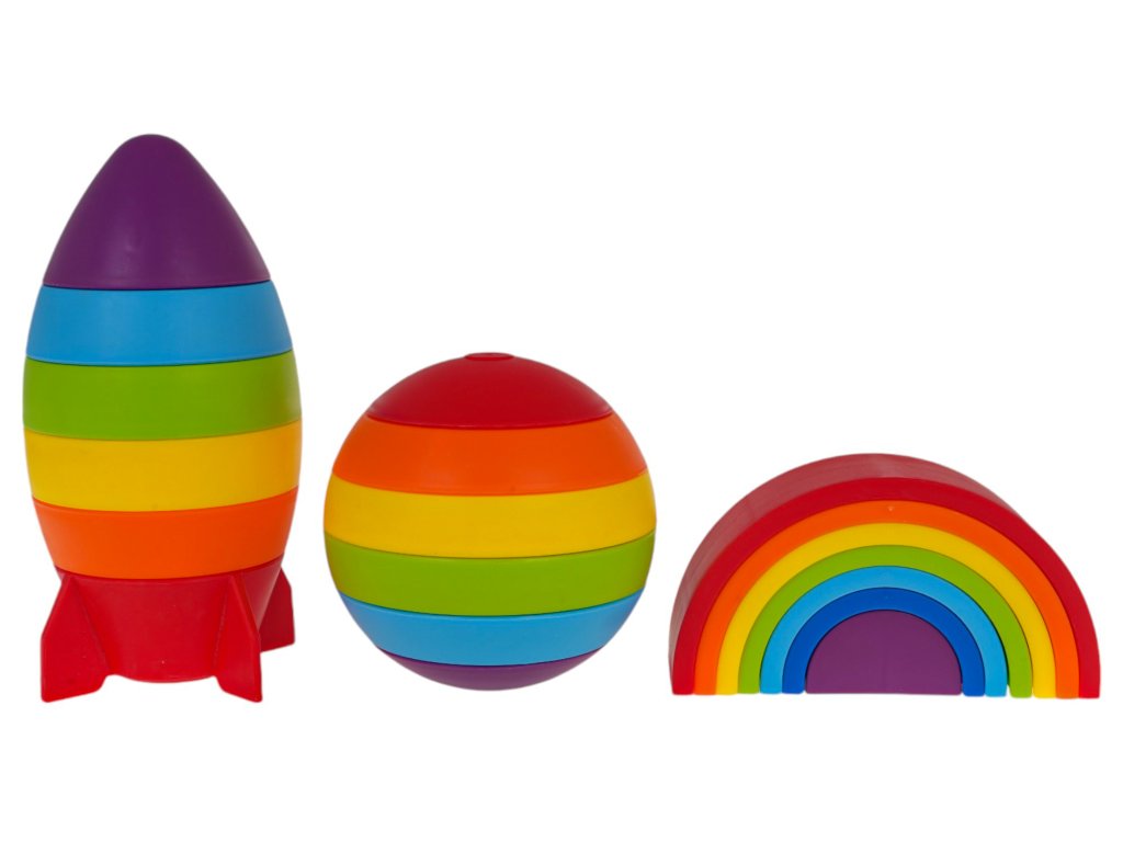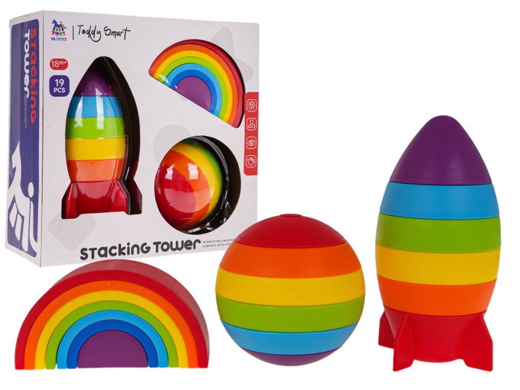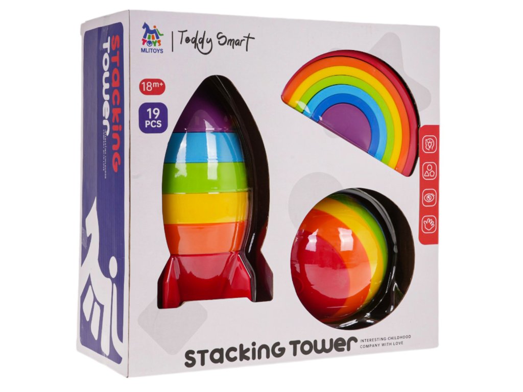 A set of sensory toys for stacking, for children from 18 months of age. The set consists of 19 elements in different colors, from which the baby can arrange a rocket, rainbow and ball. Various, vivid colors stimulate the baby's senses and encourage play. This set gives unlimited possibilities for play.