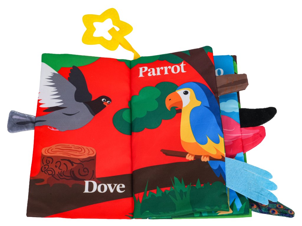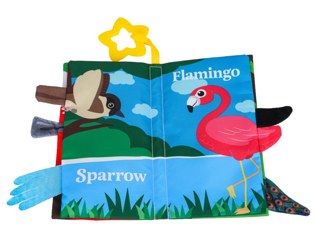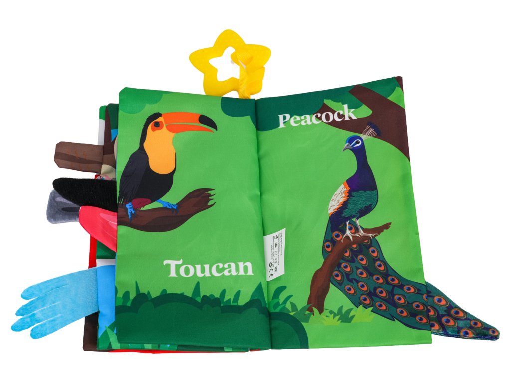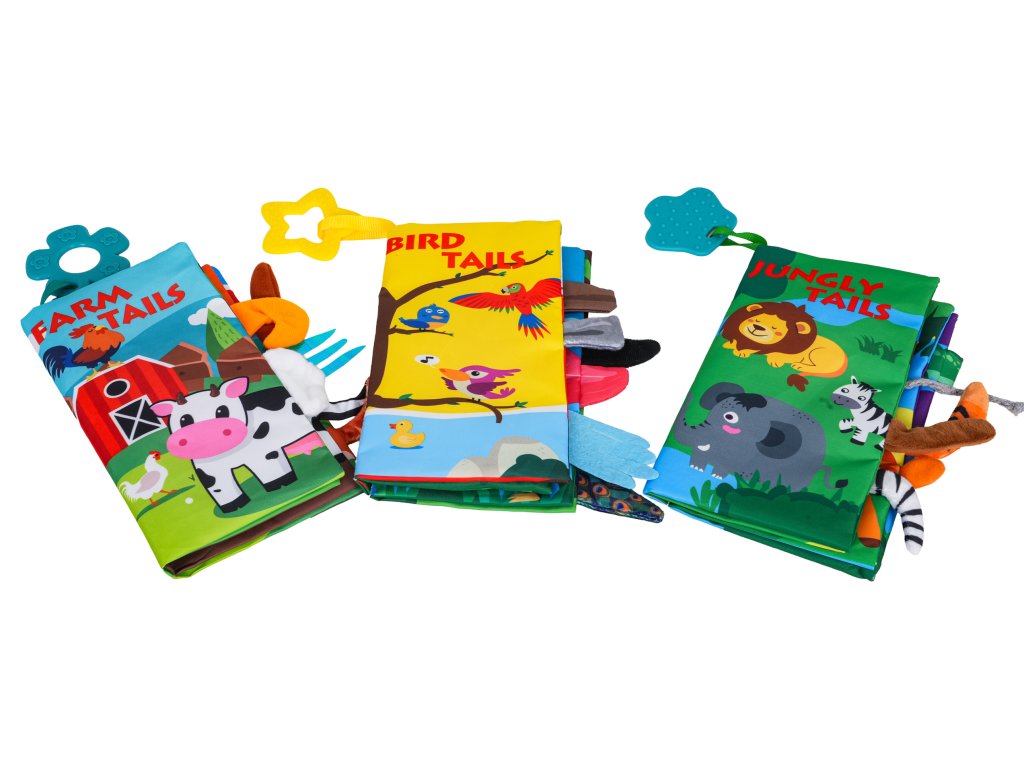 A set of soft sensory books for babies from three months of age. Made of the highest quality, baby-safe materials, the set features rustling, squeaking, and soft-touch pages that stimulate baby's senses on many levels. Vibrant colors attract baby's attention and encourage educational play. The soft pages feature illustrations of numerous animals. The first book features safari animals, the second farm animals, and the third various birds. Each animal is labeled in English. Tails protrude from each page, and each book also comes with a teether. The books are waterproof and easy to clean.