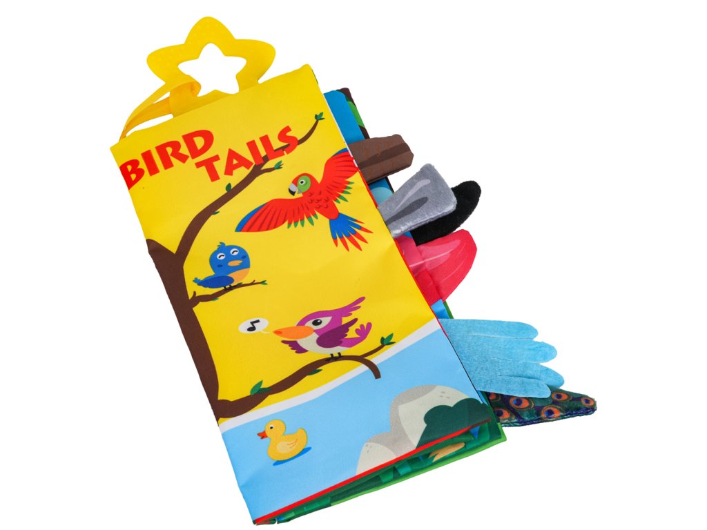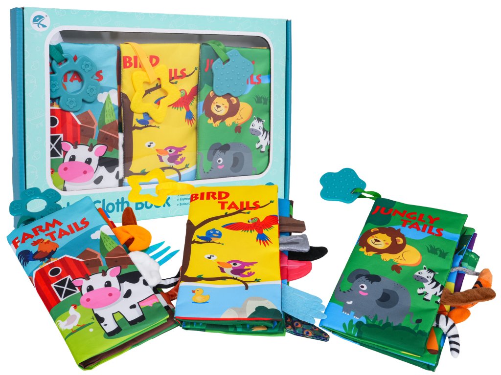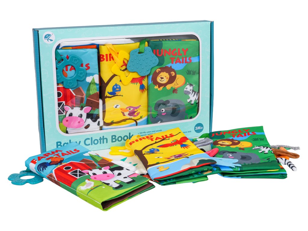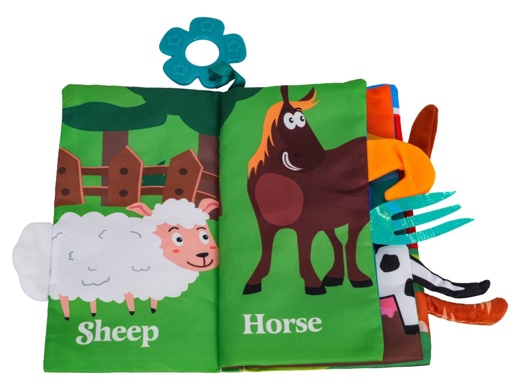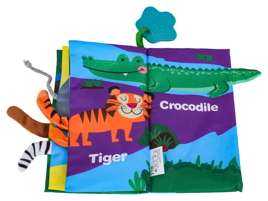 A set of soft sensory books for babies from three months of age. Made of the highest quality, baby-safe materials, the set features rustling, squeaking, and soft-touch pages that stimulate baby's senses on many levels. Vibrant colors attract baby's attention and encourage educational play. The soft pages feature illustrations of numerous animals. The first book features safari animals, the second farm animals, and the third various birds. Each animal is labeled in English. Tails protrude from each page, and each book also comes with a teether. The books are waterproof and easy to clean.