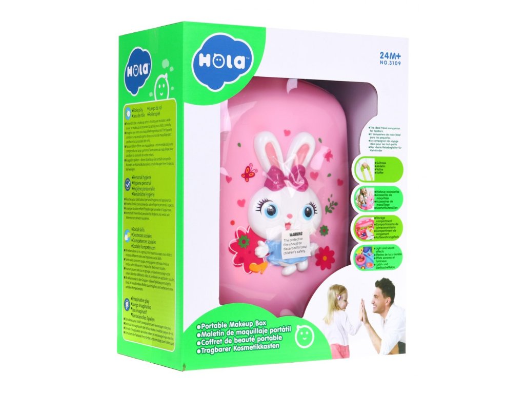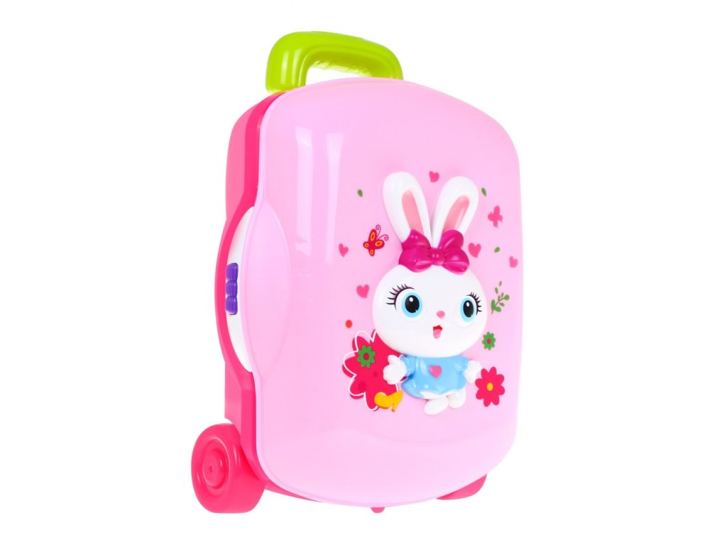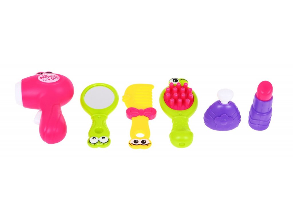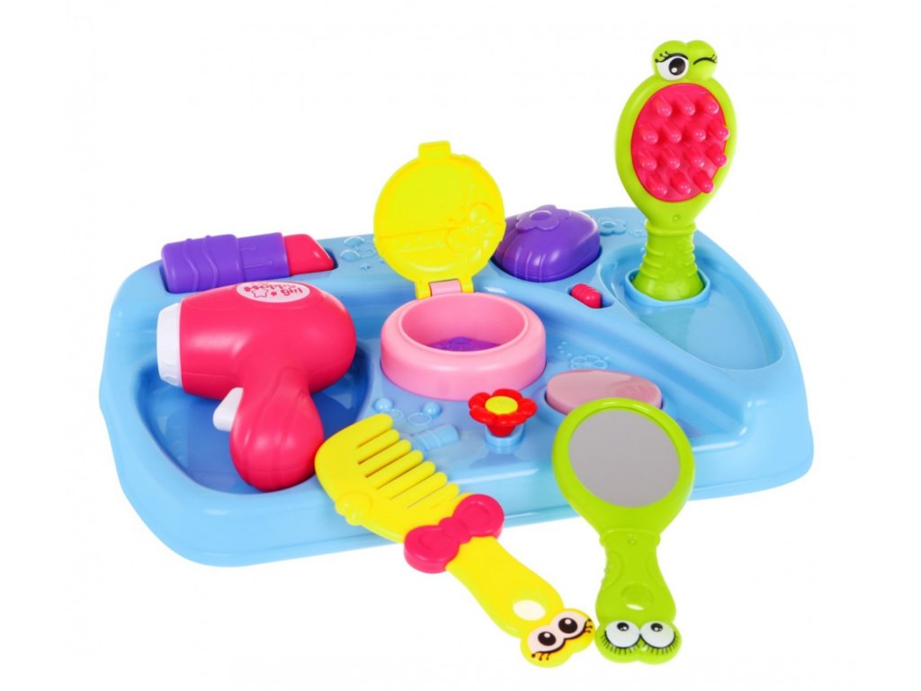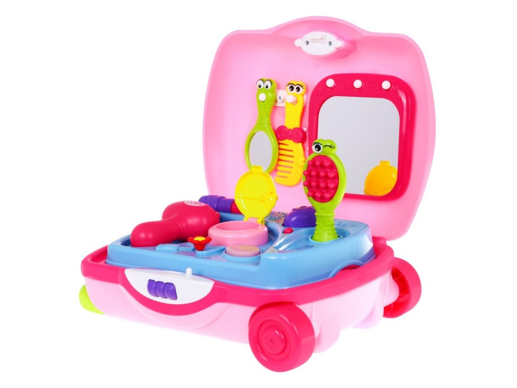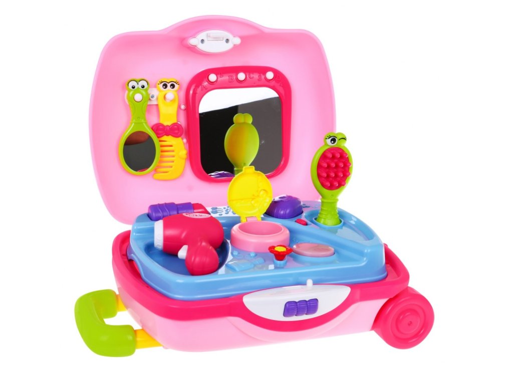 A suitcase set, a dressing table with accessories is a toy that will surely appeal to every girl. The dressing table has sound and light effects and a volume control function. The set consists of a large portable suitcase on wheels with a retractable handle, inside there are accessories such as: a small and large mirror, a dryer, a comb, a brush, a perfume bottle (dummy) and a lipstick (dummy). The accessories can be placed on the vanity top that is removed from the suitcase and put back into the suitcase after the game is over. The toy is intended for children from 24 months of age. It was made of high-quality colored plastic. It is powered by AA batteries (3x1.5V) - not included. | |