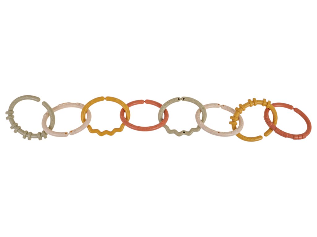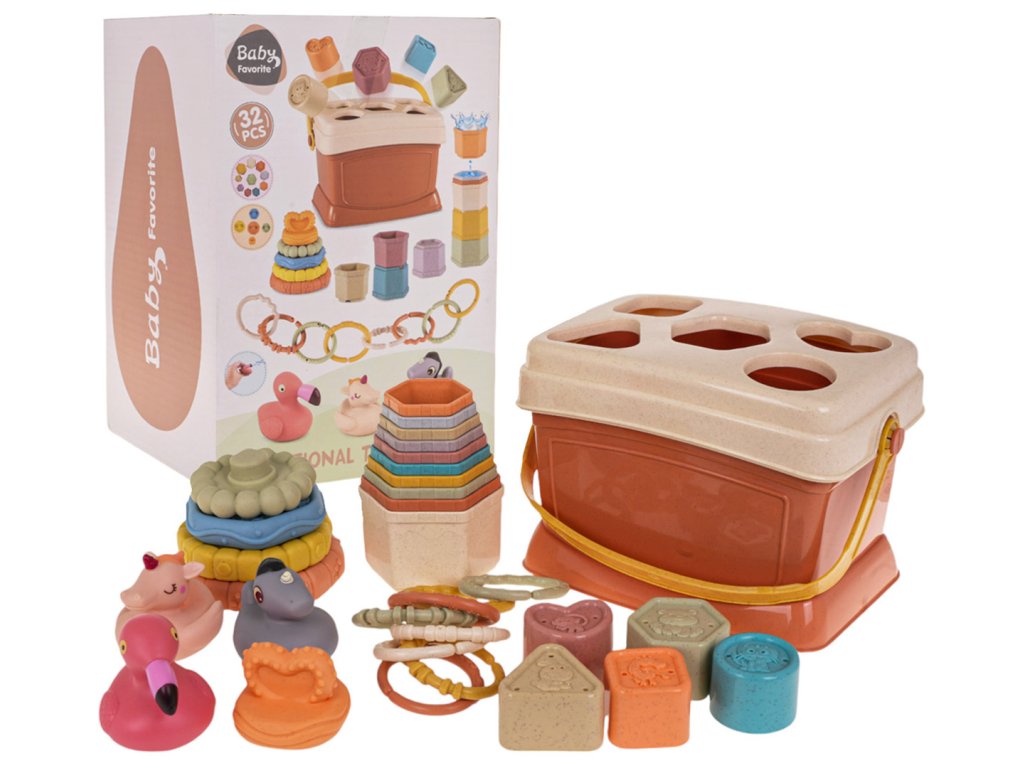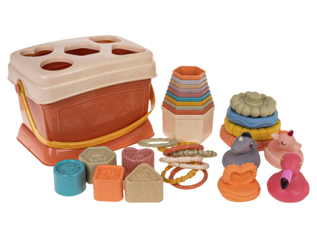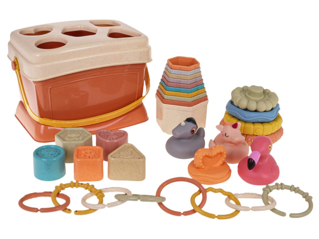- sorter, box with a comfortable carrying handle, - 4 blocks of different colors and shapes, - 3 rubber animals, - 10 pyramid construction elements, - 8 rings for attaching and creating a chain - 5 rubber elements per pyramid. |