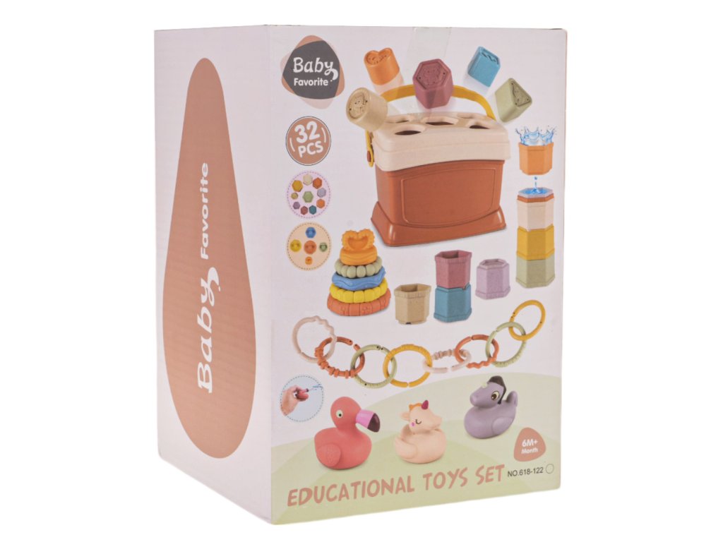A set of colorful educational toys for babies from 6 months of age. The set includes a shape sorter with a comfortable handle for carrying, blocks, rubber animals, pyramids for building a tower, construction circles and elements for attaching. Various colors and shapes attract the baby's eye and encourage play.