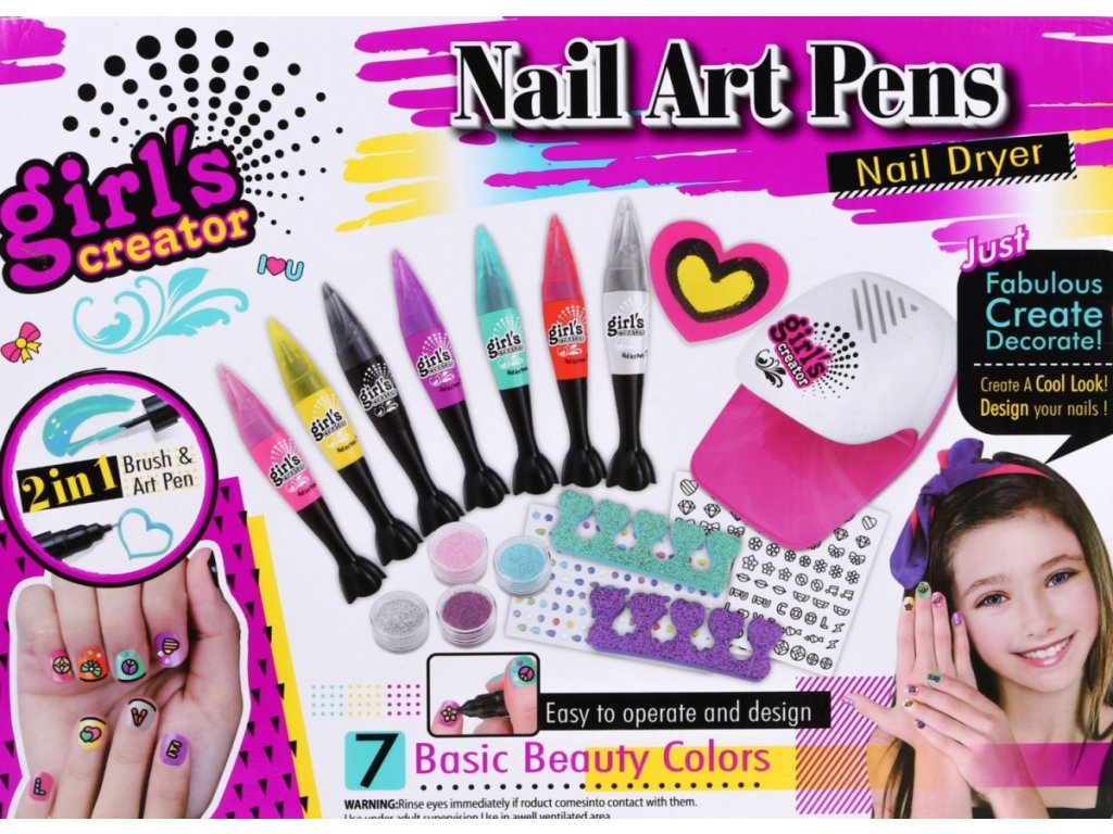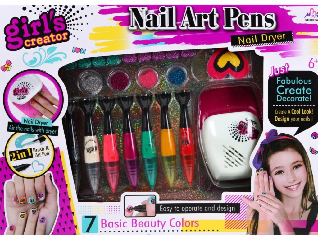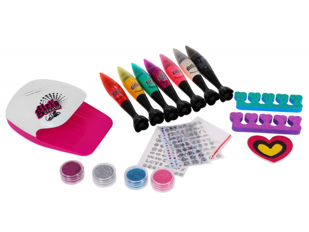 - nail dryer powered by batteries (2 x 1.5V), - decorative pebbles on nails, - 2 packs of decorations on the nails, - 10 needles for nail pens, - 2 x foot separator (about 10 cm x 3 cm), - a nail file in the shape of a heart (about 6 cm x 5,5 cm), - 7 x pen and brush with nail polish (about 14 cm x 2.5 cm) - 4 x brocade. | |