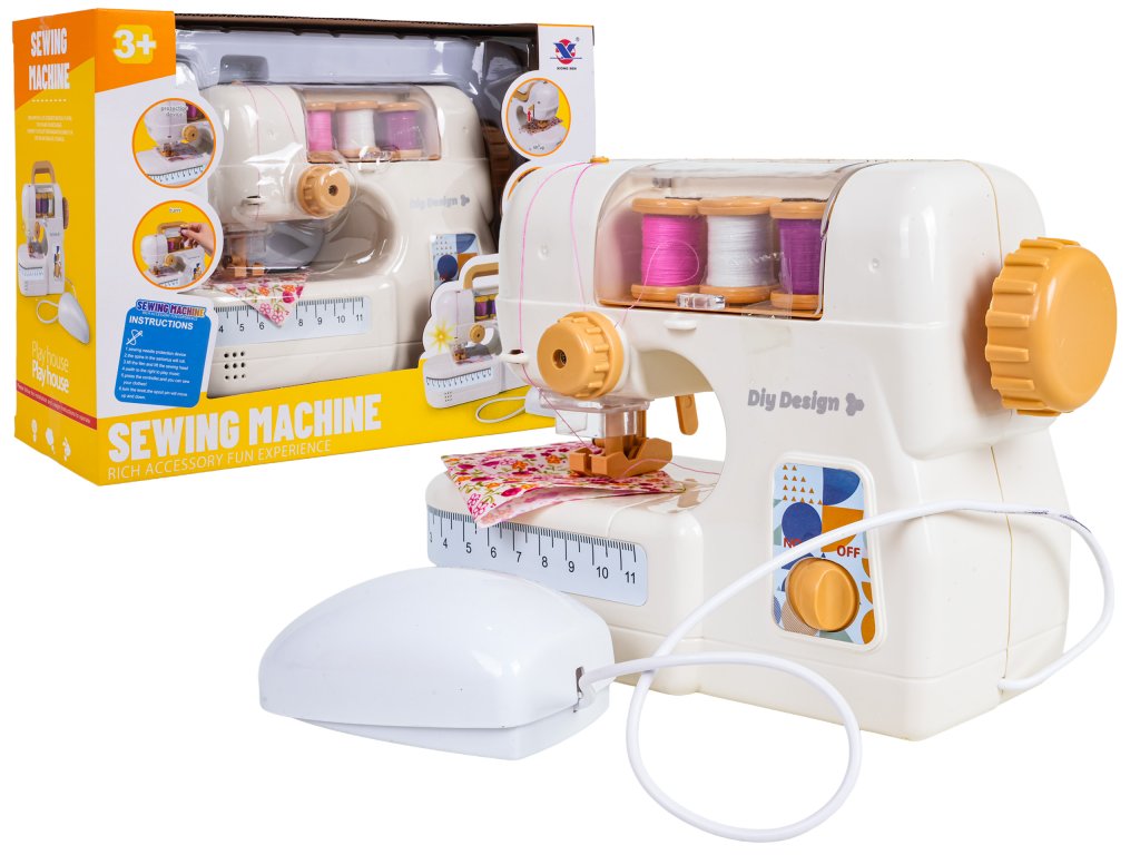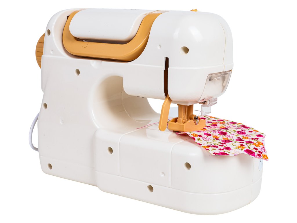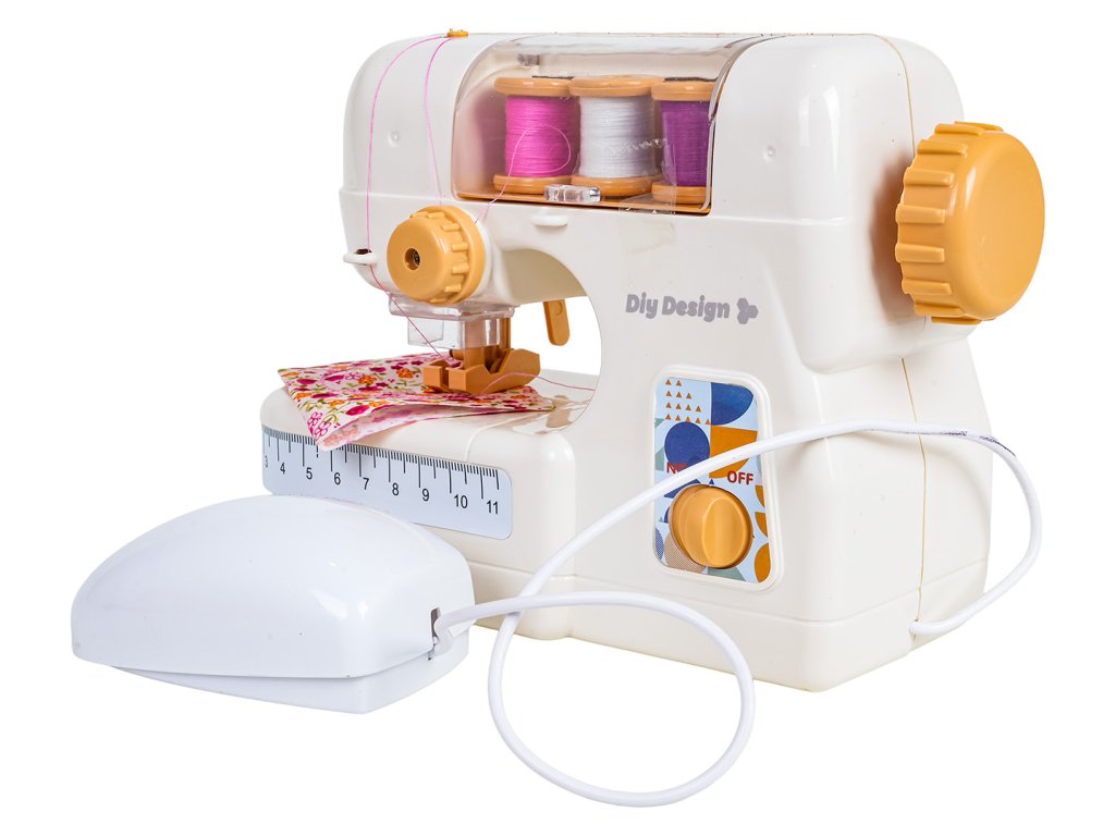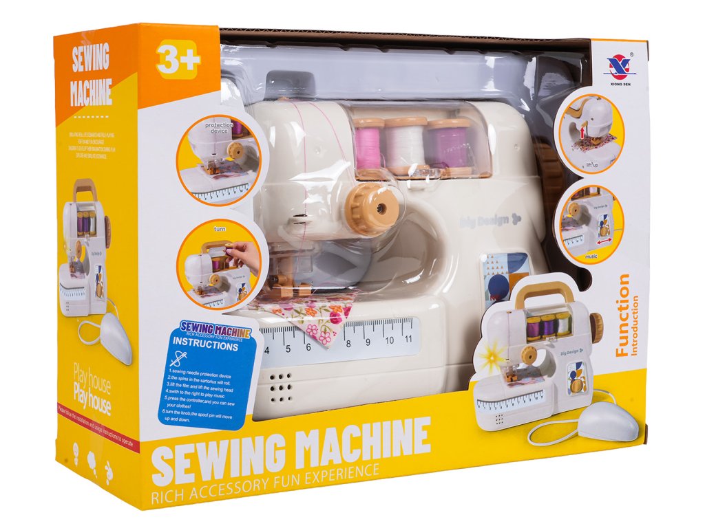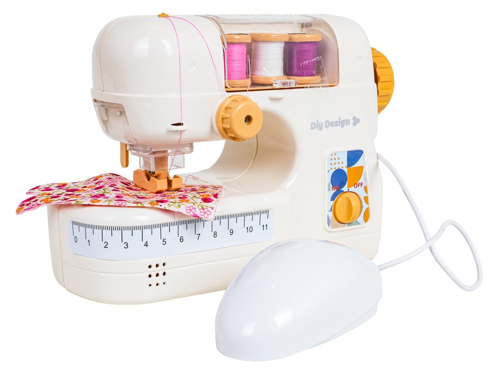 An interactive sewing machine with sound and light effects for children aged three and up. Made of durable materials, this toy is child-safe. The machine has a built-in needle to prevent injury. The toy is equipped with a practical mouse to activate the machine, a needle lifter, and a presser foot lifter. While the machine is in operation, a light illuminates and sewing sounds are heard. The set also includes three spools of thread and a piece of fabric. Playing with the machine supports the development of eye-hand coordination and creativity. The machine is powered by 4 x 1.5V AA batteries (not included).