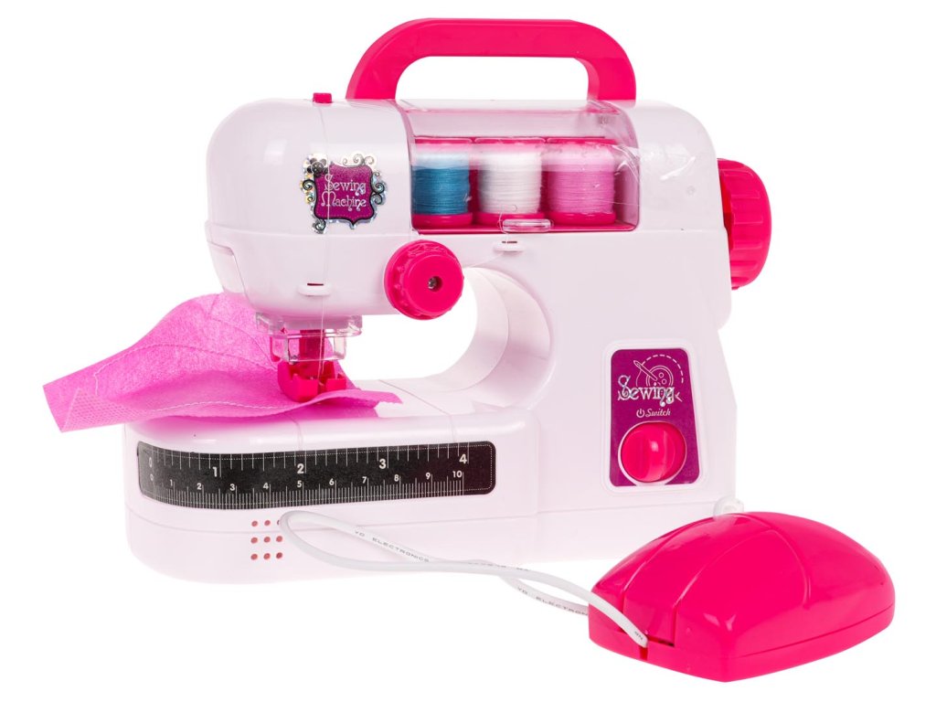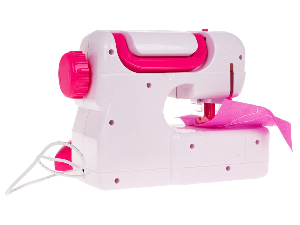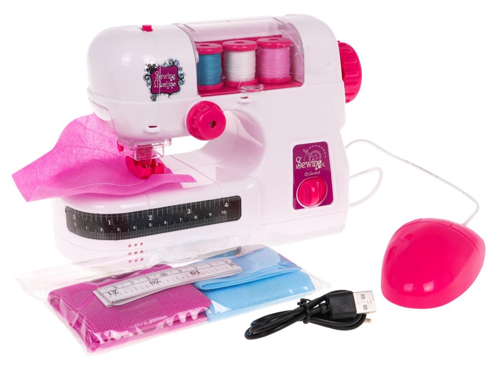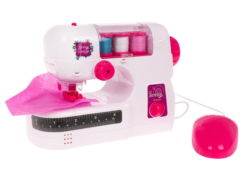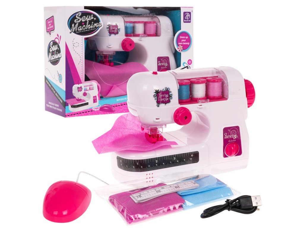 Interactive sewing machine with sound and light effects for children from 3 years of age. The toy is made of solid materials and is safe for children. The machine has a built-in needle that protects the child from cutting themselves. The toy is equipped with a practical mouse that starts the machine, a knob to lift the needle and a presser foot lifter. The light lights up while the machine is working. The set also includes 3 spools of thread, a threader, a tailor's meter and 2 pieces of material. Playing with the machine supports the development of eye-hand coordination and creativity. The machine is powered by 4 x 1.5V AA batteries, batteries not included.