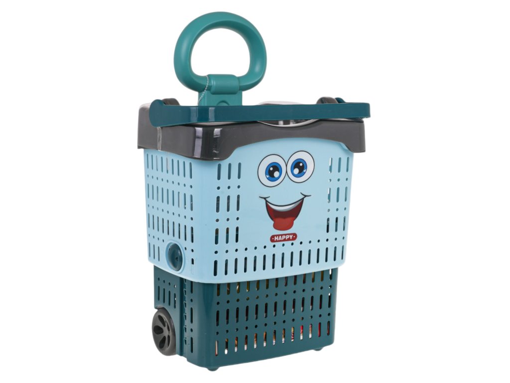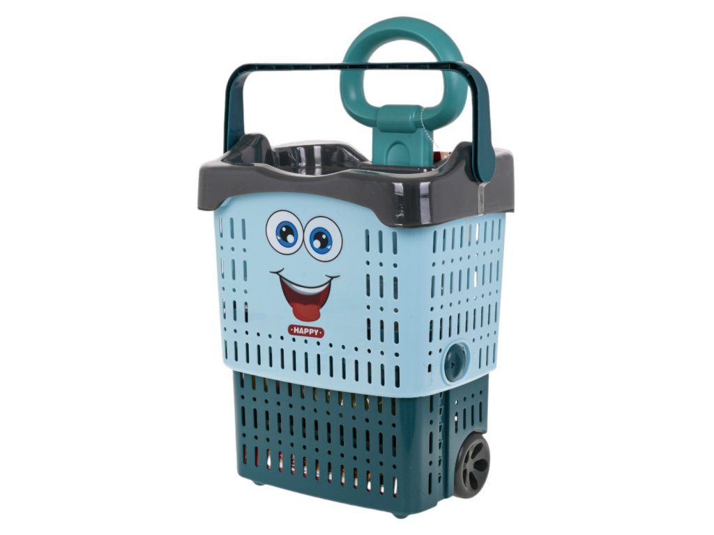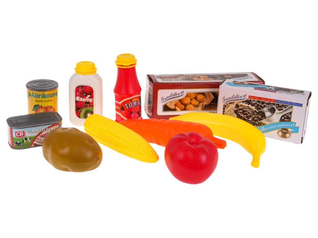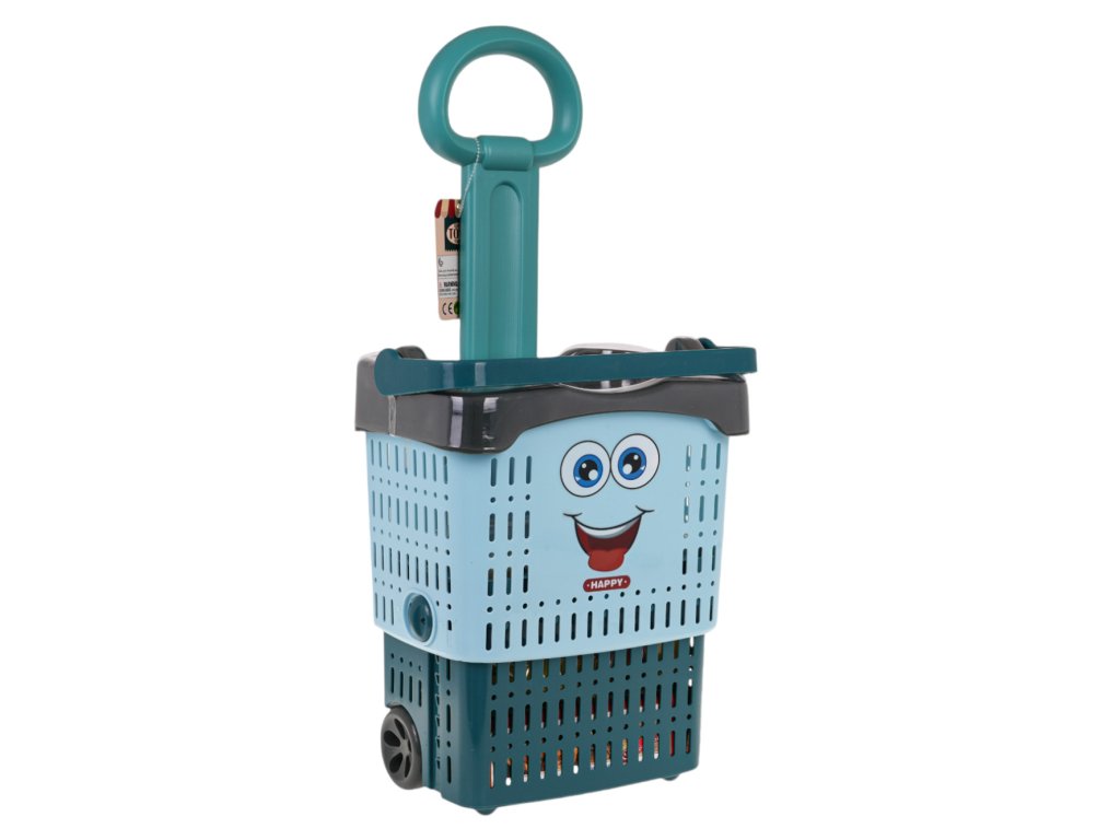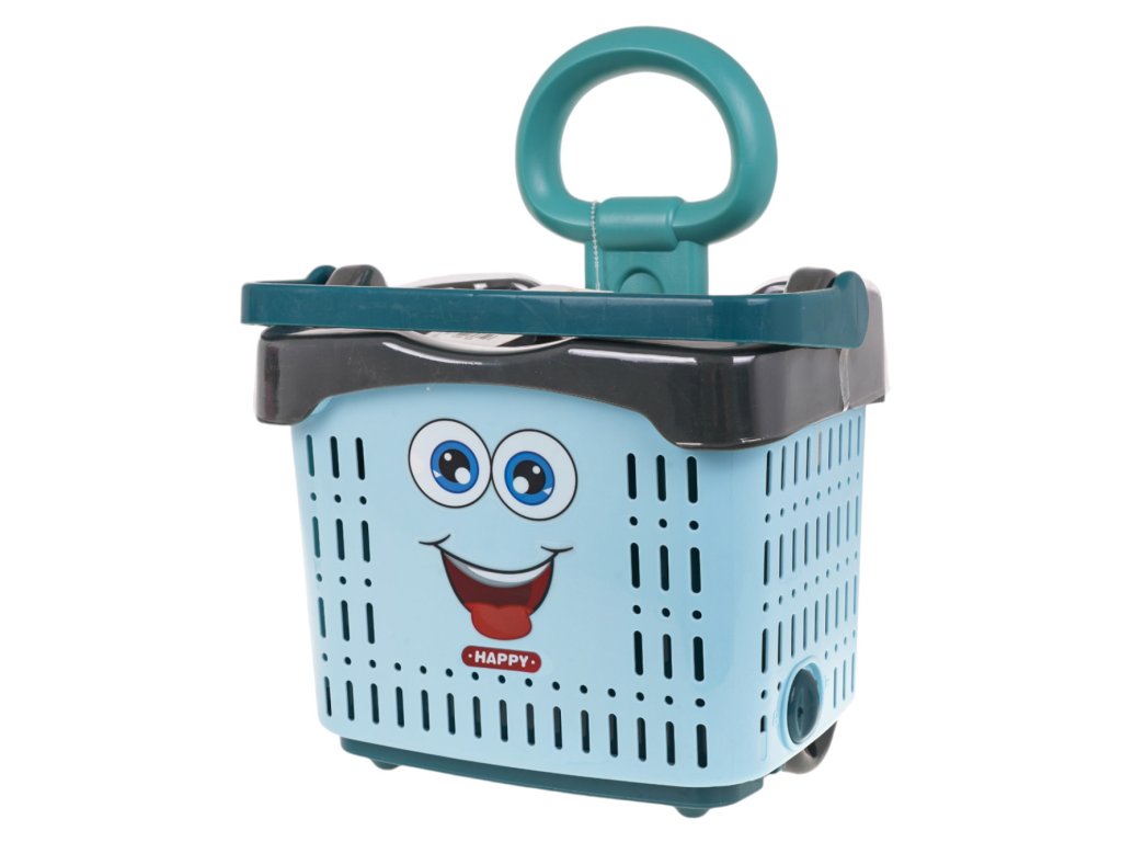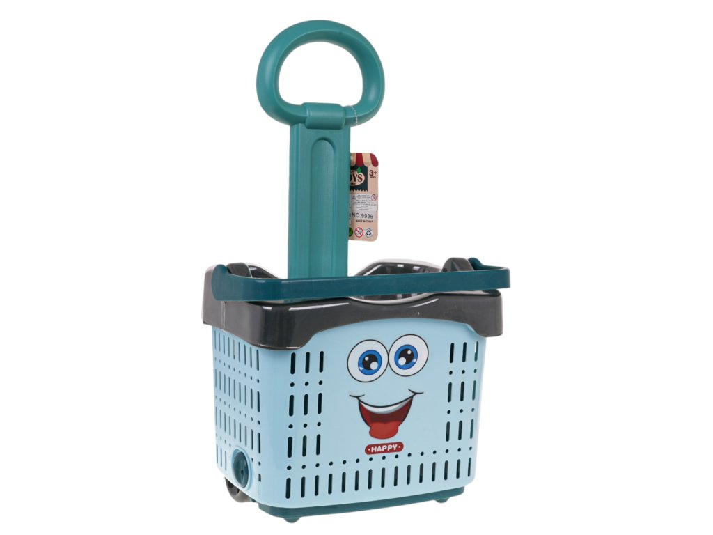 A shopping cart set with accessories for children from 3 years of age. The set includes a cart with mock objects and vegetables and fruits. The cart has a raised and lowered handle with a push bar and a handle. The handle can be extended, retracted, and the entire cart can be lowered and raised, depending on how many accessories we want to keep in it. The cart has wheels to make it easier to move the toy. The set is made in vivid colors, with attention to detail.