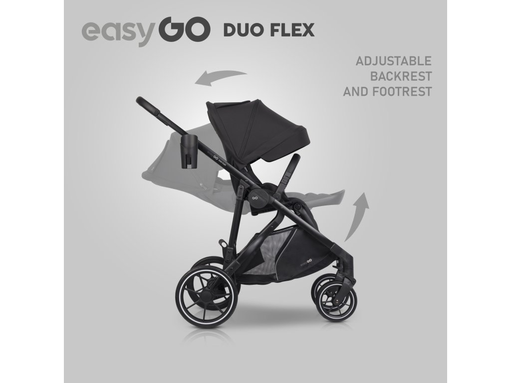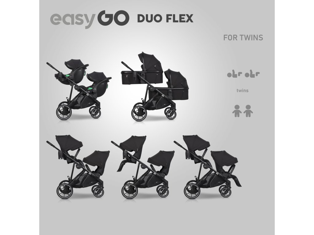Stačí si objednat verzi se dvěma přepravkami a dvěma sedadly. EasyGo DUOFLEX snadno pojme 2 velké přenosné postýlky nebo 2 autosedačky pro děti o velikosti 40 až 87 cm, a když děti začnou sedět samy, můžete nainstalovat dvě velká sedadla pro kočárek. Sedadla si můžete nastavit v libovolné konfiguraci: čelem k sobě, vpřed, nebo tak, aby děti byly otočené k sobě.