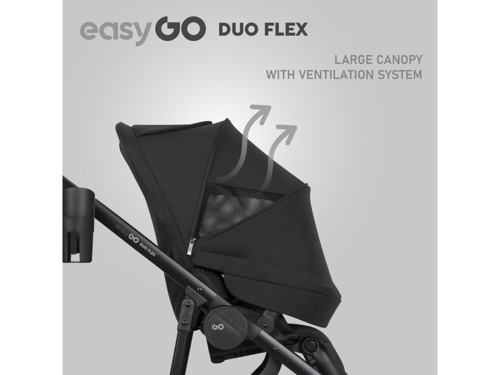 Přepravka kočárku DUOFLEX je velká (77 cm) a má až 3 uzamykatelné ventilační panely zakončené síťovinou, díky čemuž bude fungovat po celý rok. Velký sluneční baldachýn se skládacím baldachýnem lze díky další odnímatelné části naklonit dopředu. Sedačka kočárku DUOFLEX od EasyGo je navržena pro děti do hmotnosti 22 kg.