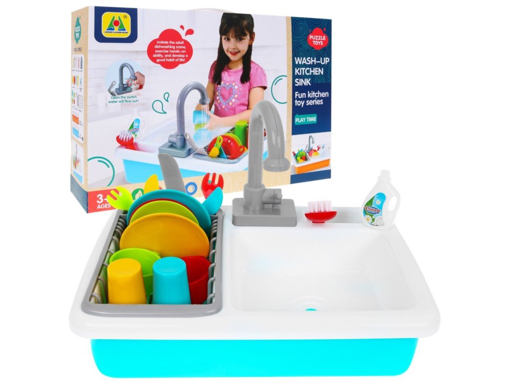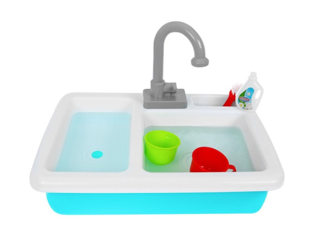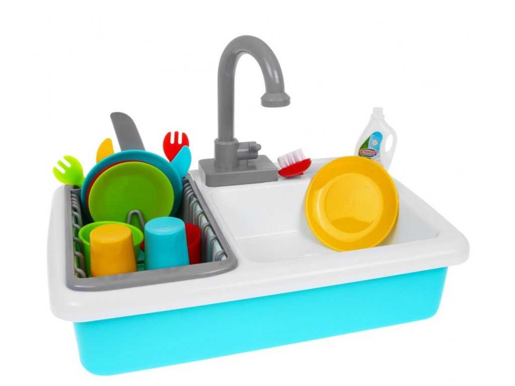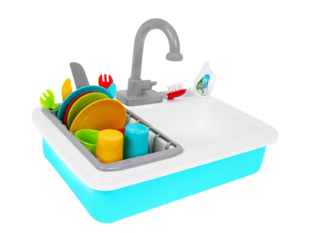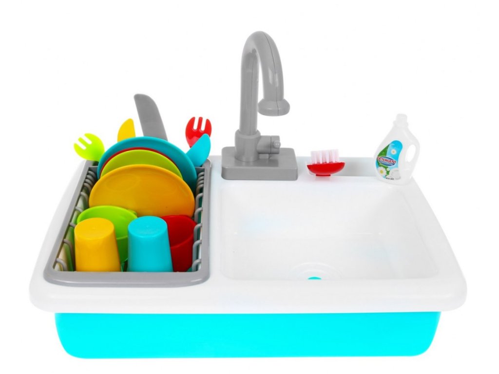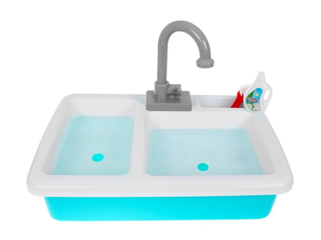 - blue sink approx. 39 cm x 27 cm x 9 cm, - 2 small blades approx. 9.5 cm x 2.5 cm, - a large knife approx. 13 cm x 2.5 cm, - 2 forks about 10 cm x 3 cm, - brush approx. 10.5 cm x 5 cm, - battery approx. 14 cm x 8 cm x 5.5 cm, - 2 small plates about 9 cm, - 2 large plates approx. 11 cm, - 2 cups approx. 6.5 cm x 4.5 cm, - 2 small cups approx. 4.5 cm x 6 cm, - Tap approx. 17.5 cm x 2 cm, - rack for dishes approx. 24 cm x 14.5 cm x 7.5 cm, - detergent is fine. 8 cm x 5 cm, - instruction. | |