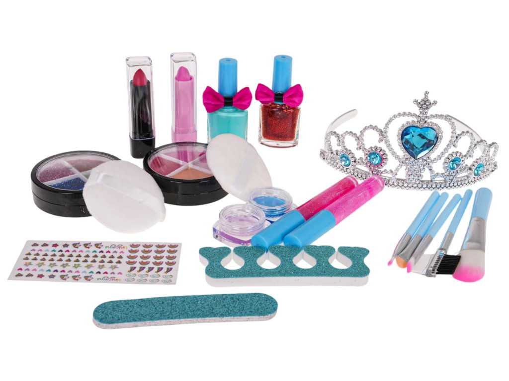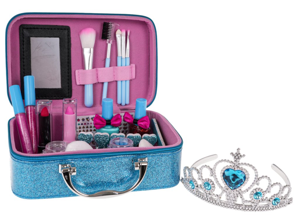 - a suitcase with a mirror inside, - 4 x eye shadows in a resealable round box, - 4 x glitter eye shadows in a resealable round box, - 4 x brush, - comb with eyelash brush, - 2 x lip gloss, - 2 x cotton pad, - 2 x lipstick, - 2 x lipstick, - nail sticker, - 2x nail polish, - separator, - nail file, - 2 x lip glosses with applicator, - tiara. |