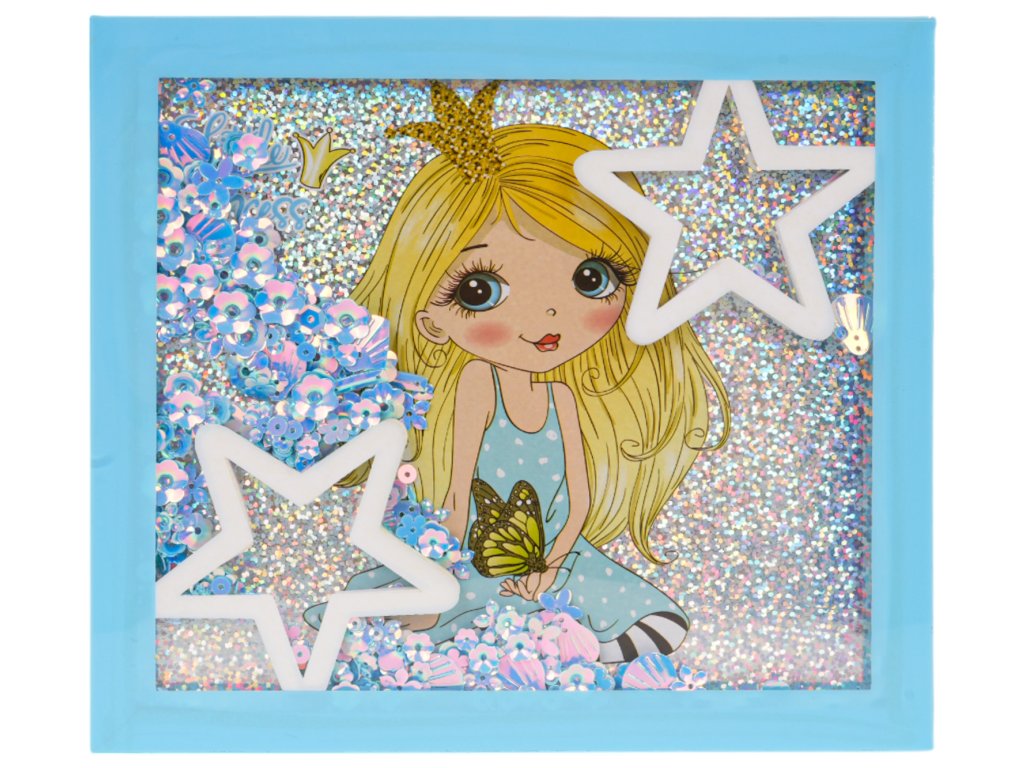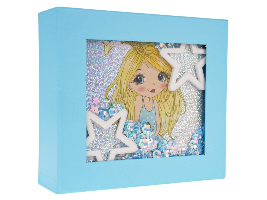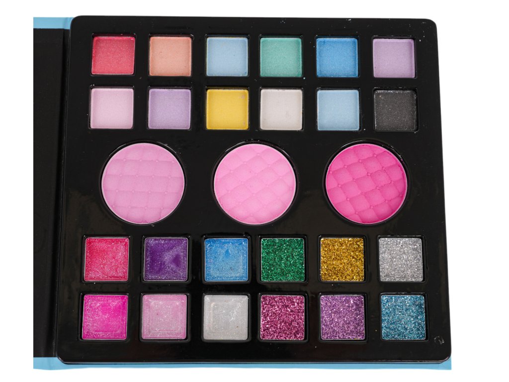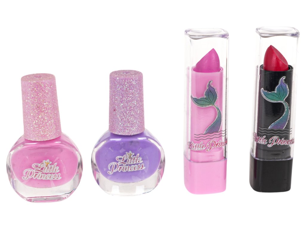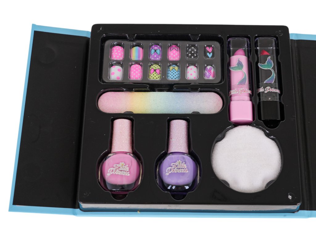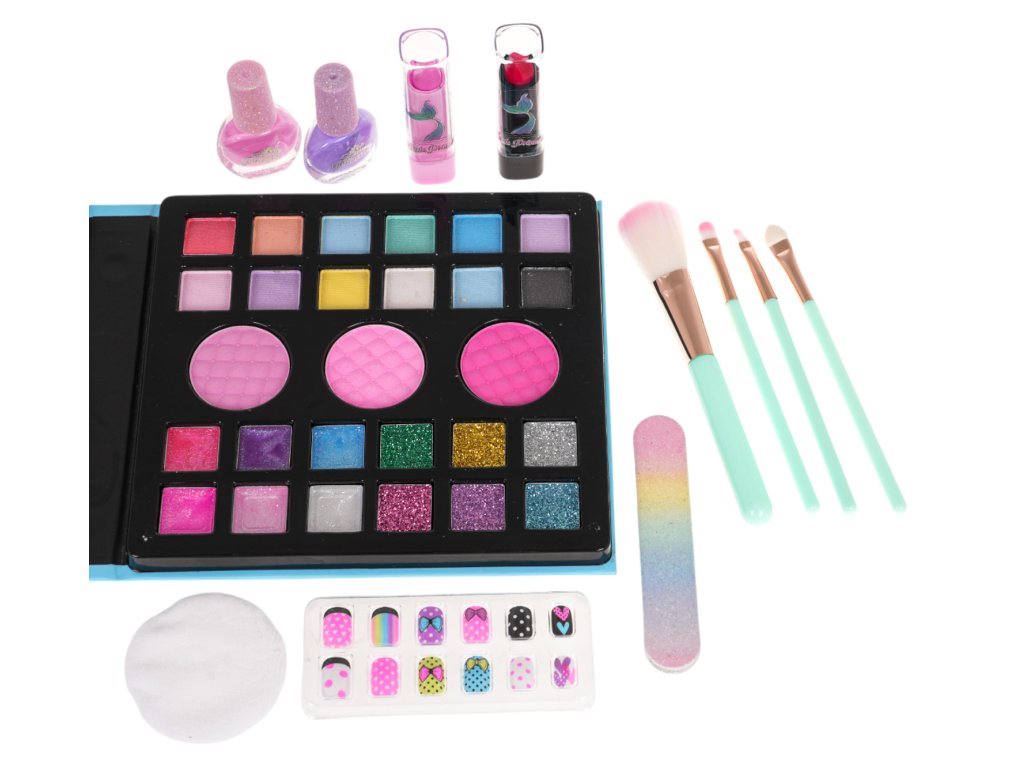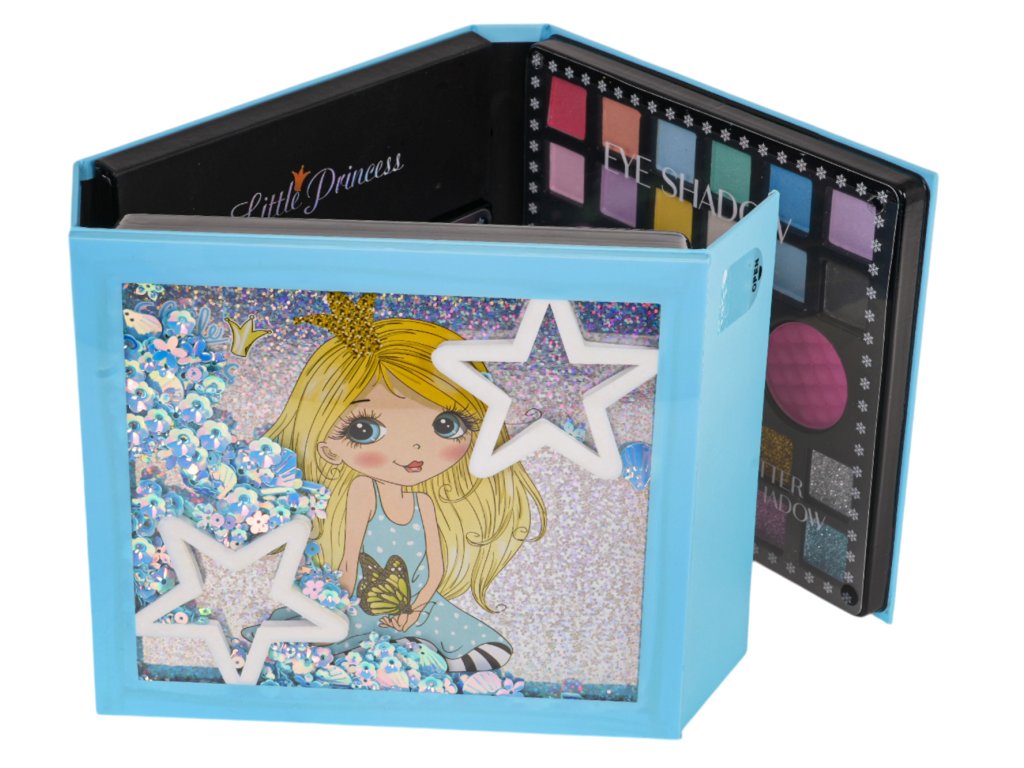 - an opening box beautifully decorated with a drawing of a princess, stars and sequins, - a palette with eye shadows and lipsticks in various colours (15 eye shadows and 12 lipsticks), - 2x nail polish, - nail file, - 12 x nail tips, - 2 x lipstick, - 4 x brush, - cotton pad for removing makeup, - cosmetic mirror. |