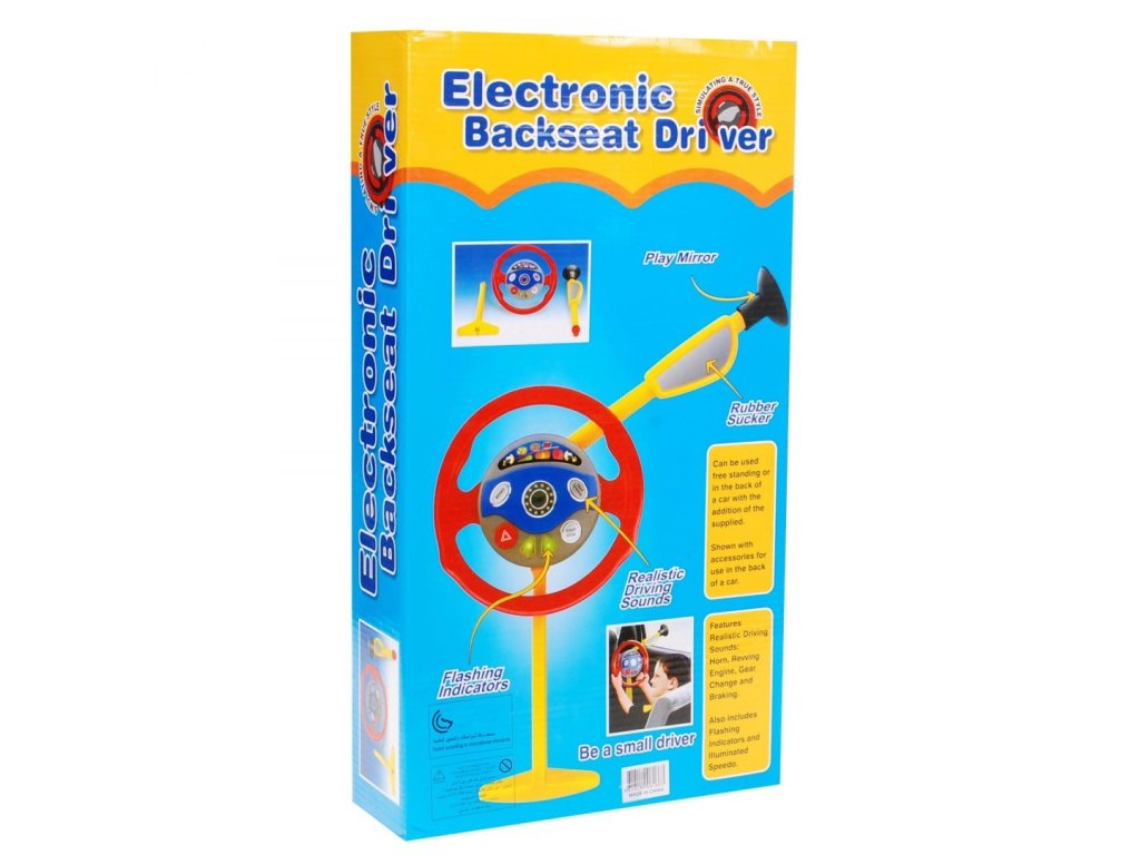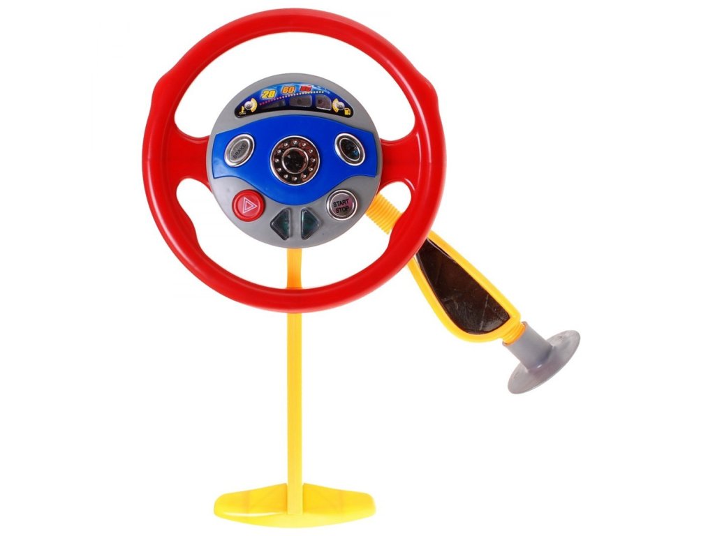 | - start / stop lights the car's engine and starts the drive, - gear change - change of speed - 3-step scale, each time the button is pressed, the toddler goes 20, 60, 80 km per hour, - break - brake (allows you to reduce speed), - horn in the middle of the steering wheel, - position lights (flashing), The toy is additionally equipped with a safe mirror, stand and suction cup.The steering wheel can be held in the handles, rested firmly on the support set between the legs, or attached to the window using a suction cup. |