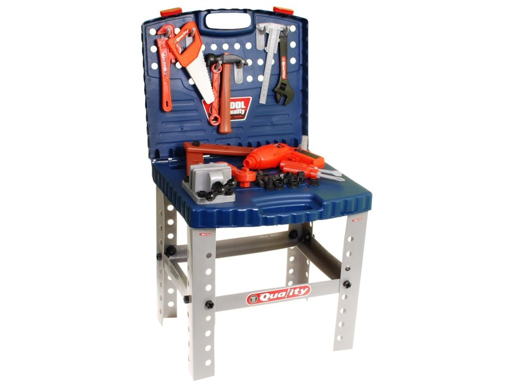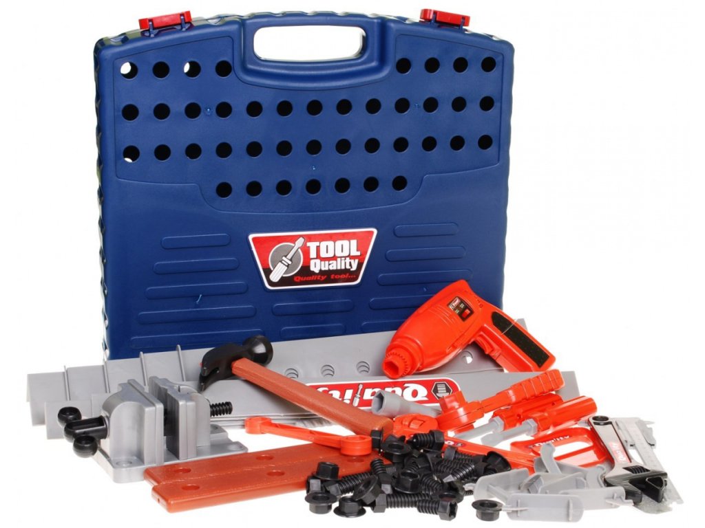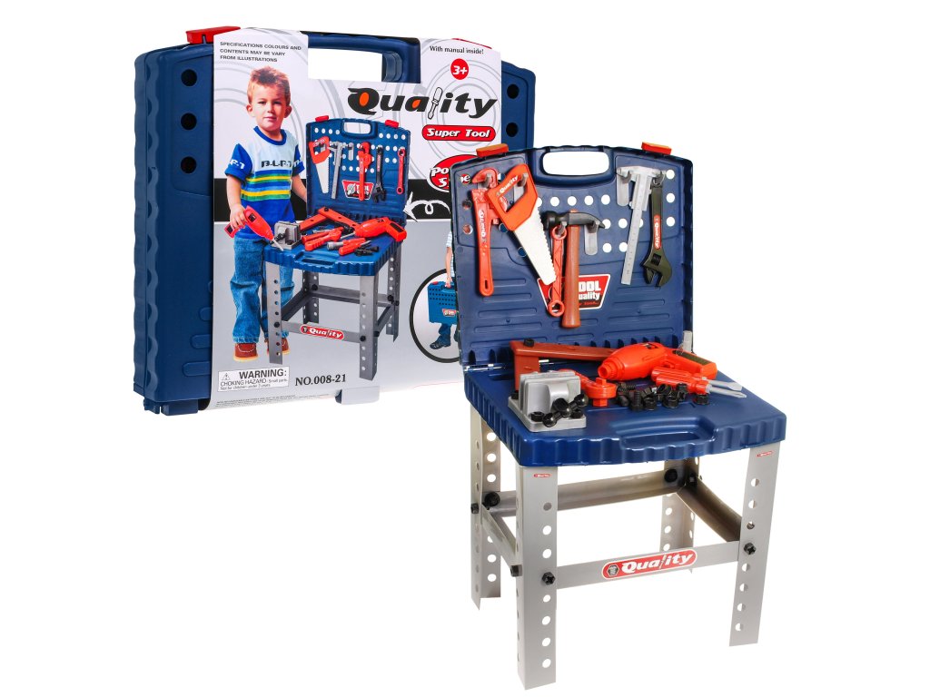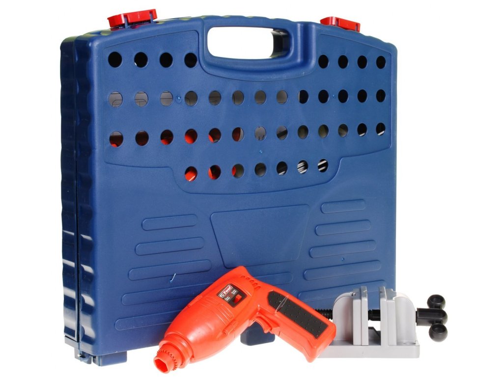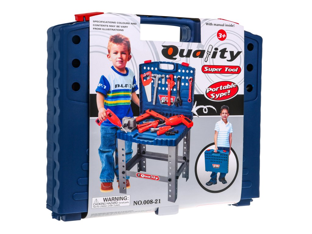 - cordless drill - battery screwdriver (with left-right rotation control and exchangeable 3 tips), - hammer, - keys (ring, French, socket with rattle, frog), - caliper, - vise, - saw, - 2 screwdrivers with interchangeable tips, - 2 boards with holes, - 16 nuts, - 22 screws of various length, - hooks for hanging tools in a stationary workshop, - practical suitcase to accommodate everything. |