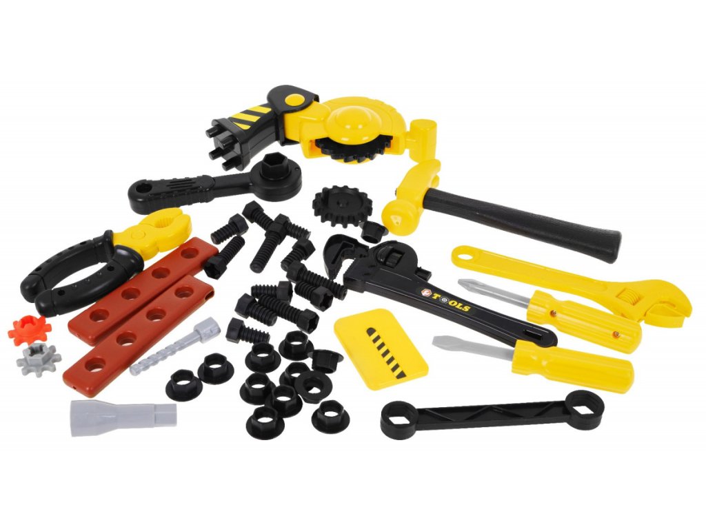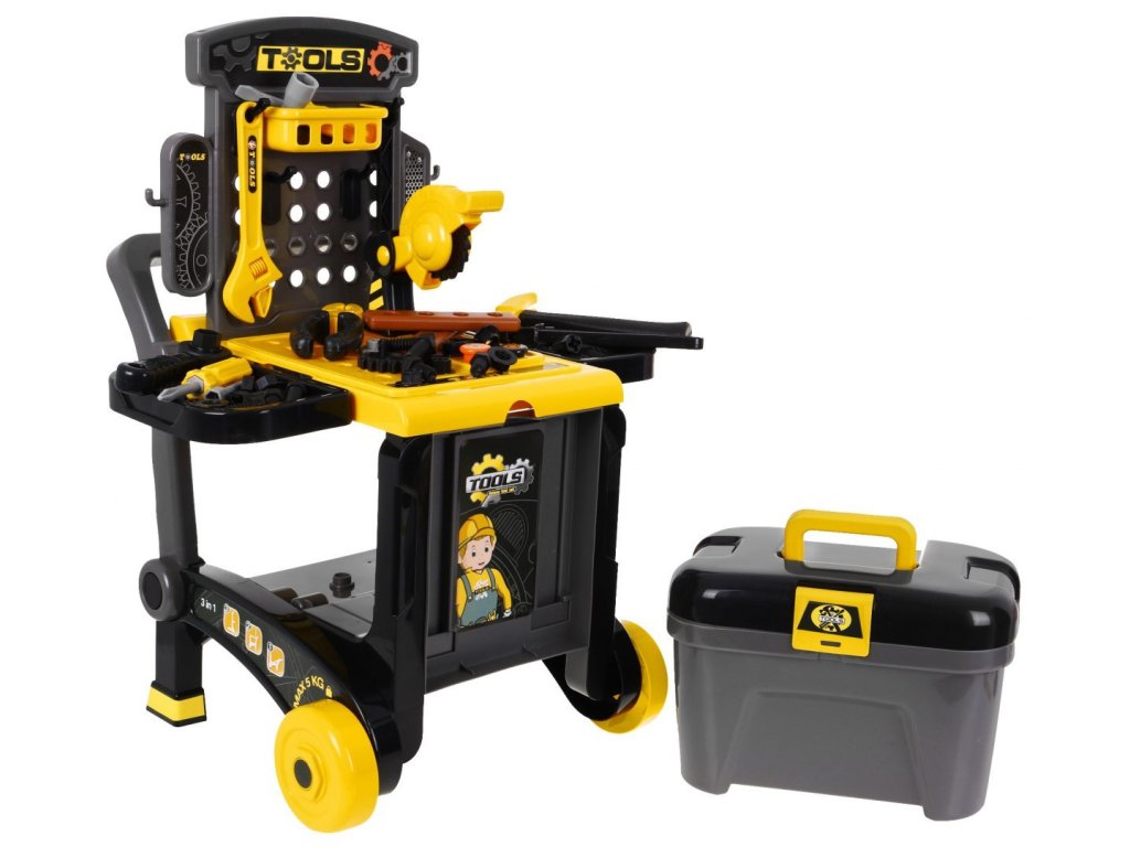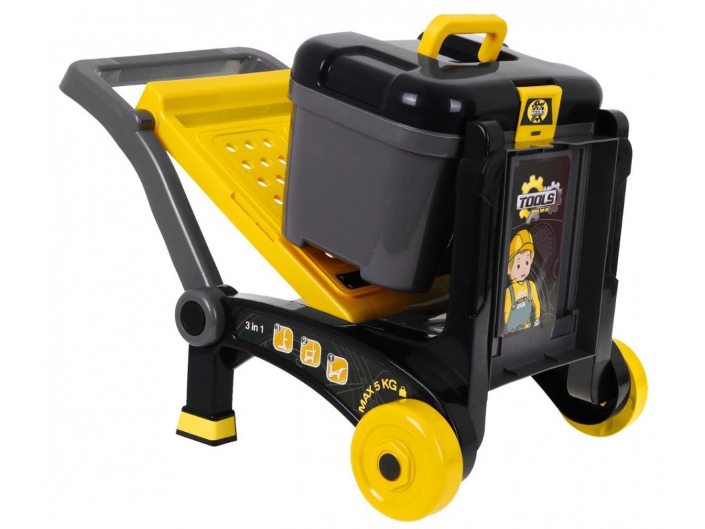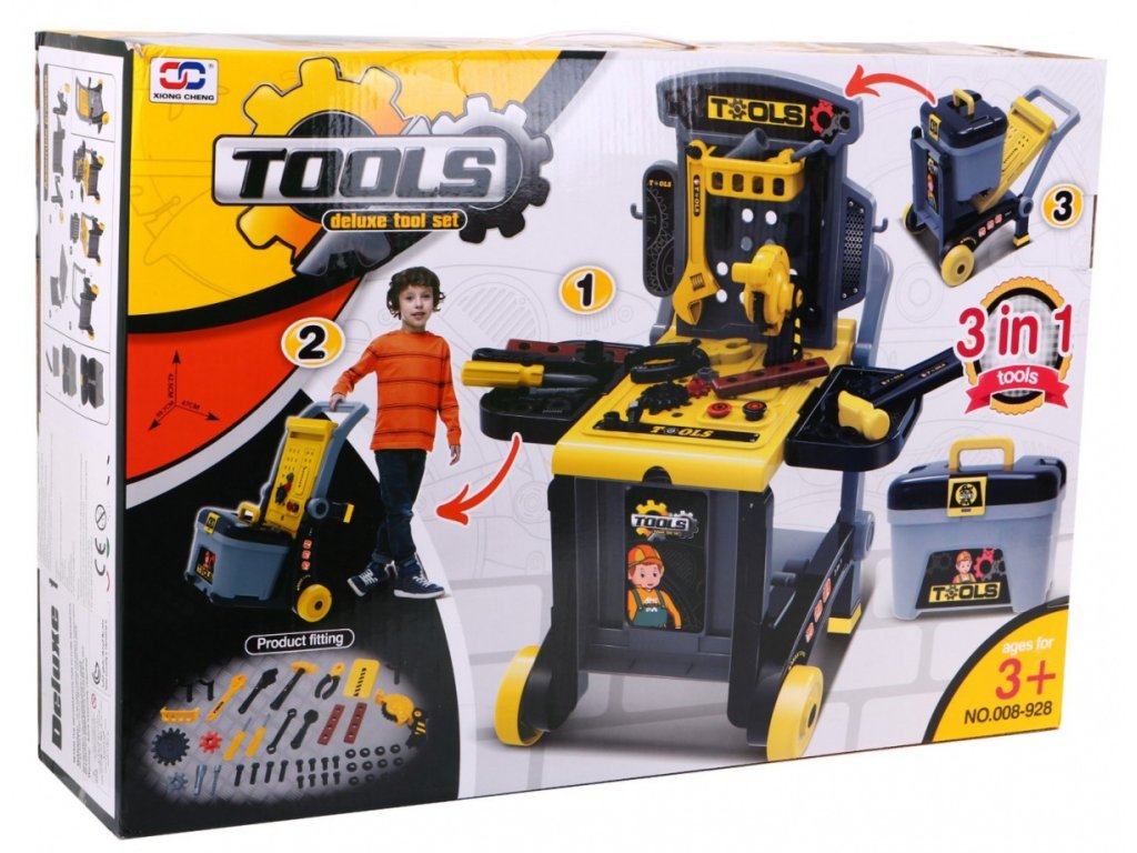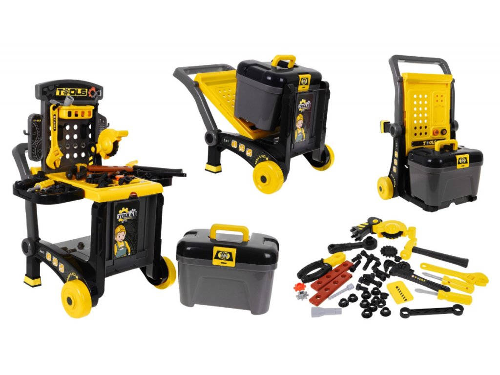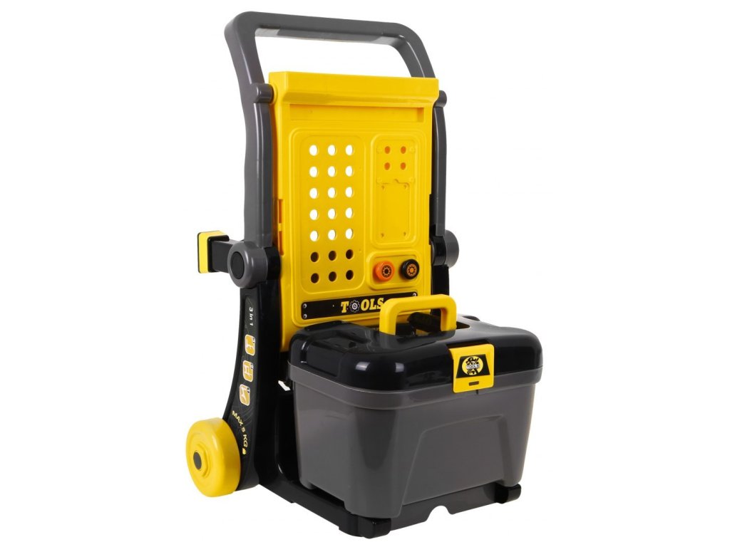 -workshop on wheels transformed into 2 different trolleys, - a suitcase for tools, - tools (pliers, hammer, screwdrivers), - various keys, - vise, - bolts and nuts, - saw, - stickers for decorating the workshop. | |