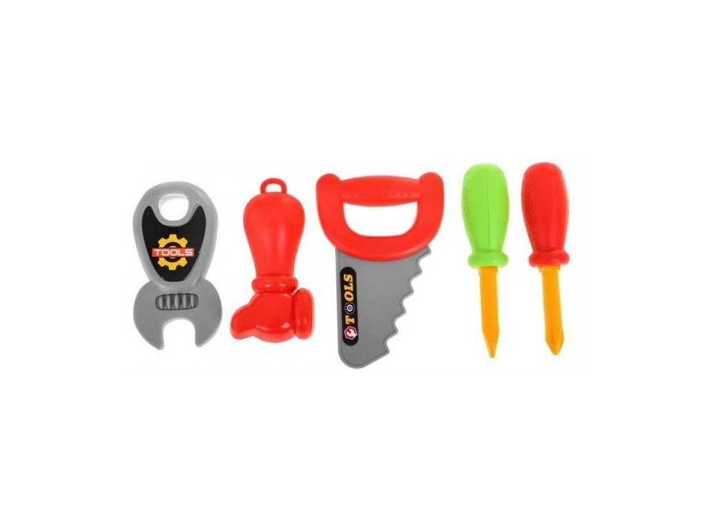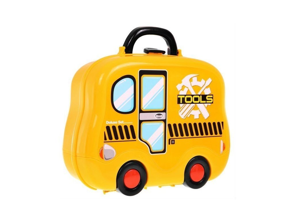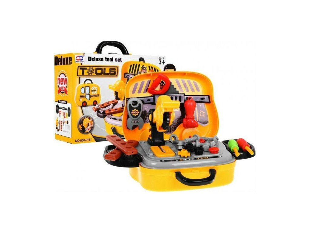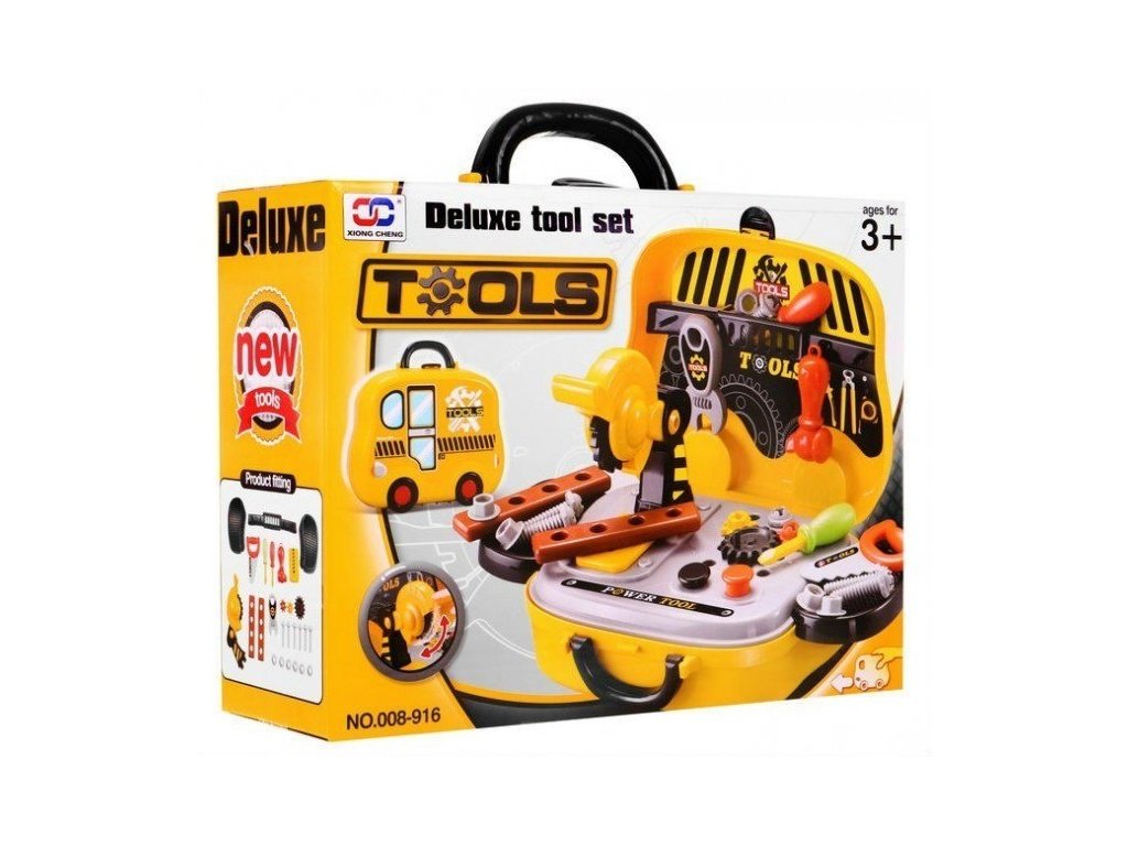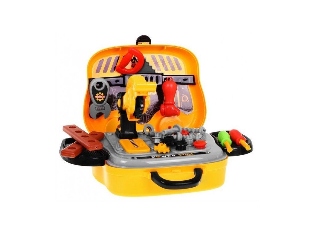 - portable fold-out suitcase - car on wheels, - top with the possibility of screwing screws, - 2 side shelves, - a tool hanger, - Circular Saw, - handball, - 2 screwdrivers, - hammer, - wrench, - 3 gears (1 bigger and 2 smaller), - 2 connectors, - 6 overlays, - 6 screws, - colorful packaging, ideal for a gift. | |