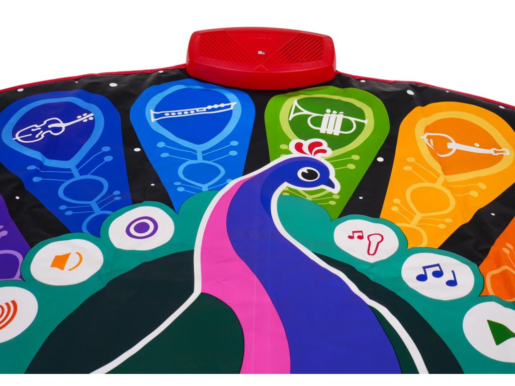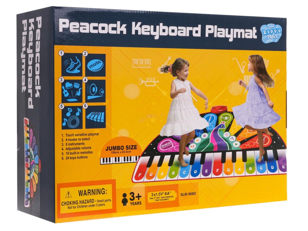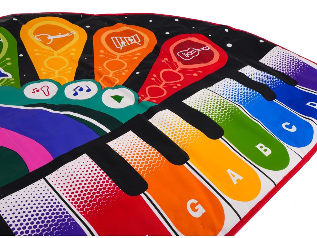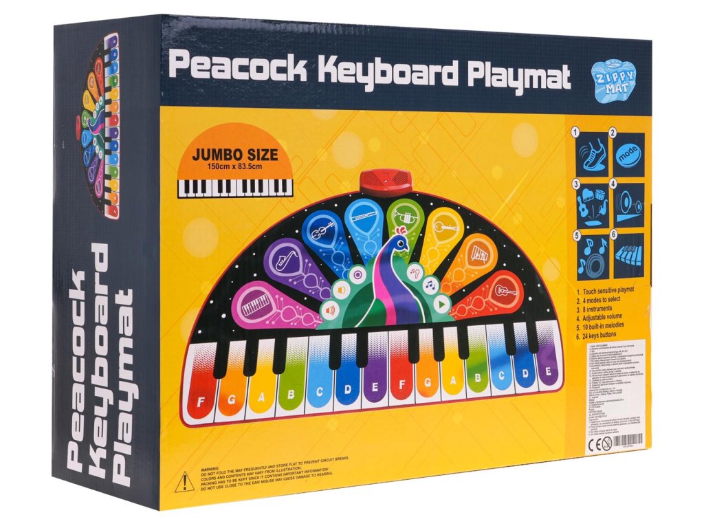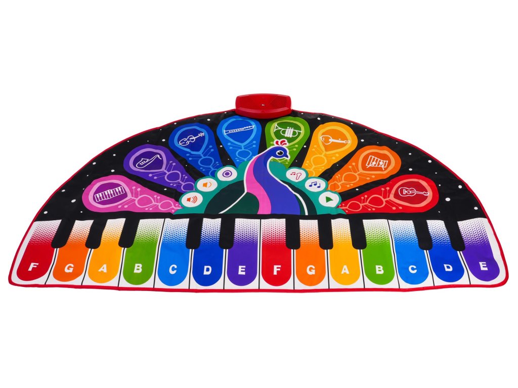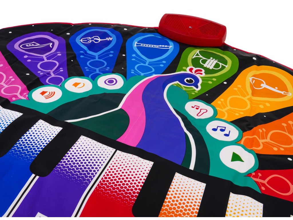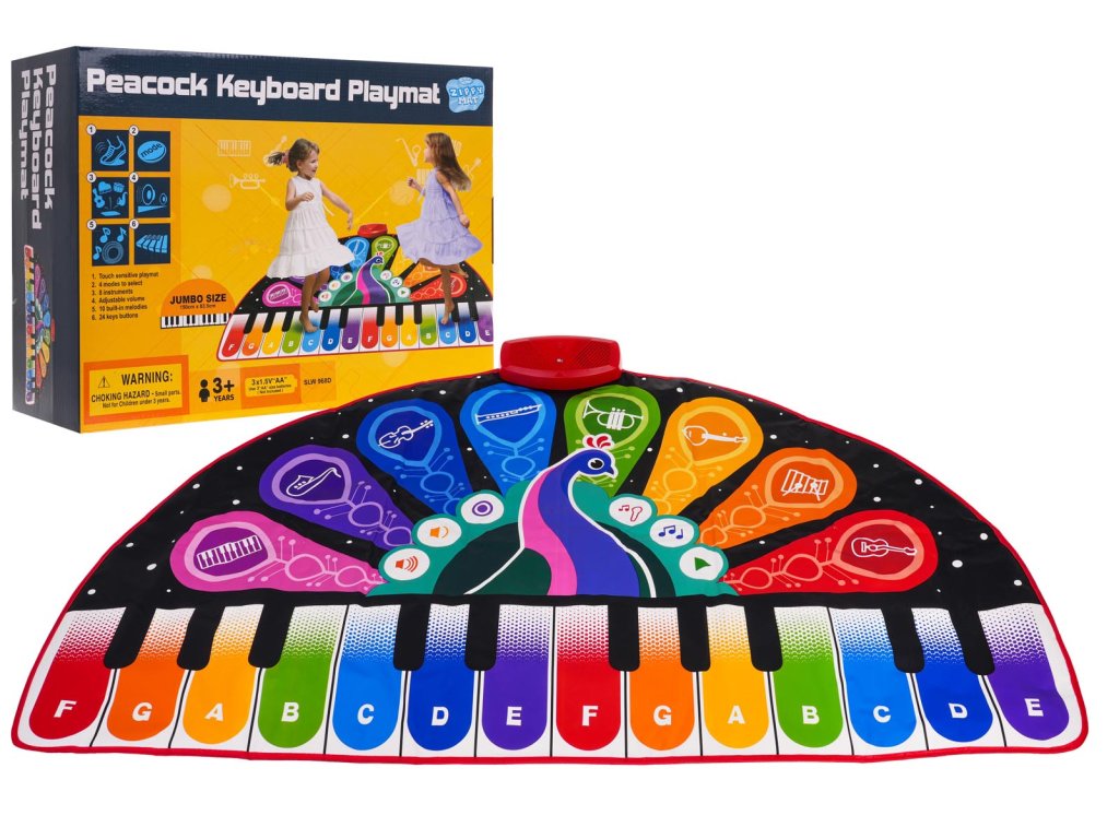 Large musical mat in the shape of a keyboard for children from 3 years of age who like movement, music and great fun. The mat develops musical abilities, hand-eye coordination and sensory abilities through play. It introduces the child to the magical world of music using colors. At the bottom of the mat there is a touch keyboard with 24 colored keys. Above, a colorful peacock, on each of its eight feathers, has a button with a different musical instrument: piano, vibraphone, oboe, trumpet, saxophone, banjo, violin and guitar. The mat has 4 modes to choose from: recording, playback of recording, demo version, playback of 10 built-in melodies. We can also adjust its volume. There is a speaker at the very top of the mat. The mat is powered by 3 x AA 1.5V batteries (not included). The mat has a non-slip structure, it is made of safe materials. The surface of the mat is soft and durable, dirt and stains can be easily wiped off with a cloth.