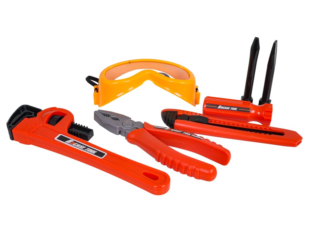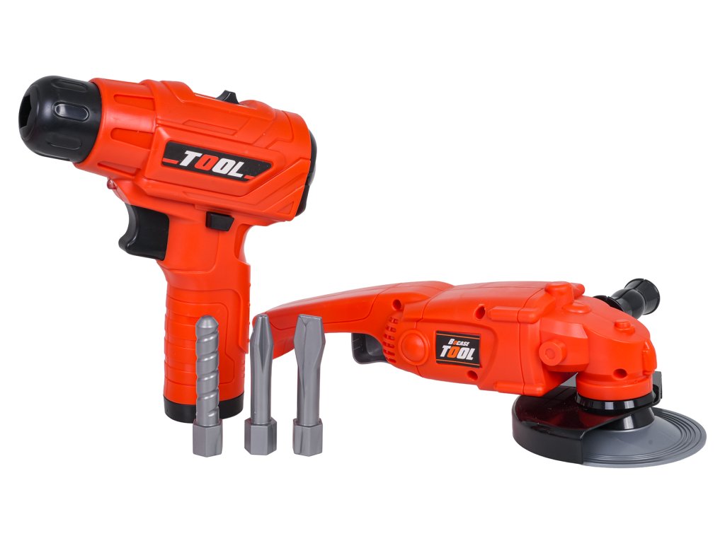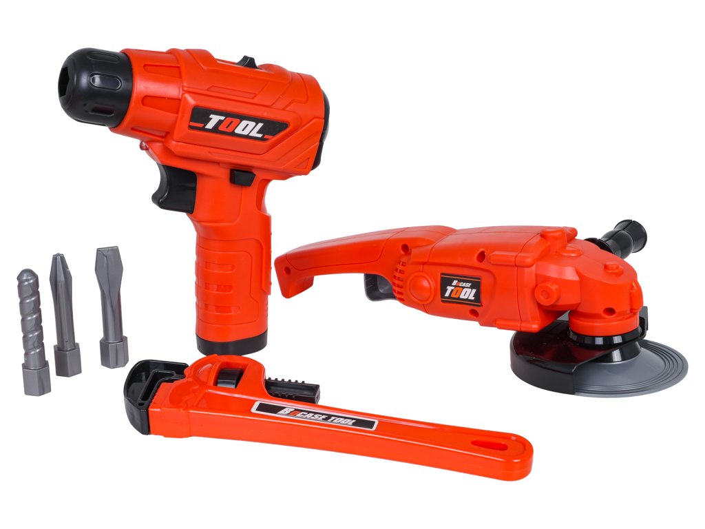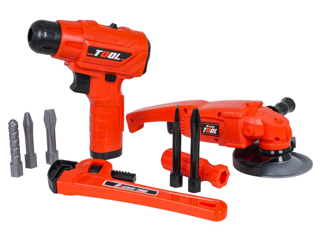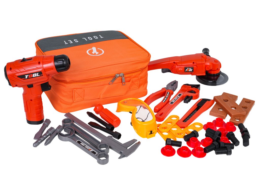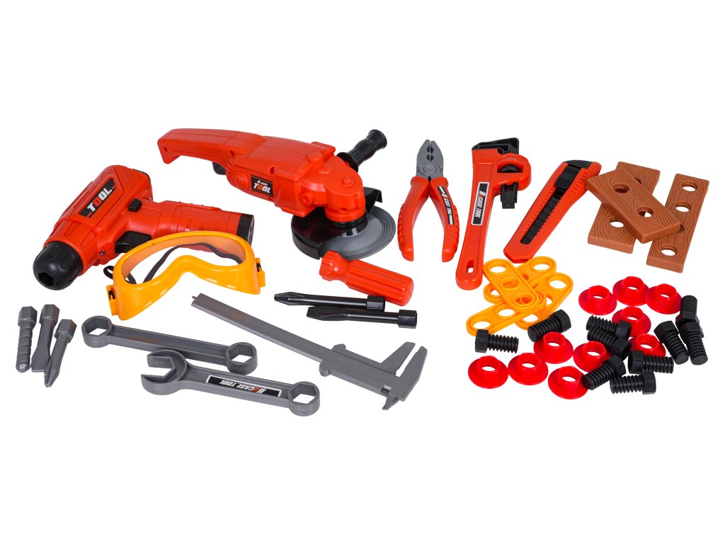 A well-equipped tool kit with a bag for children aged three and up. The set is made of high-quality plastic, with attention to detail. These toy tools are completely safe for children. The set consists of 42 pieces: a tool bag, a grinder, a drill/driver, an adjustable wrench, open-end and ring wrenches, a knife, pliers, a caliper, safety glasses, as well as screws, screwdriving tools, and replacement bits. The drill/driver is powered by 2 x AA 1.5V batteries (batteries not included). Features: - for children from three years of age, - made of the best quality materials, - attention to detail, - a convenient bag that holds all the tools, - grinder with a rotating disc (manually), - a battery-powered drill/driver with the sounds of the machine operating, screwing and unscrewing, and equipped with light effects in the form of a diode on the front. |