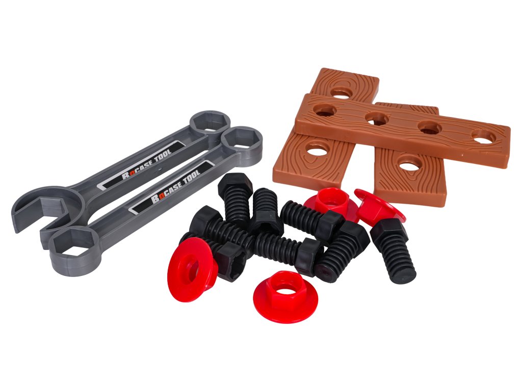 - tool bag approx. 22.5 cm x 16 cm x 5 cm, - caliper approx. 20 cm x 5.5 cm, - pliers approx. 16 cm x 5.5 cm, - hammer approx. 21.5 cm x 8.5 cm, - wrench approx. 17.5 cm x 6 cm, - screwdriver handle approx. 8 cm long, - replaceable bit approx. 9 cm long, - key approx. 14 cm long, - screw approx. 3.3 cm x 2 cm, - overlay approx. 3 cm in diameter, - dummy pieces of wood from 9 cm to 12 cm, - packaging approx. 23.2 cm x 17.2 cm x 6.2 cm |
