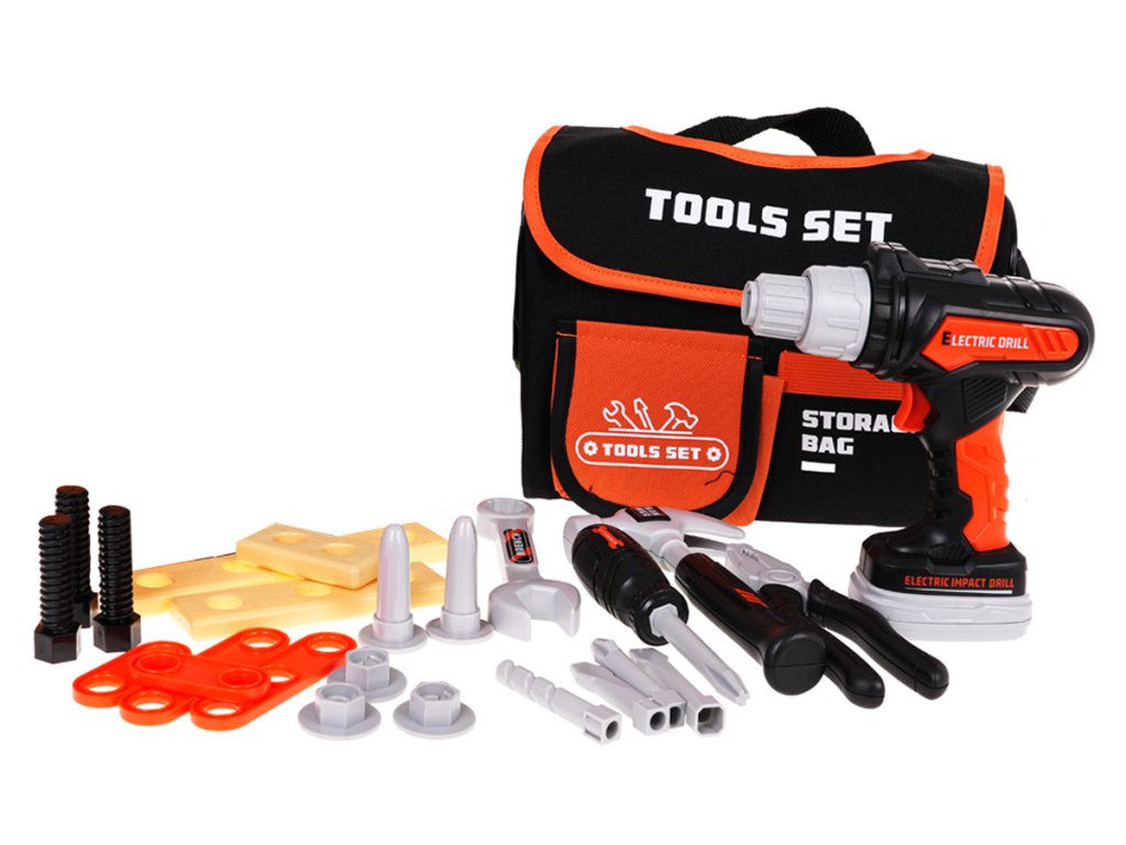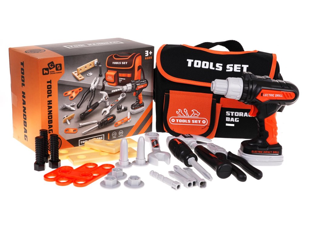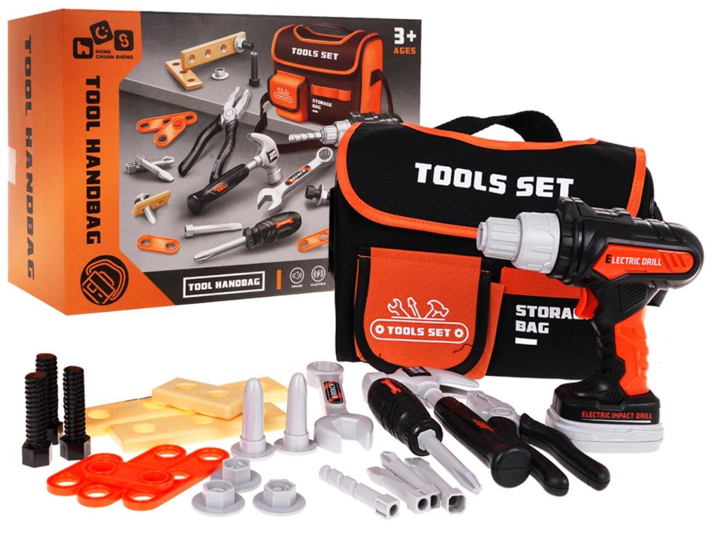 A richly equipped tool set with a tool bag and an interactive drill-driver for children from 3 years of age. The set is made of the best quality plastic. The tool bag has a strap, a handle for carrying, a main compartment with a Velcro closure, a small pocket on the front and a stitching that will hold a tool. The drill-driver is powered by 2 x AA 1.5 V batteries (included), screws and unscrews, additionally has a removable battery like in a real drill and replaceable bits. The set includes as many as 25 elements, in addition to the tool bag and the drill-driver we also have: pliers, a flat-opening wrench, a hammer, a screwdriver, screws, sockets, expansion bolts and wood for screwing.