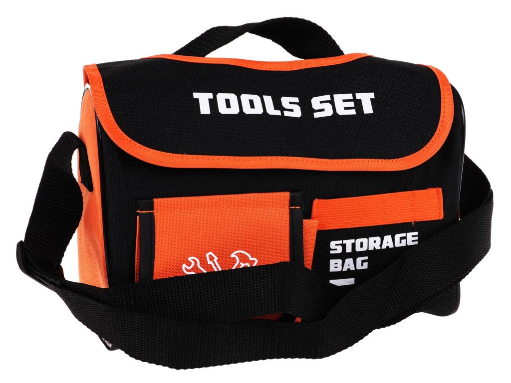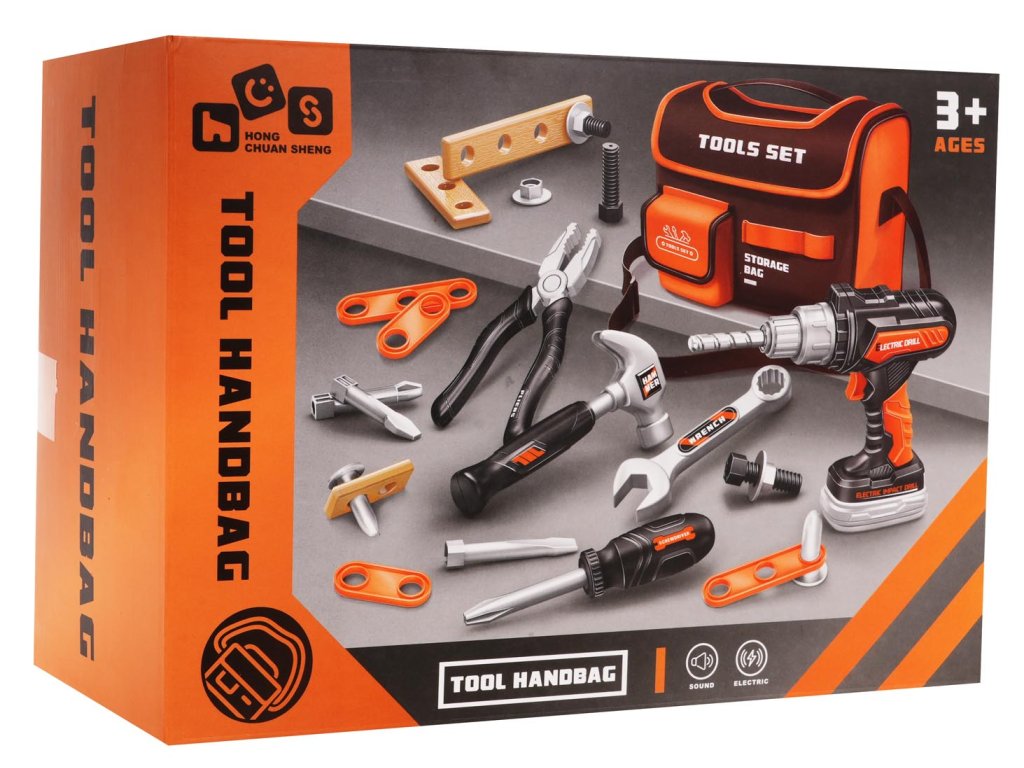 - tool bag approx. 23.5 cm x 16 cm x 10.5 cm, - drill-driver approx. 15 cm x 15 cm x 5 cm, - replaceable bits: flat, Phillips, drill approx. 6.5 cm long, - replaceable screwdriver tips approx. 8 cm long, - screwdriver socket approx. 8 cm x 2.5 cm, - hammer approx. 17 cm x 8 cm x 2 cm, - open-end wrench approx. 14 cm x 4 cm x 1.5 cm, - pliers approx. 15 cm x 5 cm x 1.5 cm, - smaller screw-in elements approx. 6 cm x 2.5 cm, - larger screw-in elements approx. 9 cm x 2.5 cm, - various sizes of wood for screwing in, approx. 6.5 cm long, approx. 12 cm and approx. 16 cm, - screw approx. 5.5 cm long, - caps approx. 3 cm in diameter, - expansion bolts approx. 5 cm x 3 cm, - packaging approx. 23.5 cm x 17.5 cm x 12.5 cm. |