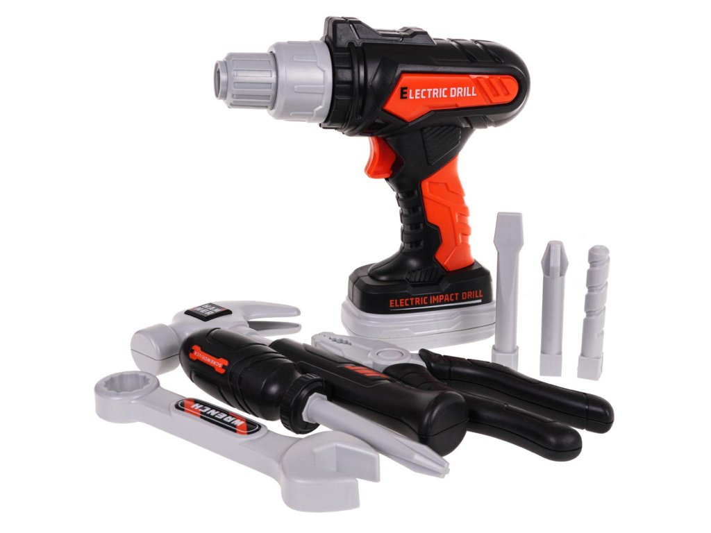 - tool bag, - drill-driver, - replaceable drill bits: flat, cross, drill, - screwdriver attachment, - replaceable screwdriver tips, - hammer, - open-end wrench, - pliers, - 2 smaller elements for screwing, - 2 larger screw-in elements, - 3 x pieces of wood of different sizes for screwing, - 3 screws, - 3 attachments, - 2 expansion bolts. |