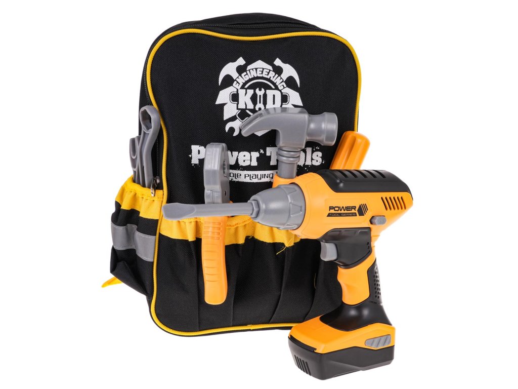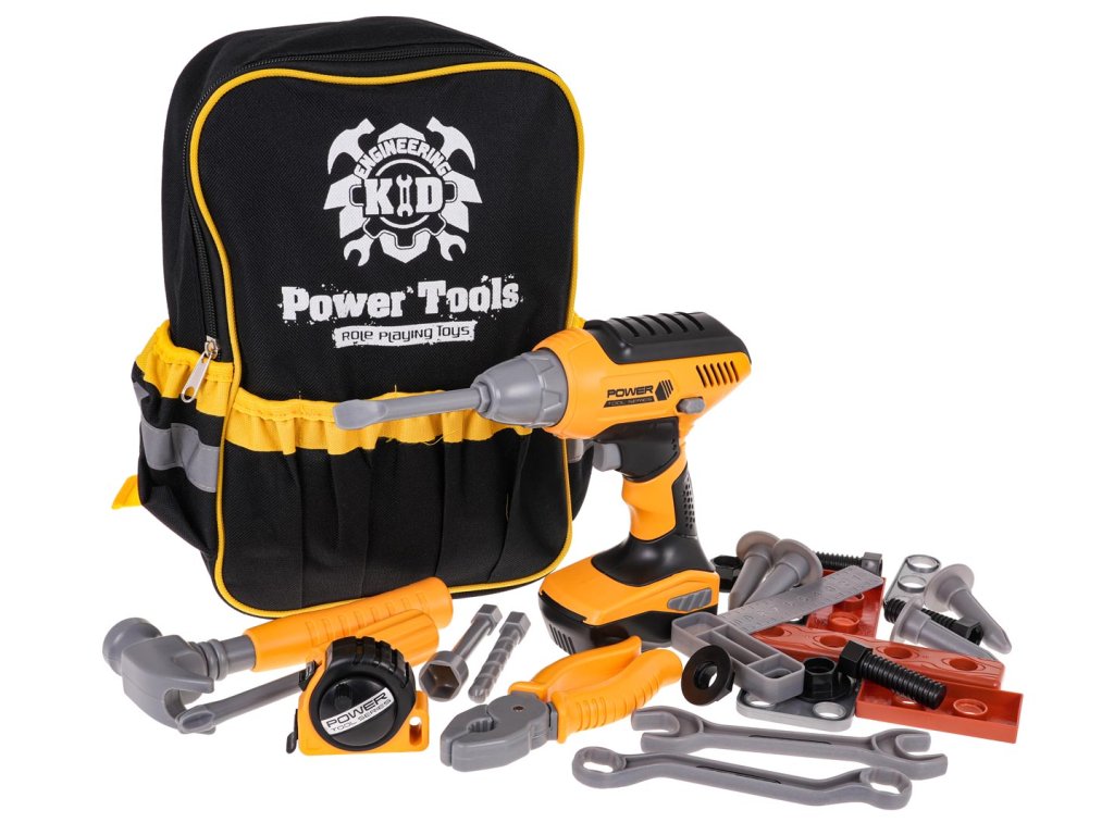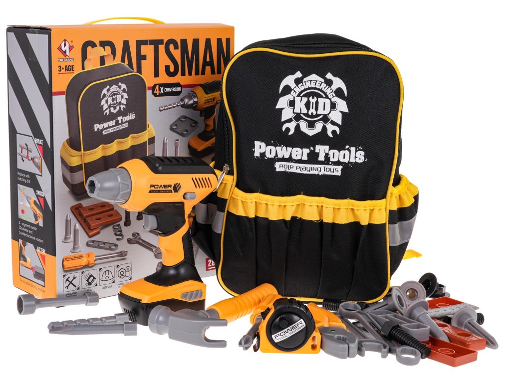 A richly equipped tool set with a tool backpack and an interactive drill-driver for children from 3 years of age. The set is made of the best quality plastic. The tool backpack has a main compartment with a zipper, small pockets on the sides and stitching that will hold tools. The drill-driver is powered by 3 x AAA 1.5V batteries (not included) screws and unscrews, additionally has a removable battery like in a real drill, replaceable bits and lights up during operation. The set includes as many as 28 elements, in addition to the backpack and drill-driver we also have: a meter, hammer, pliers, a wrench, an angle, screws, dowels, elements for screwing.