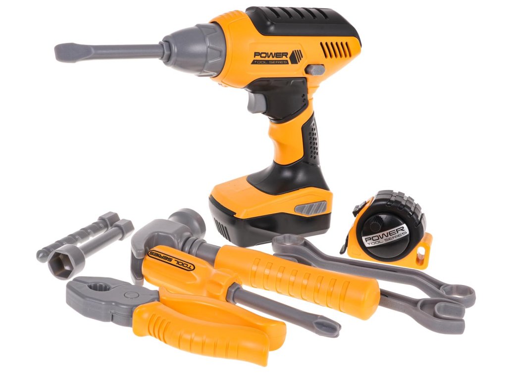 - tool backpack, - drill-driver, - interchangeable bits: flat, cross, drill, socket, - hammer, - 2nd key, - pliers, - angle bracket, - screwdriver attachment, - 3 sticks for screwing in screws, - 4 different elements for screwing screws, - 4 expansion bolts, - 3 screws, - 3 overlays. |