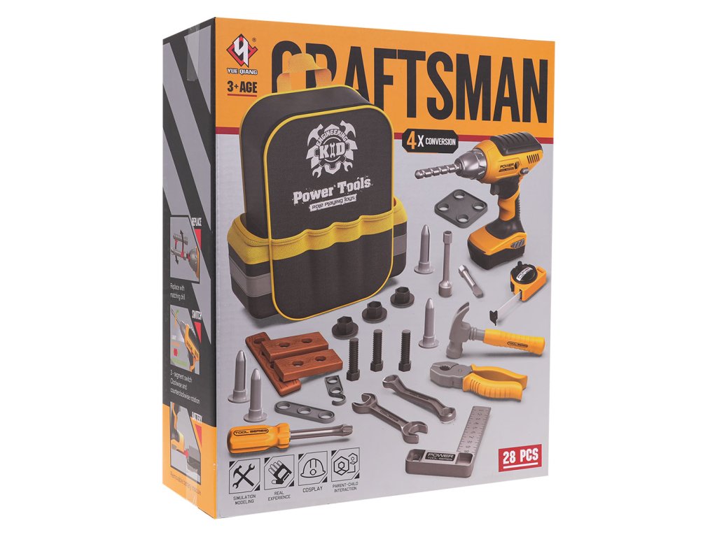 - suitable for children over 3 years of age, - made of the best quality materials, - professional workmanship with attention to detail, - the tool backpack has a main compartment with a zipper, small pockets on the sides and stitching that will hold tools, - the drill driver is battery-powered, makes sounds, screws and unscrews, lights up while working, screws and unscrews, and has replaceable bits and a removable battery, - rich equipment of up to 28 set elements. |