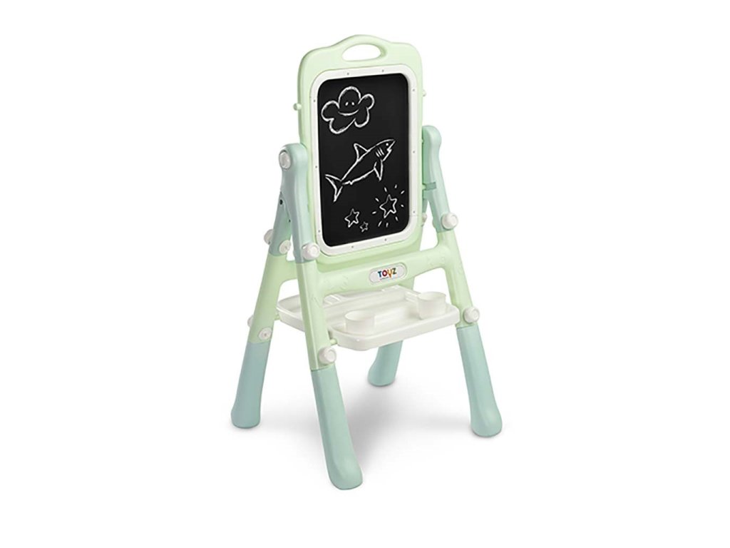 Oboustranná edukační tabule Toyz. Hraním si děti rozvíjí zrakovo-pohybovou koordinaci, zdokonalují manipulaci s předměty, rozvíjí představivost a trénují paměť.Tabuli lze využít jako klasickou tabuli pro psaní křídami nebo fixy, a tabuli magnetickou. Tabule je výborně vybavená a má vše, co dítě může potřebovat.