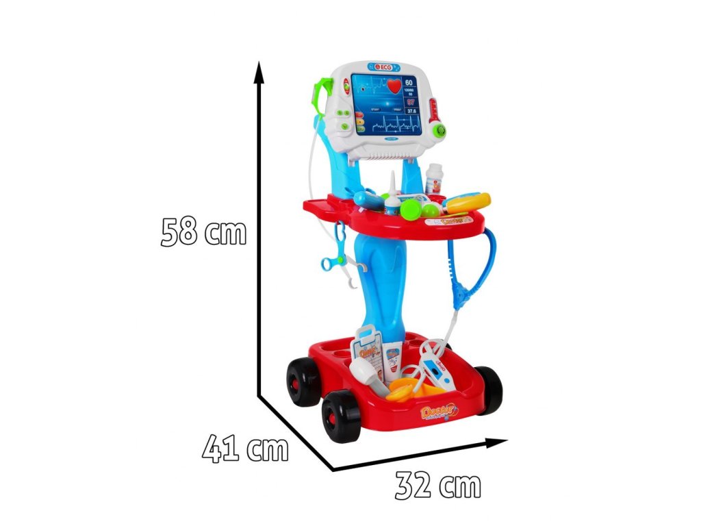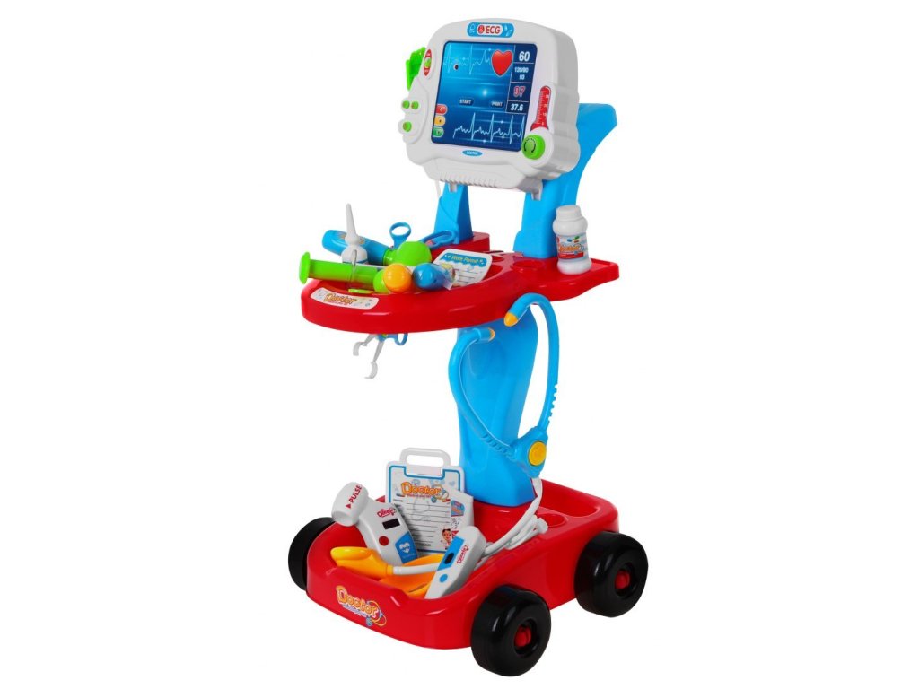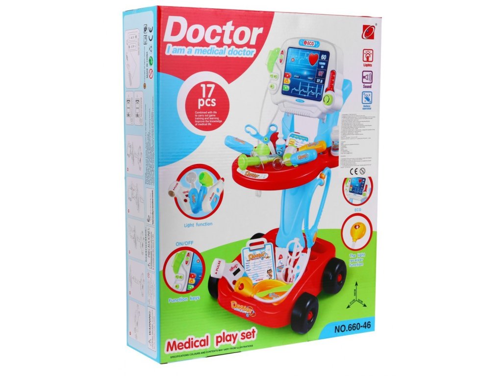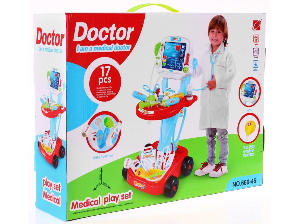 Equipment of the set: - accessory trolley with shelves and an EKG device, - a stethoscope that gives the sound of a beating heart and a heart on it when it touches the body, - a set of colored stickers, - dental mirror with flashing lights (about 14 cm x 3.5 cm), - otolaryngology otoscope with a lamp for peeping into the ears and nose for the patient (about 13 cm x 6.5 cm), - a thermometer with an illuminated result and adjustable temperature (about 11.5 cm x 3 cm), - syringe (about 14 cm x 6.5 cm), - a heart rate monitor with a backlit result (about 12 cm x 5 cm), - neurological hammer (about 13 cm x 6.5 cm), - glasses, - a scalpel (about 12 cm x 2.5 cm), - 2 x scissors (about 12 cm x 7 cm), - prescription formula (about 12.5 cm x 9 cm), - identification badge (about 7.5 cm x 5 cm), - medicine cage (about 12 cm x 7.5 cm x 2 cm), - imitation container with medicines (about 6.5 cm x 3.5 cm), - imitation eye drops (about 9 cm x 2.5 cm), - paste imitation (about 9 cm x 4 cm), - drip. | |