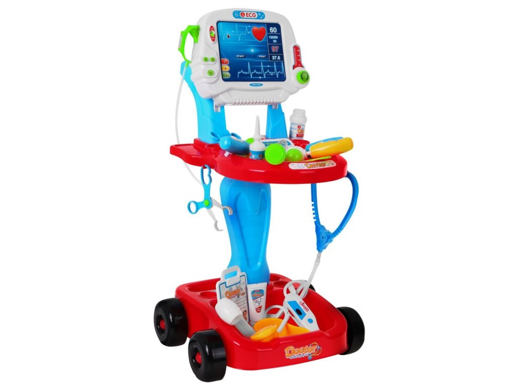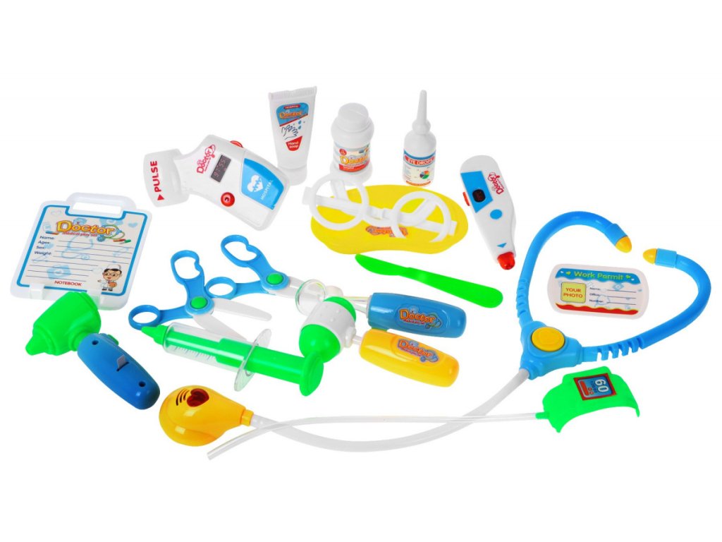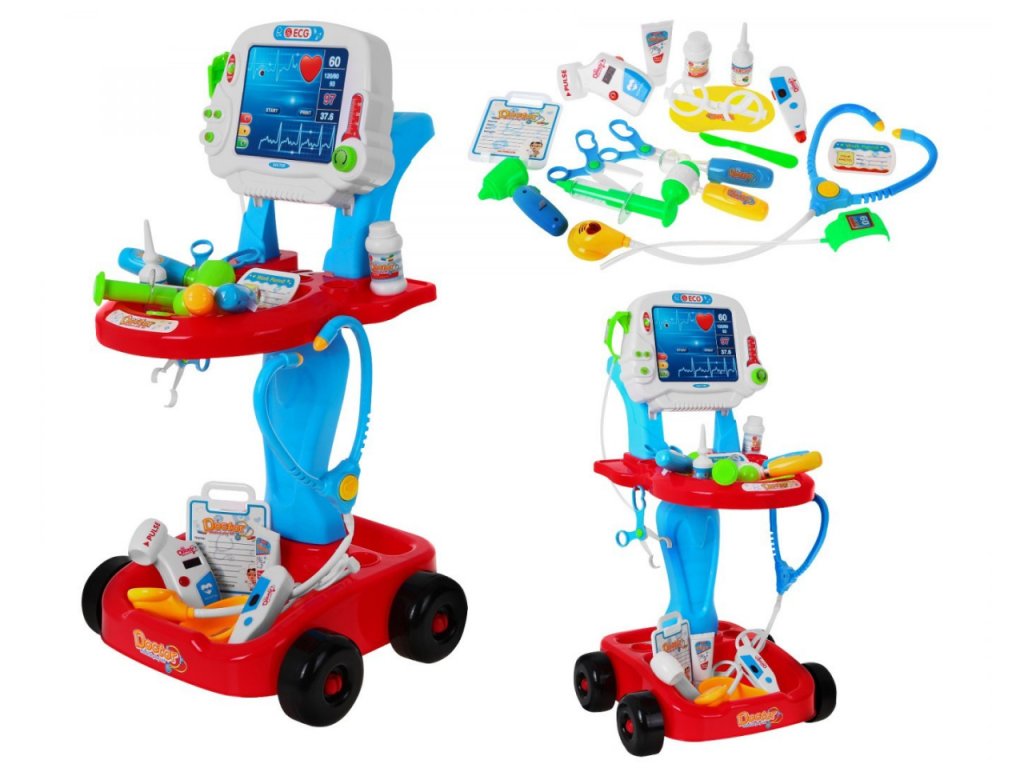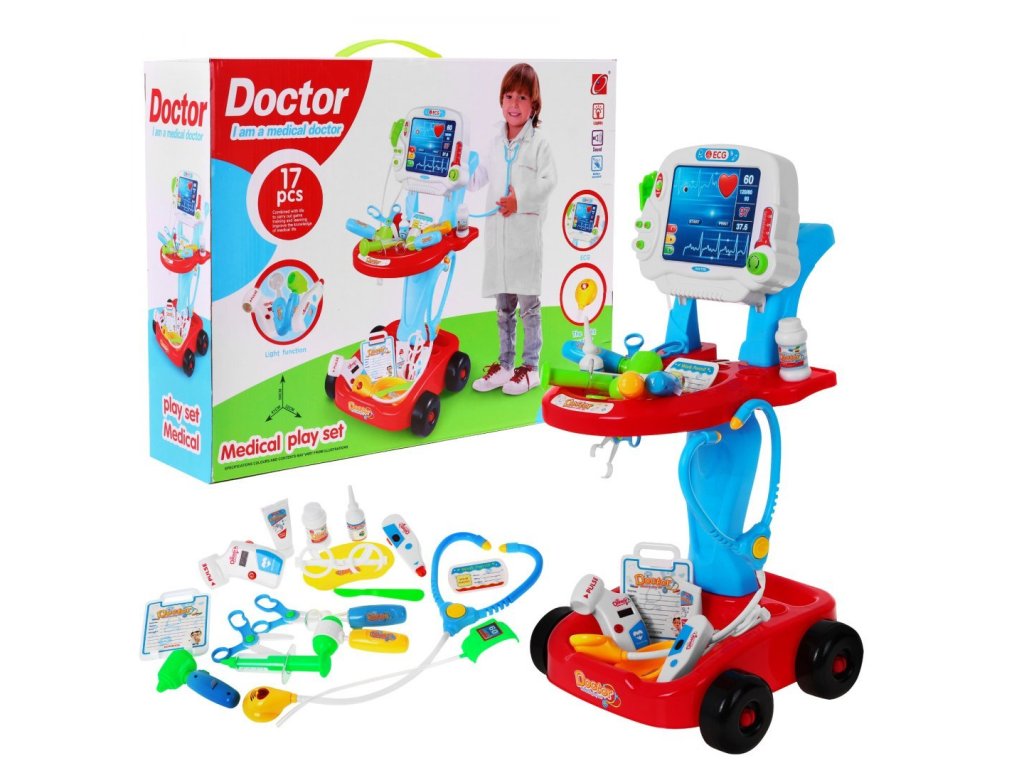 Equipment of the set: - accessory trolley with shelves and an EKG device, - a stethoscope that gives the sound of a beating heart and a heart on it when it touches the body, - a set of colored stickers, - dental mirror with flashing lights (about 14 cm x 3.5 cm), - otolaryngology otoscope with a lamp for peeping into the ears and nose for the patient (about 13 cm x 6.5 cm), - a thermometer with an illuminated result and adjustable temperature (about 11.5 cm x 3 cm), - syringe (about 14 cm x 6.5 cm), - a heart rate monitor with a backlit result (about 12 cm x 5 cm), - neurological hammer (about 13 cm x 6.5 cm), - glasses, - a scalpel (about 12 cm x 2.5 cm), - 2 x scissors (about 12 cm x 7 cm), - prescription formula (about 12.5 cm x 9 cm), - identification badge (about 7.5 cm x 5 cm), - medicine cage (about 12 cm x 7.5 cm x 2 cm), - imitation container with medicines (about 6.5 cm x 3.5 cm), - imitation eye drops (about 9 cm x 2.5 cm), - paste imitation (about 9 cm x 4 cm), - drip. | |