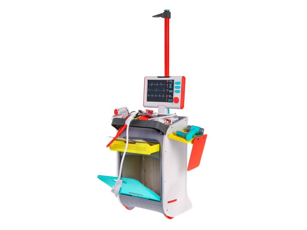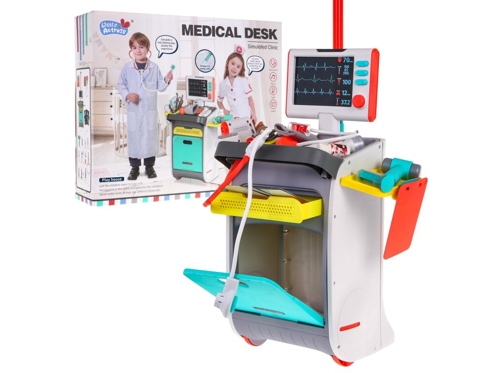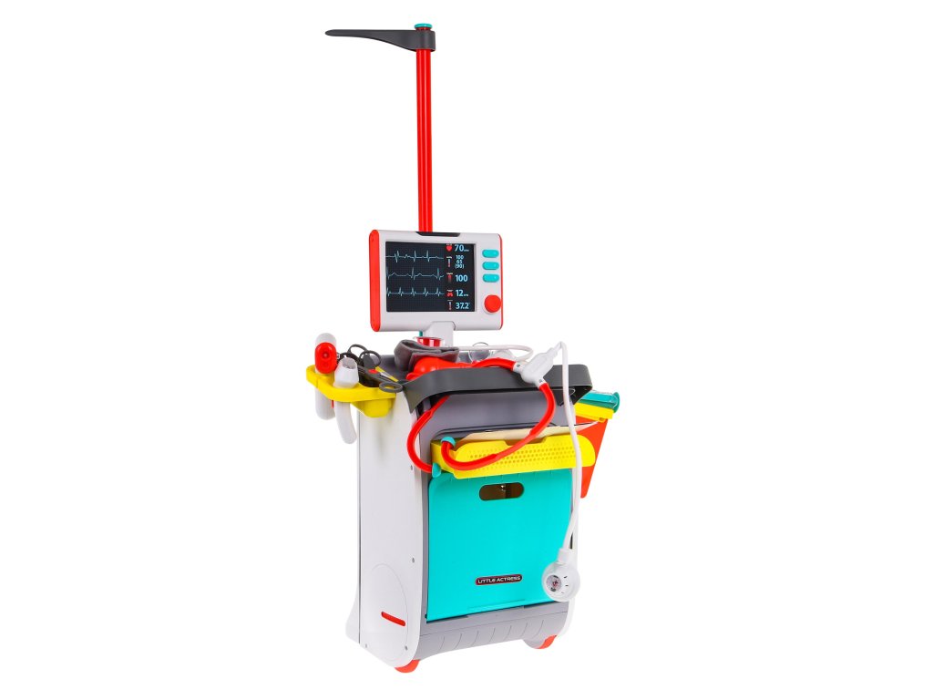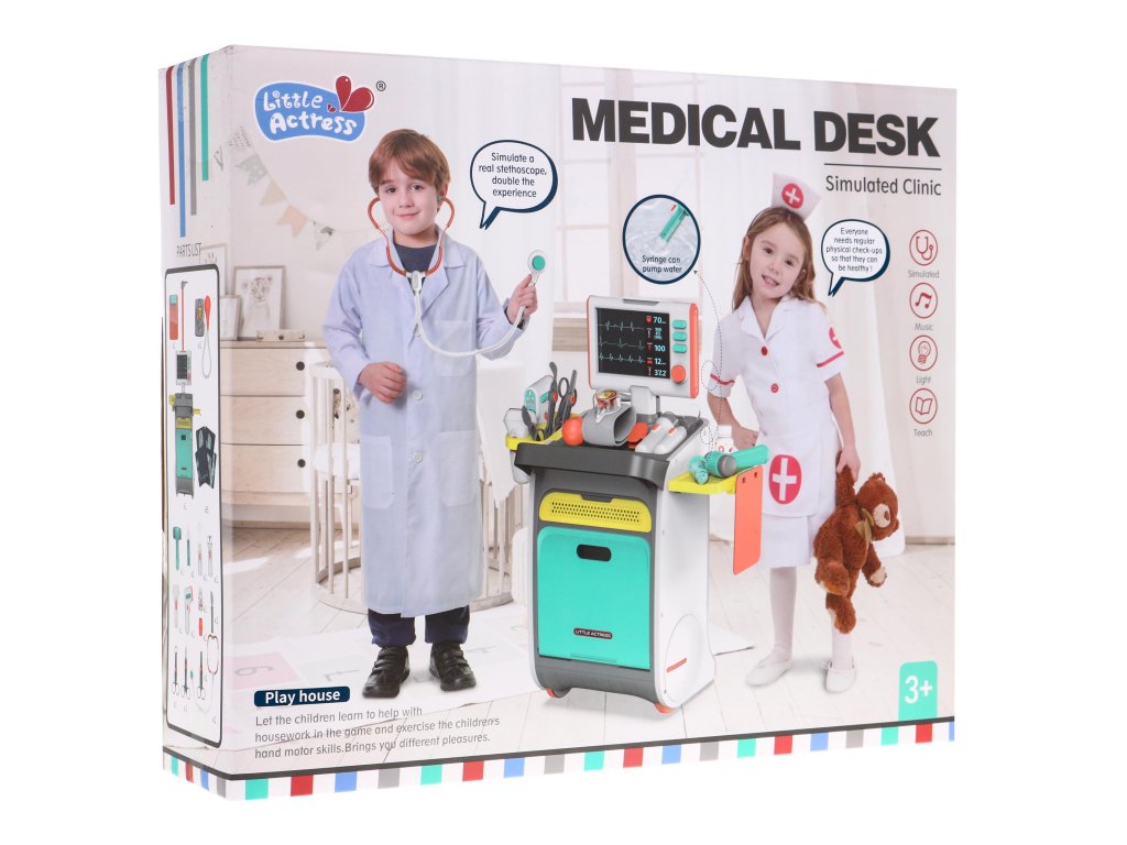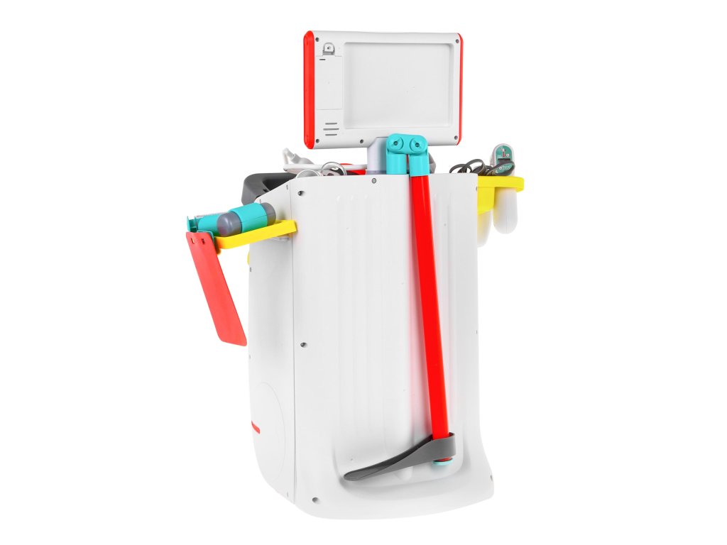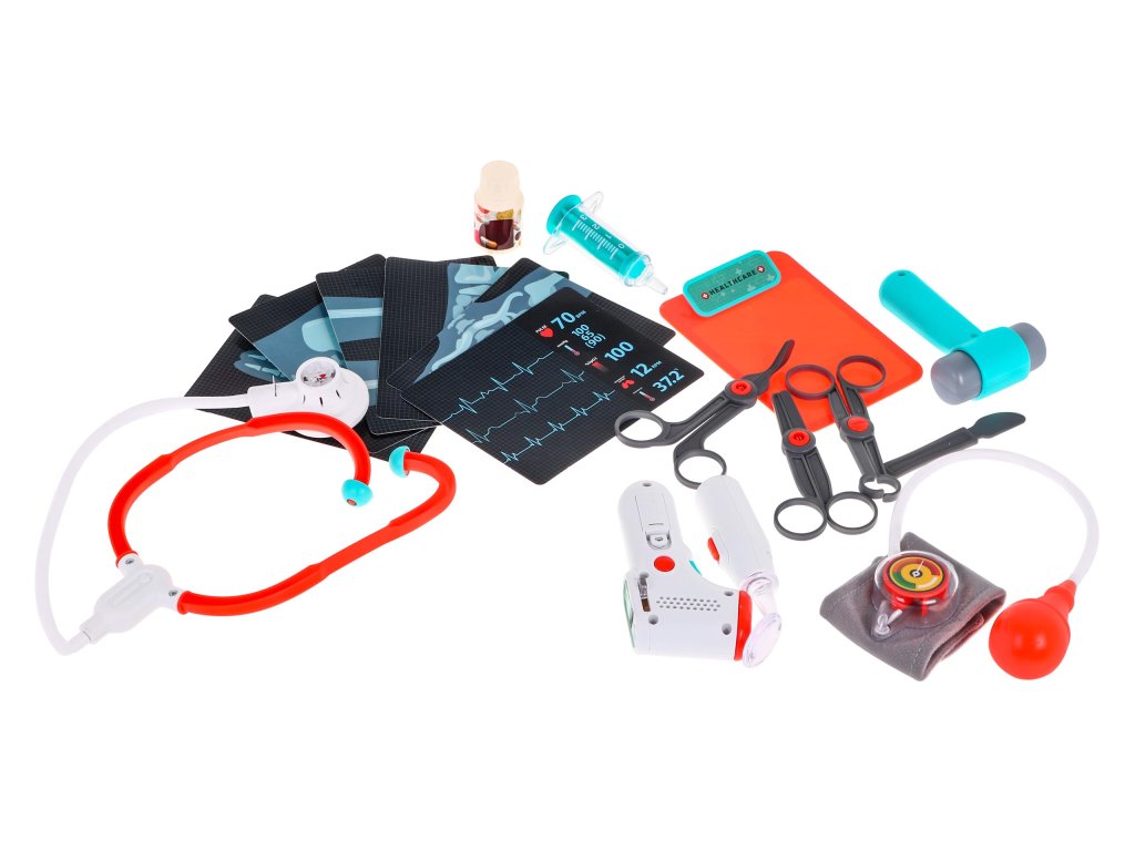 | - a medical trolley with shelves for accessories and a drawer, - height measure up to 112 cm, - EKG and X-ray monitor with sound effects, - X-rays of the foot, pelvis, lungs, hands, legs, - stethoscope with heartbeat sound and backlit display, - a pressure gauge with an inflating bulb, - illuminated dental mirror, - illuminated diagnostic flashlight, - illuminated ultrasound probe, - thermometer with temperature control, backlit result and temperature measurement signal, - a syringe with the possibility of taking water, - neurological hammer, - scalpel, - scissors, - medical tongs, - dressing scissors, - pad for the patient's card, - dummy container with medicines, - buckle, - decorative stickers, - installation instructions. |