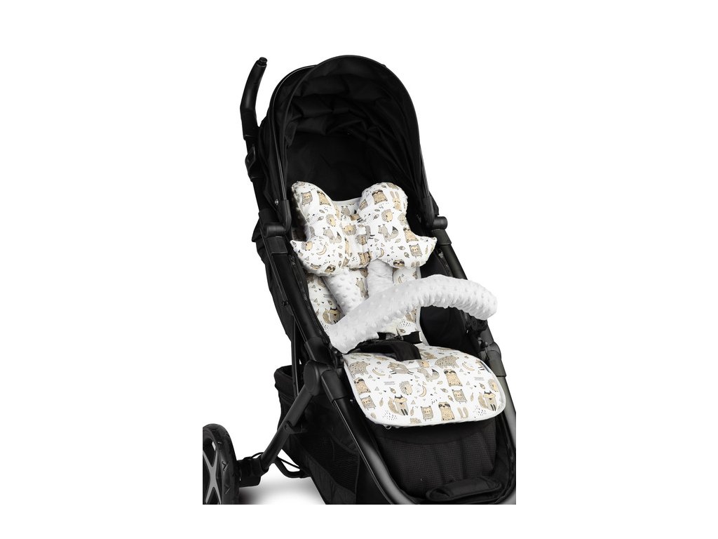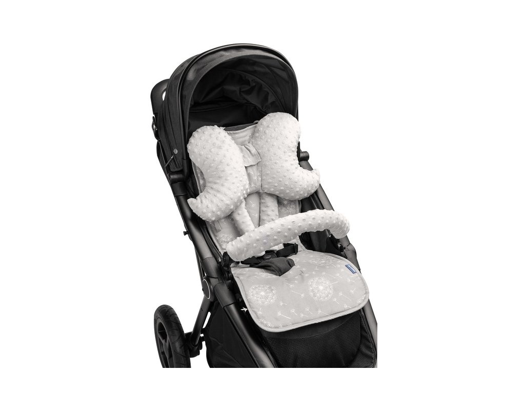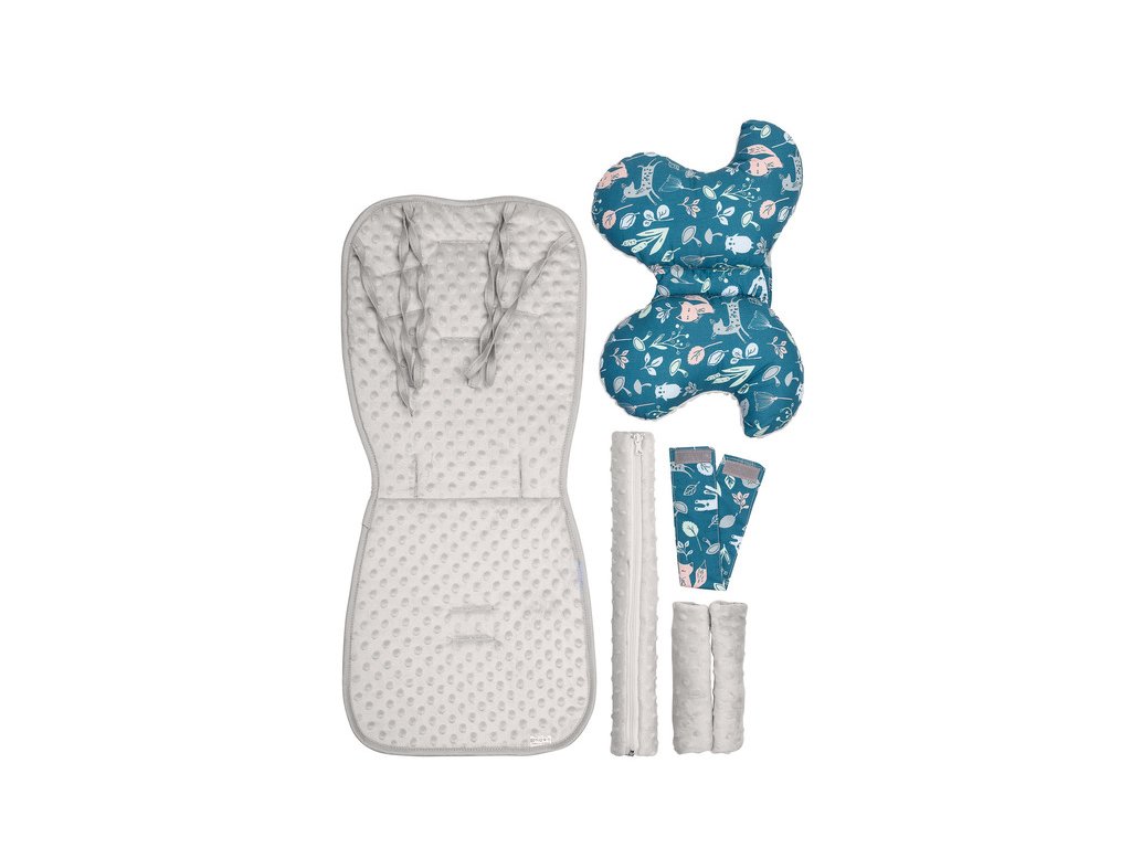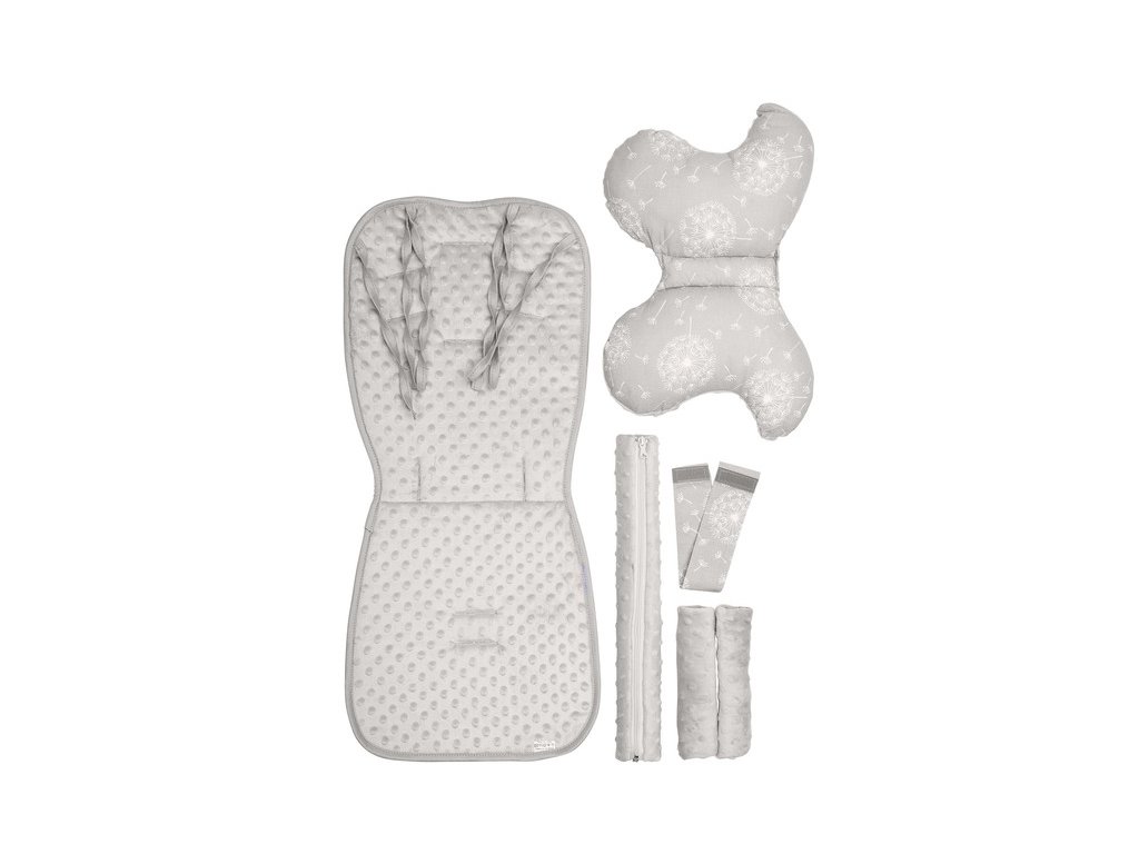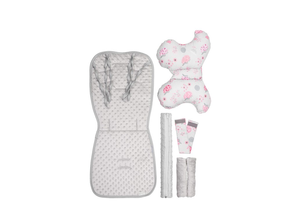 Luxusní set se skládá z oboustranné vložky do kočárku, motýlkového polštáře a krycích vrstev pro čelenku a opasky. Vložka i polštářek jsou na jedné straně zdobeny 100% bavlnou a na druhé straně mají příjemný materiál Minky na dotek. Vložka je měkká, ale zároveň nemá mělké sedadlo. Je určen pro kočárky a hluboké kočárky a má otvory pro opasky , takže se vejde do každého kočárku. Kromě praktické funkce ochrany před nečistotami a zlepšení komfortu cestování sada oživí interiér kočárku a dodá mu výrazný charakter