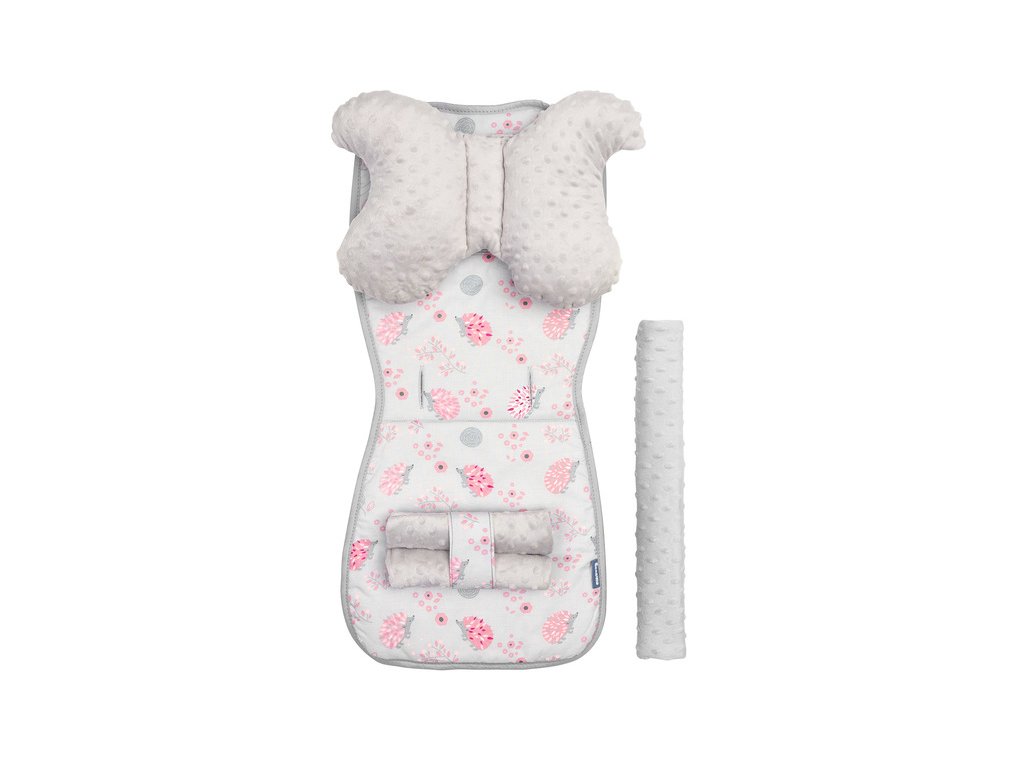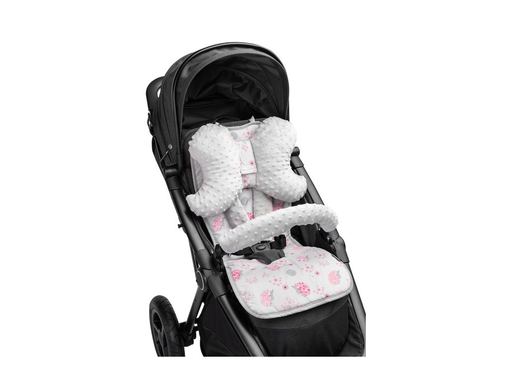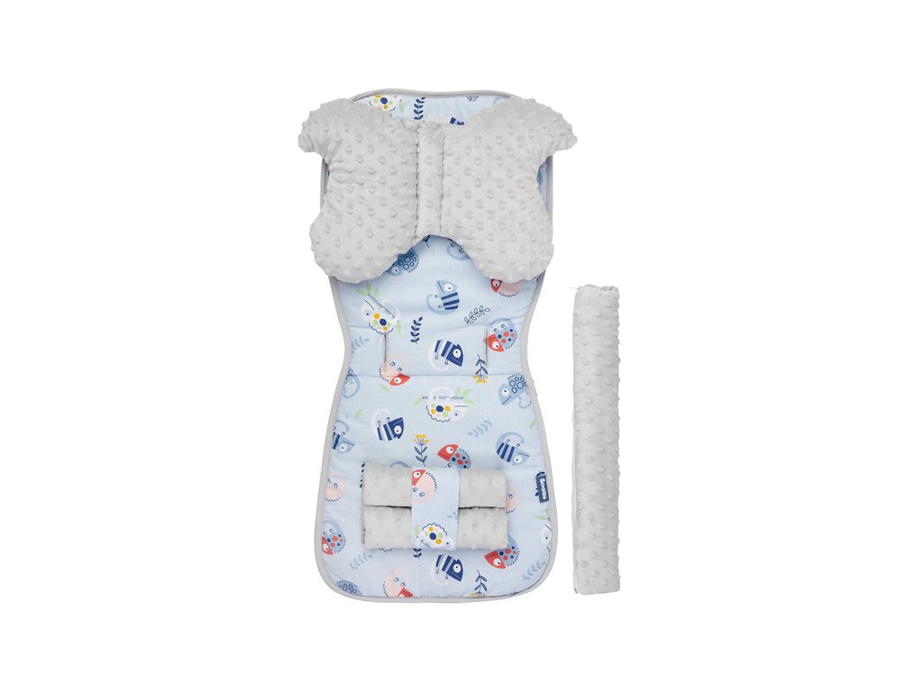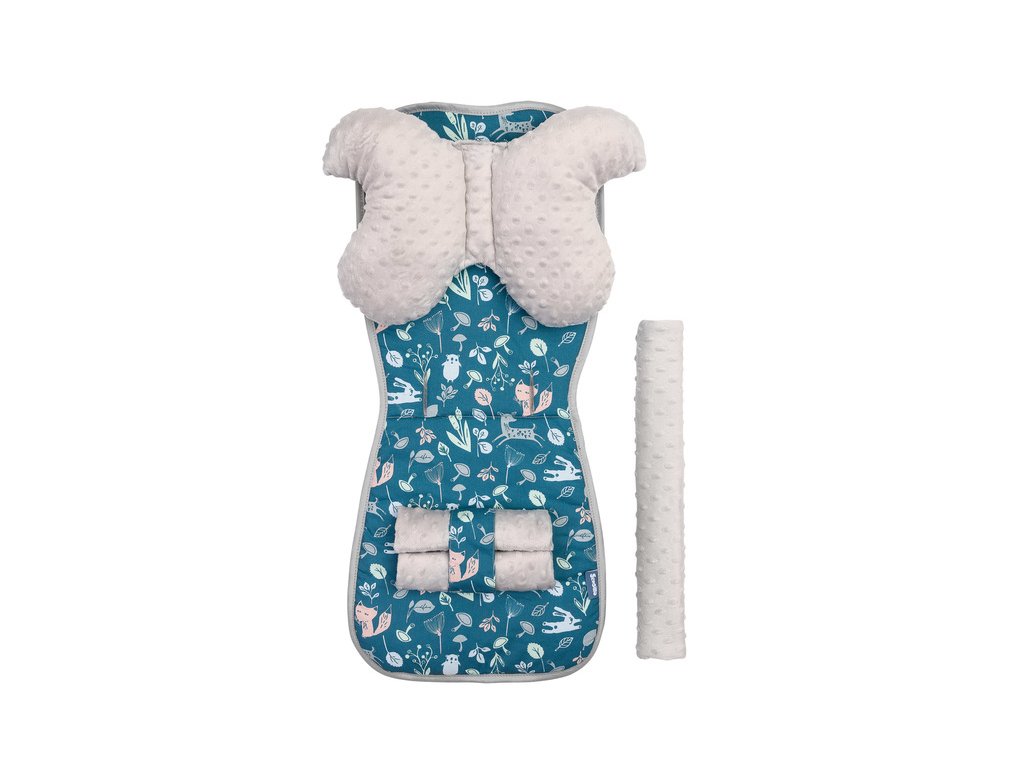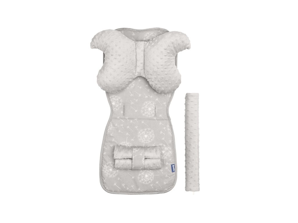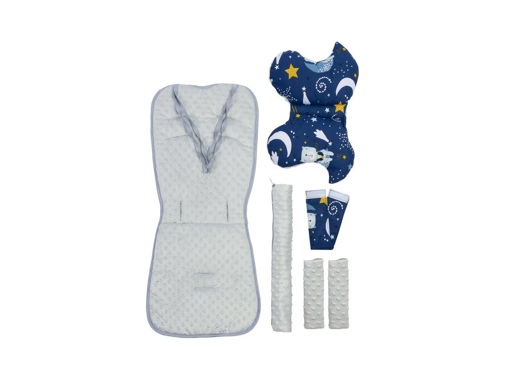 Luxusní set se skládá z oboustranné vložky do kočárku, motýlkového polštáře a krycích vrstev pro čelenku a opasky. Vložka i polštářek jsou na jedné straně zdobeny 100% bavlnou a na druhé straně mají příjemný materiál Minky na dotek. Vložka je měkká, ale zároveň nemá mělké sedadlo. Je určen pro kočárky a hluboké kočárky a má otvory pro opasky , takže se vejde do každého kočárku. Kromě praktické funkce ochrany před nečistotami a zlepšení komfortu cestování sada oživí interiér kočárku a dodá mu výrazný charakter