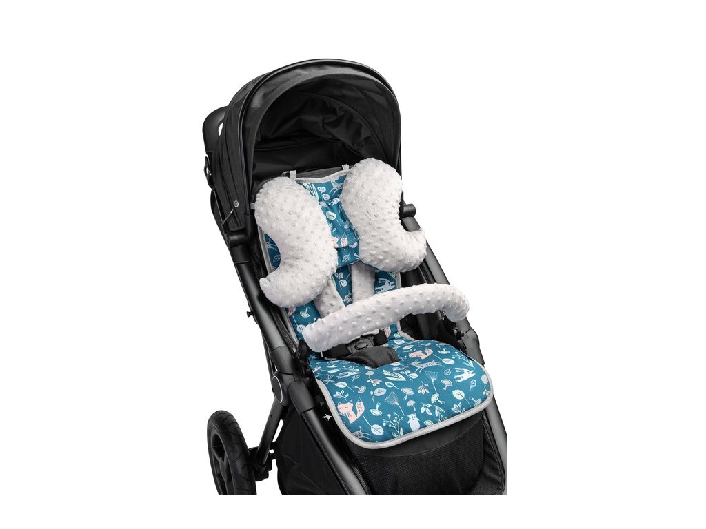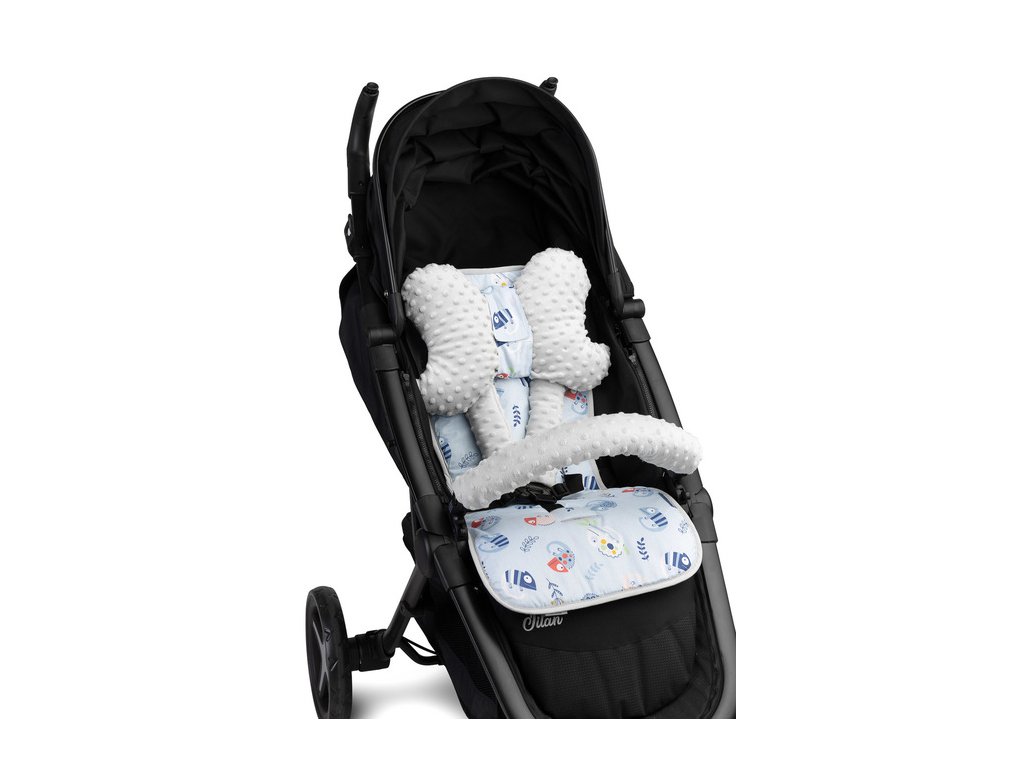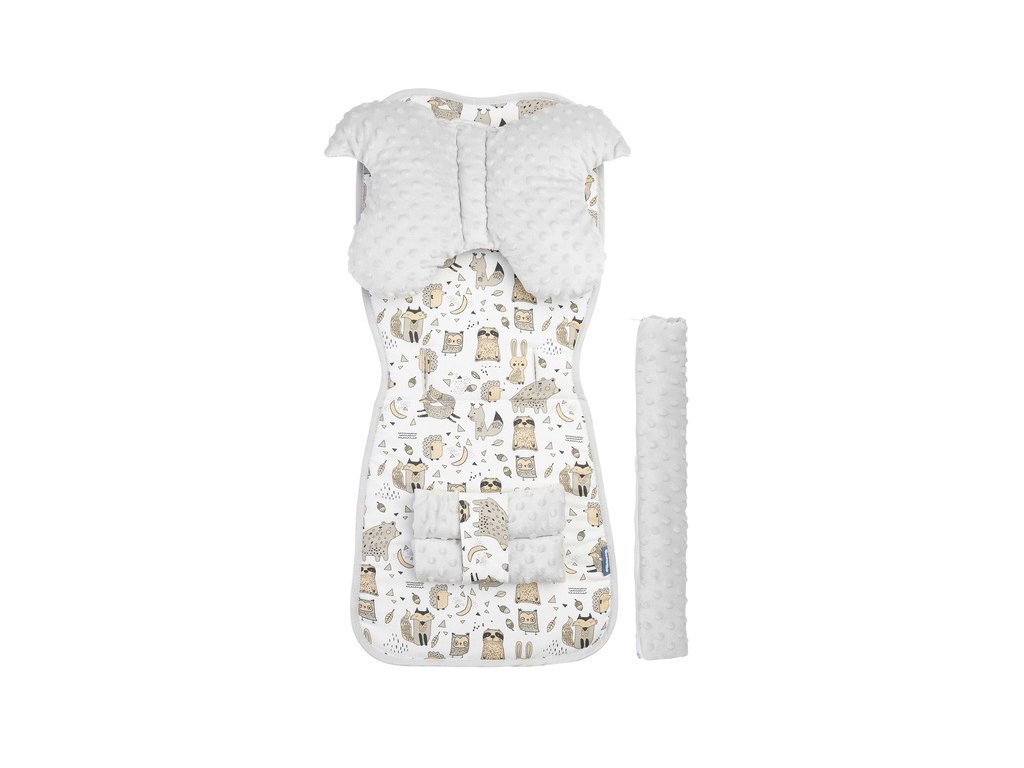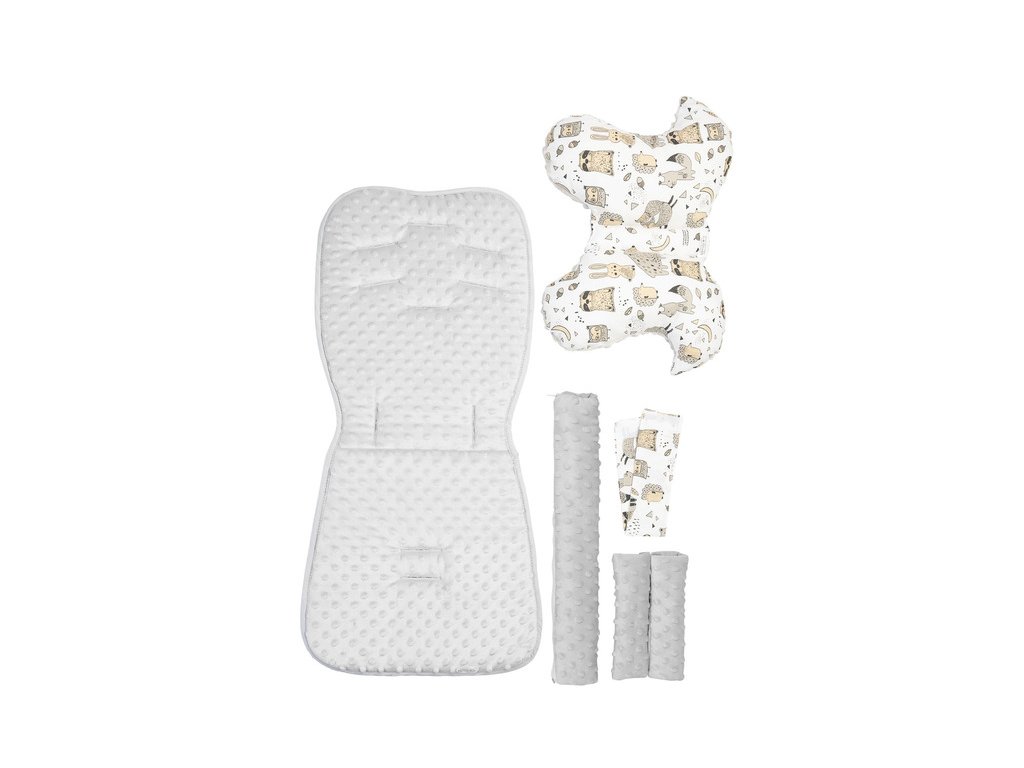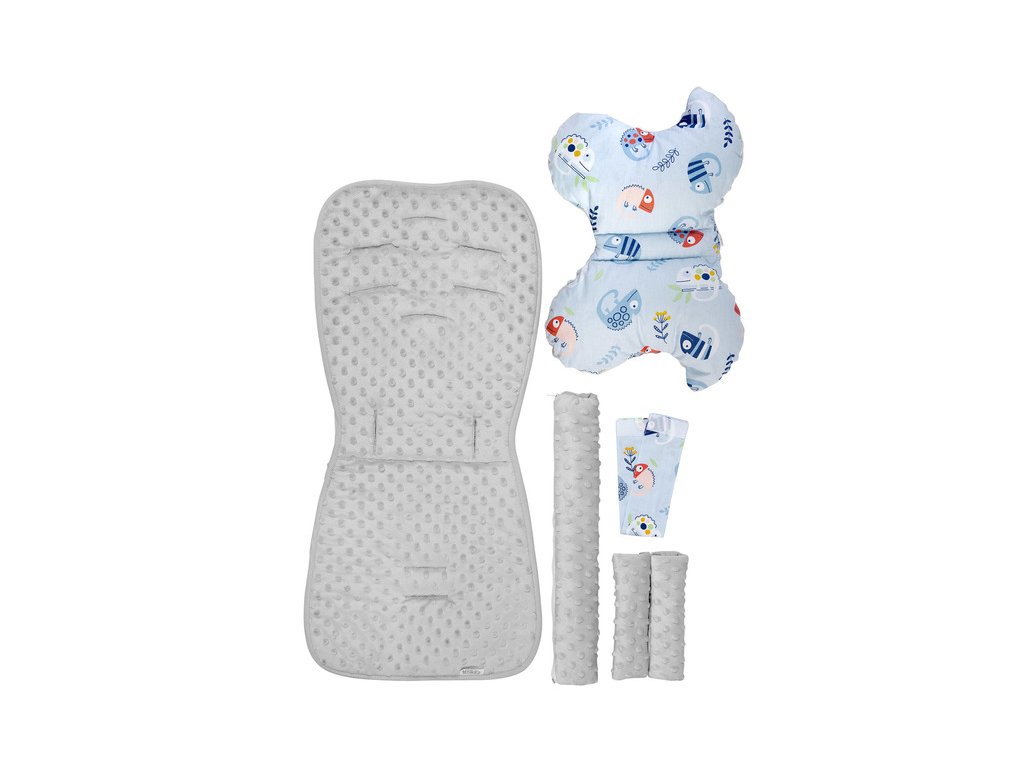 Luxusní set se skládá z oboustranné vložky do kočárku, motýlkového polštáře a krycích vrstev pro čelenku a opasky. Vložka i polštářek jsou na jedné straně zdobeny 100% bavlnou a na druhé straně mají příjemný materiál Minky na dotek. Vložka je měkká, ale zároveň nemá mělké sedadlo. Je určen pro kočárky a hluboké kočárky a má otvory pro opasky , takže se vejde do každého kočárku. Kromě praktické funkce ochrany před nečistotami a zlepšení komfortu cestování sada oživí interiér kočárku a dodá mu výrazný charakter
