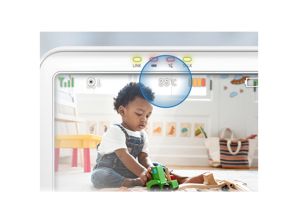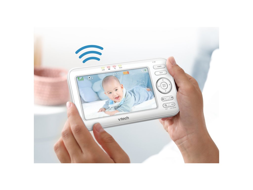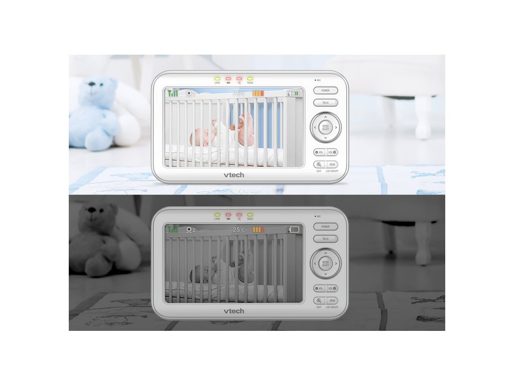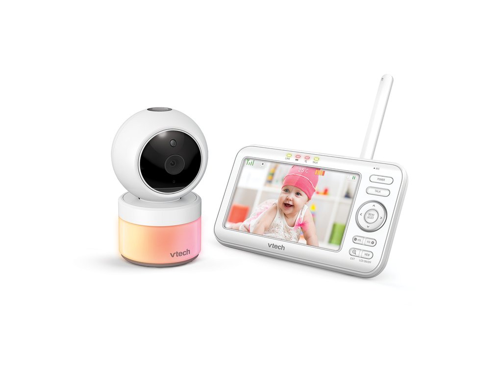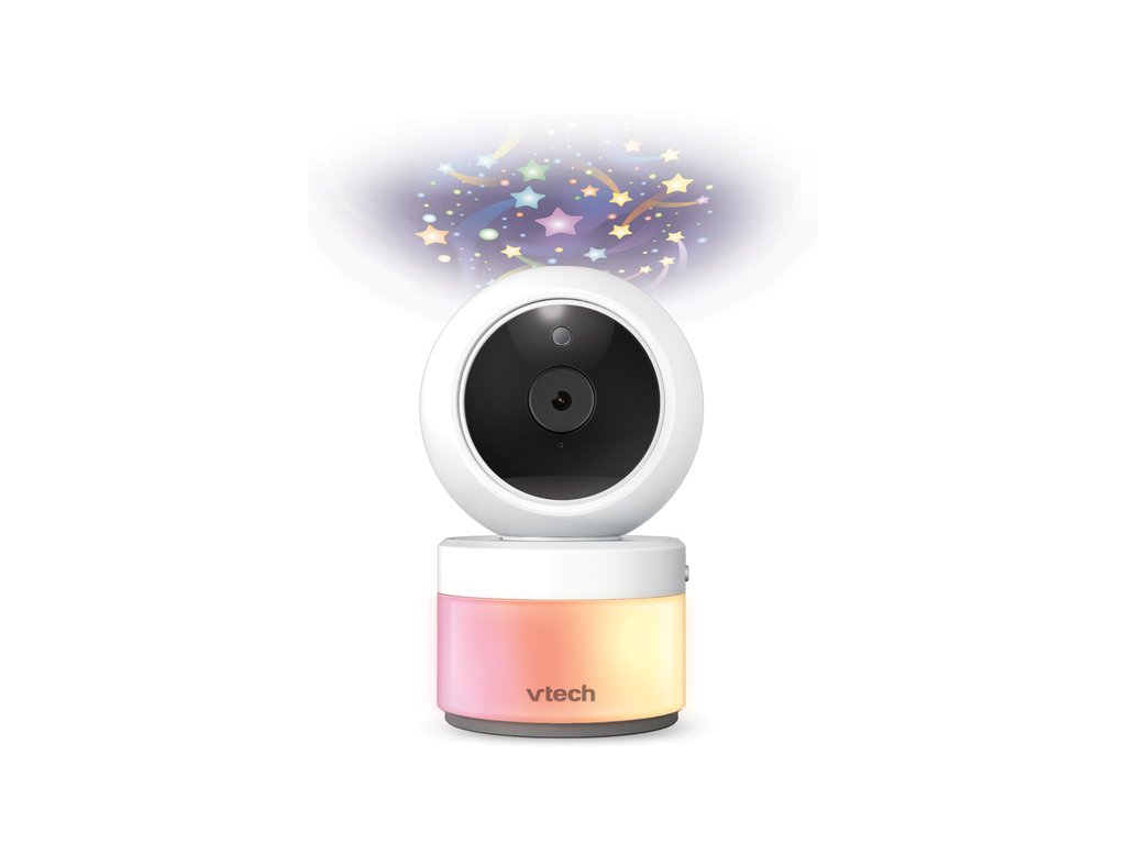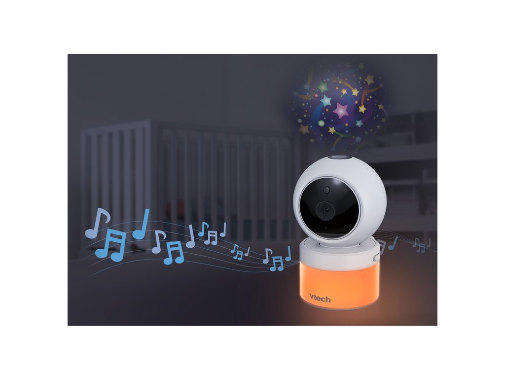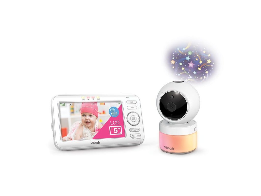 Video monitor Vtech VM5463 je novinkou na trhu, která má velký moderní 5palcový displej a noční lampu s adaptivním světlem, stejně jako vestavěnou hvězdicovou projekci osvětlující strop, aktivovanou při detekci zvuků.