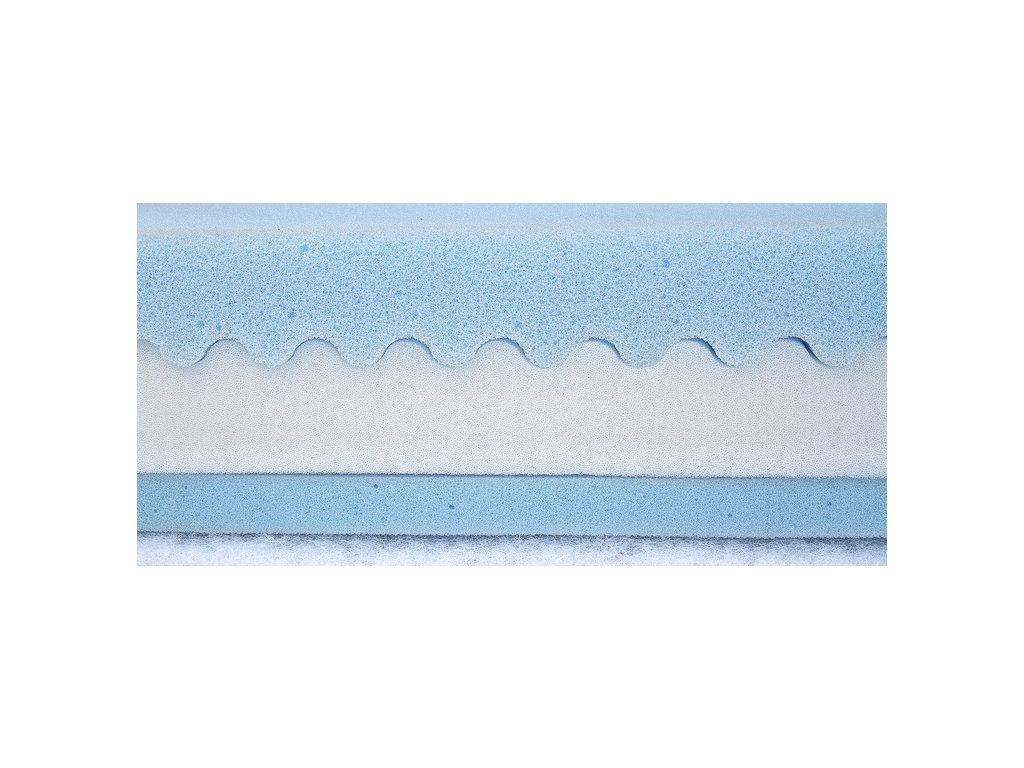 - matrace je vyplněna: vlnitá vysoce elastická pěna HR 30 (3,5 cm), polyuretanová pěna T 25 (3,5 cm), plstěná výztuž, další vrstva polyuretanové pěny T 30 (2 cm), zabalená do načechrané netkané textilie.
