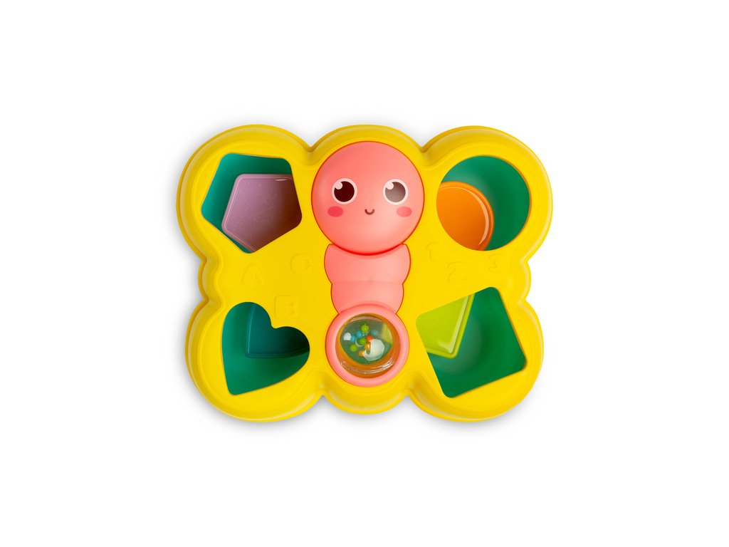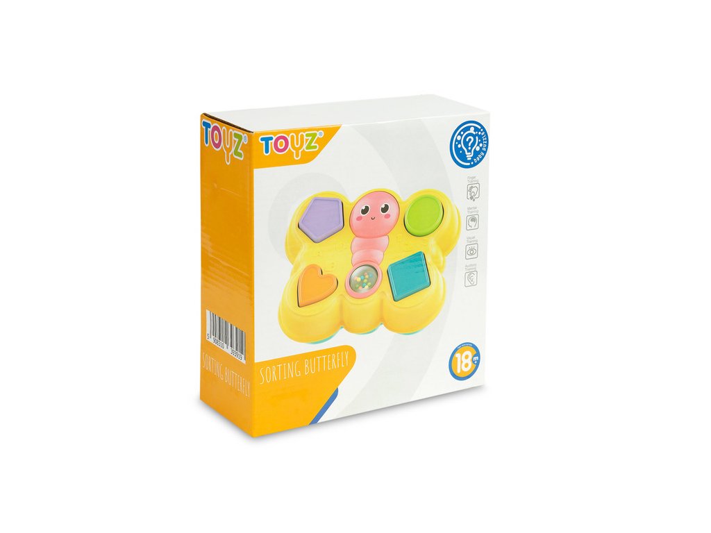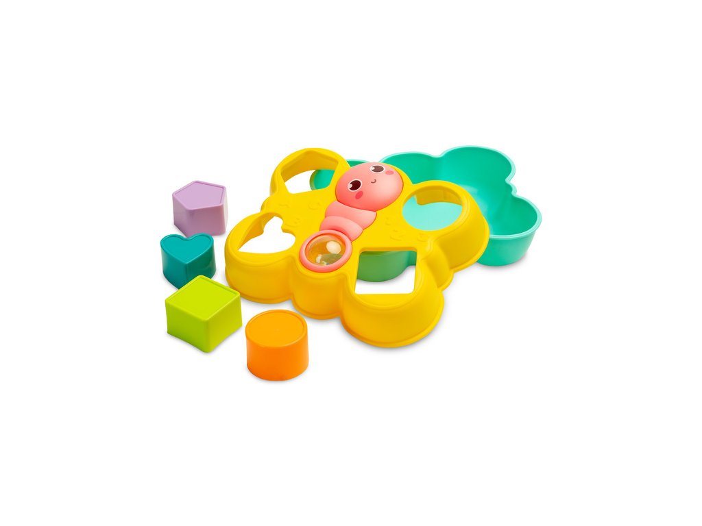 Sorter Butterfly je skvělá logická hračka pro nejmenší. Dodává se se 4 barevnými kostkami, které odpovídají otvorům ve víku. Motýlova usměvavá tvář může být otočena a v ocasu je průhledná koule plná barevných, chrastících kuliček. Hračka je vhodná pro děti starší 18 měsíců.