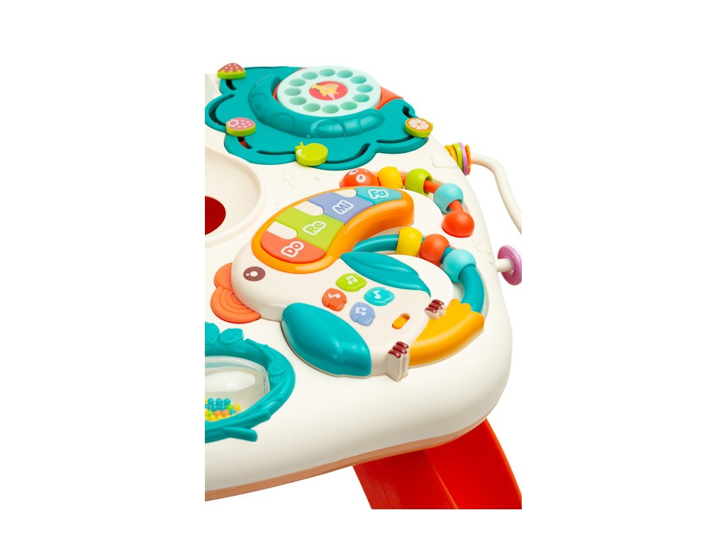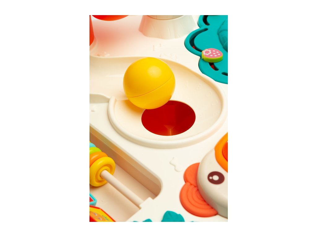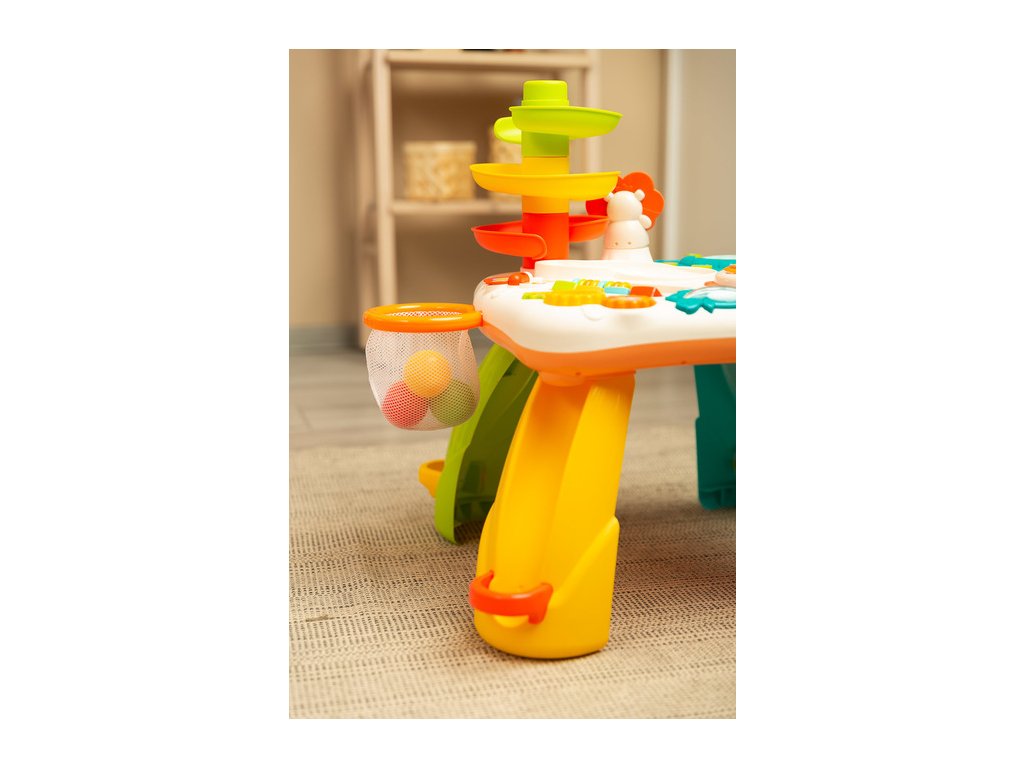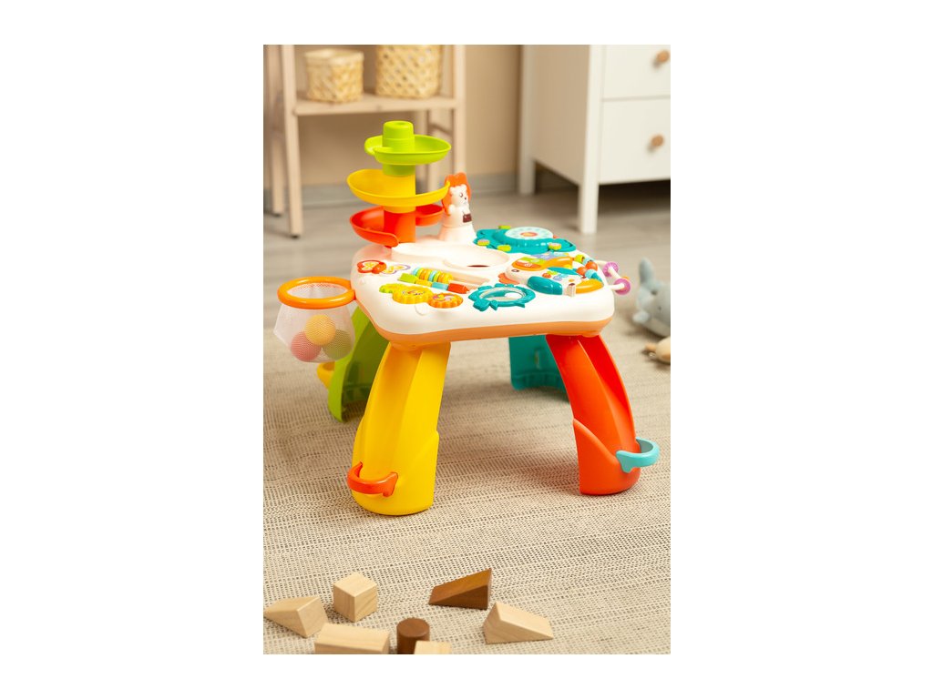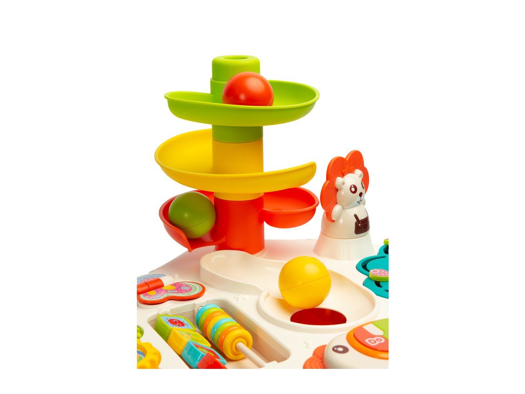 Spirálový stůl je multifunkční hračka určená pro děti, které touží po světě. Výrobek je vybaven sadou chrastítek, barevných smyslových hraček a hudebního panelu ve tvaru tukana, který může dítě chytit a hrát si s nimi odděleně. Spirálový snímek a 3 chrastící koule jsou hlavní částí hračky a poskytnou dítěti dlouhé hodiny kreslení otvoru, ze kterého míč vypadne ze spirály. Hračka je vhodná pro děti starší 18 měsíců.