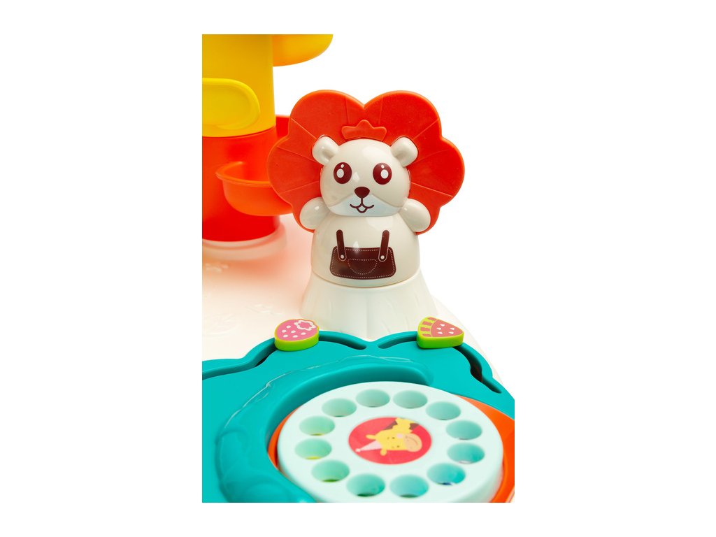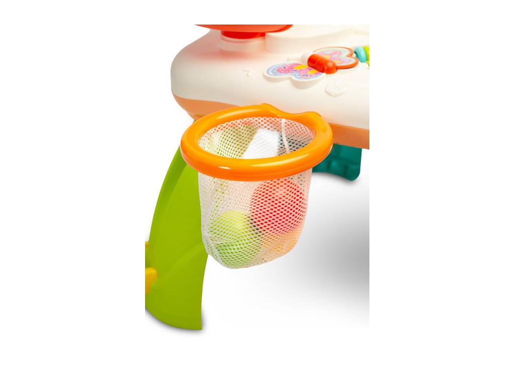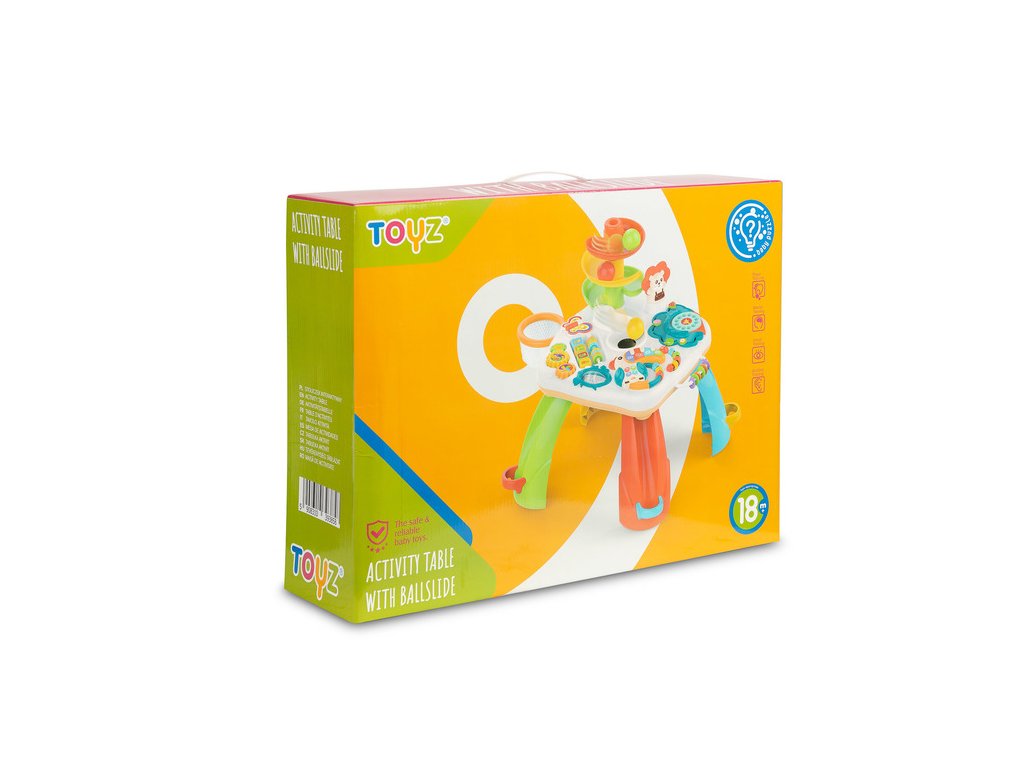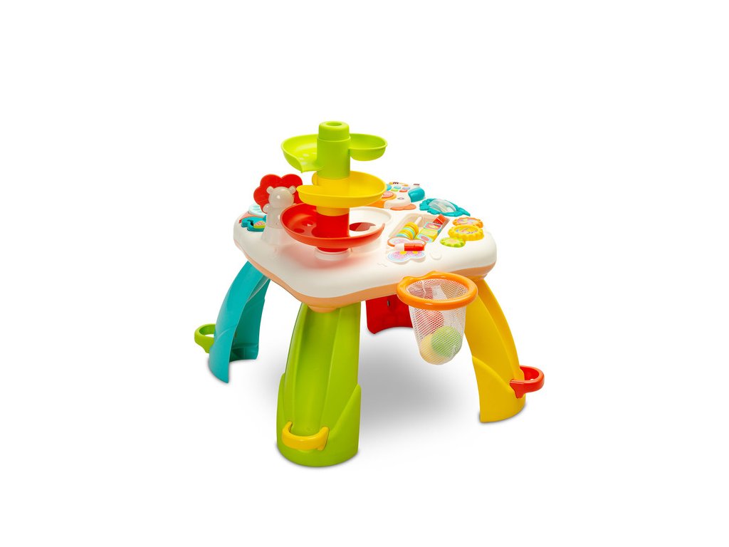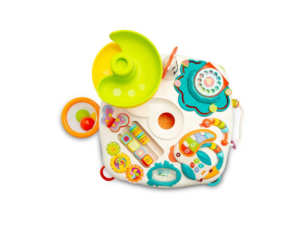 Spirálový stůl je multifunkční hračka určená pro děti, které touží po světě. Výrobek je vybaven sadou chrastítek, barevných smyslových hraček a hudebního panelu ve tvaru tukana, který může dítě chytit a hrát si s nimi odděleně. Spirálový snímek a 3 chrastící koule jsou hlavní částí hračky a poskytnou dítěti dlouhé hodiny kreslení otvoru, ze kterého míč vypadne ze spirály. Hračka je vhodná pro děti starší 18 měsíců.