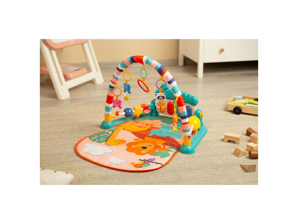 Vzdělávací podložka ZOO je produkt určený pro děti, které si rády hrají vleže. Rohož je vybavena čelenkou s chrastítky zavěšenými na ní ve tvaru přátelských zvířat a zrcadlem, které potěší dítě. Multimediální panel s velkými tlačítky zpříjemní hru a smyslové hračky namontované po stranách pomohou při vývoji dítěte. Hračka je vhodná pro děti od prvních okamžiků života.