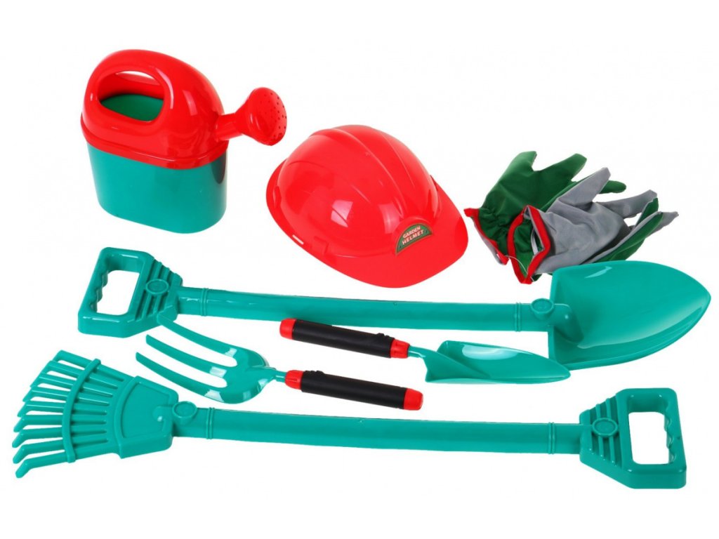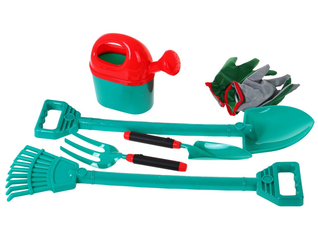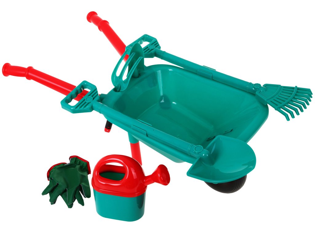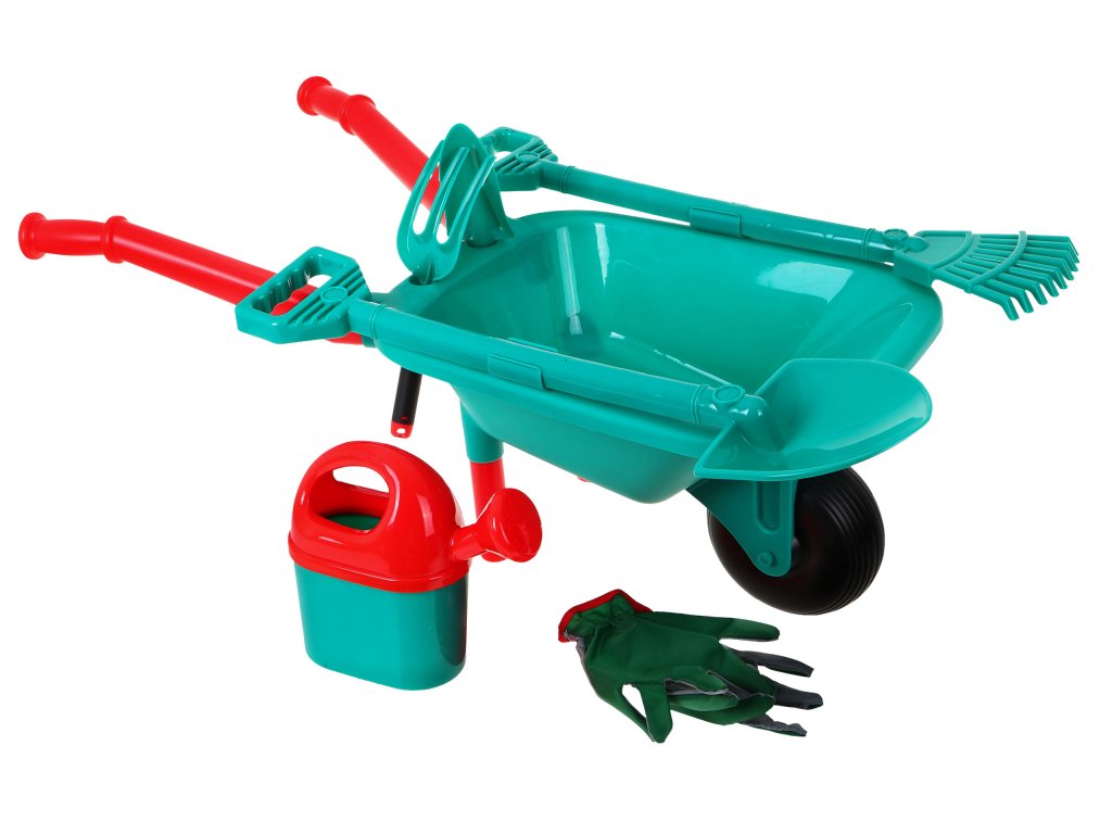 - large wheelbarrow (about 76 cm x 42 cm, the size of the wheelbarrow about 45 cm x 30 cm), - shovel (about 60cm x 14,5cm), - rake (about 59 cm x 15 cm), - watering can (approx. 20 cm x 22 cm), - gloves (length approx. 18 cm, finger length approx. 5 cm), - small forks (about 17 cm x 8 cm), - a small shoulder blade (about 18 cm x 6.5 cm). |