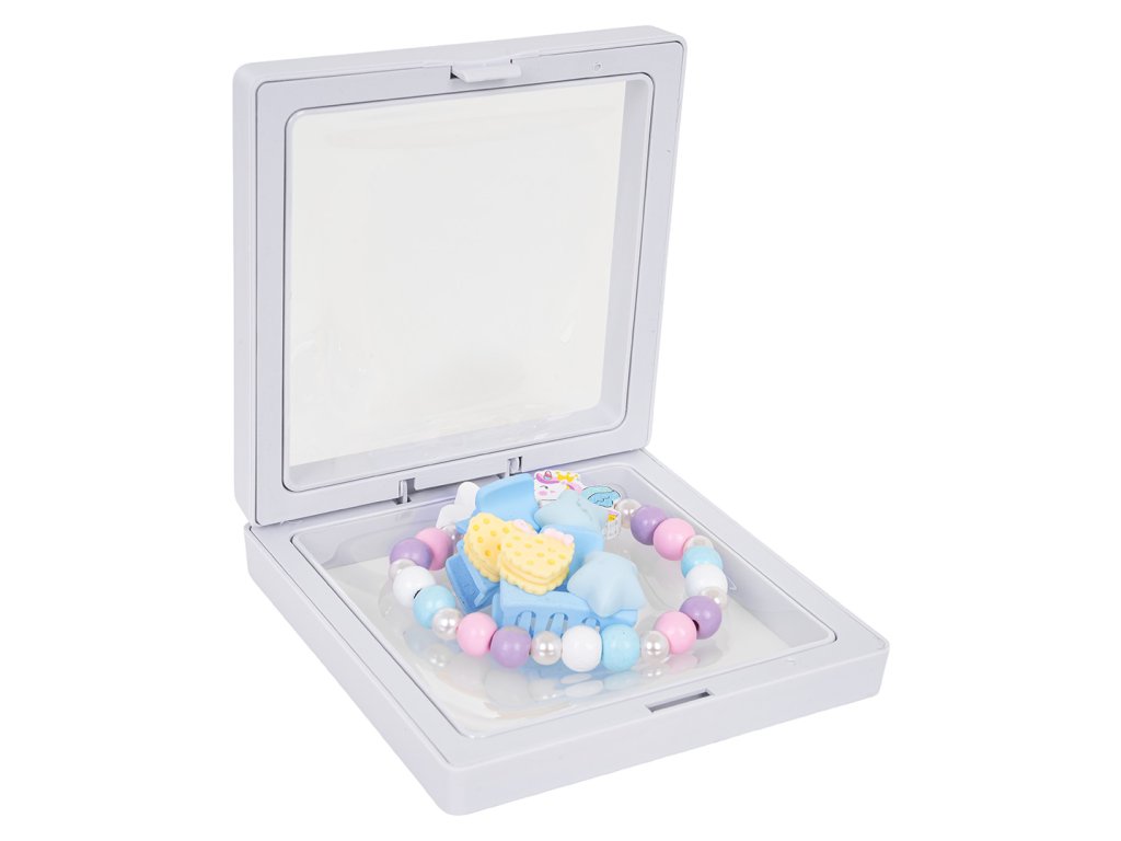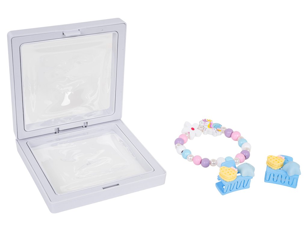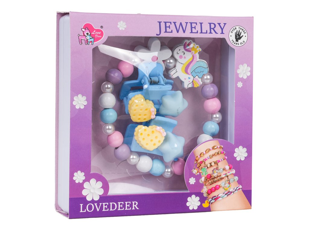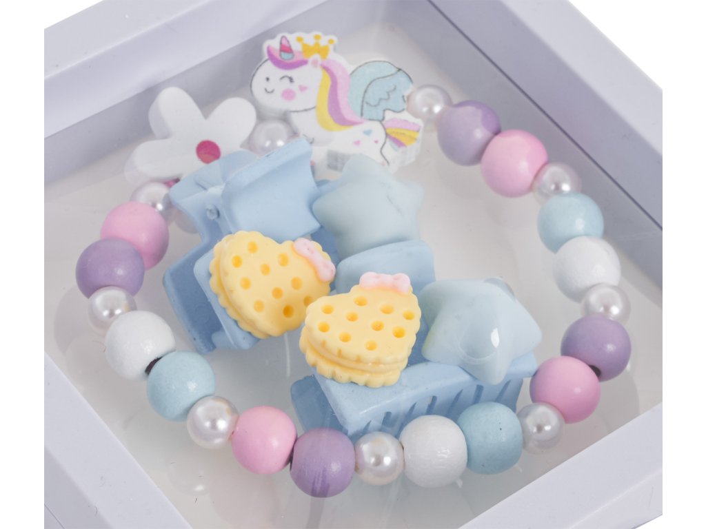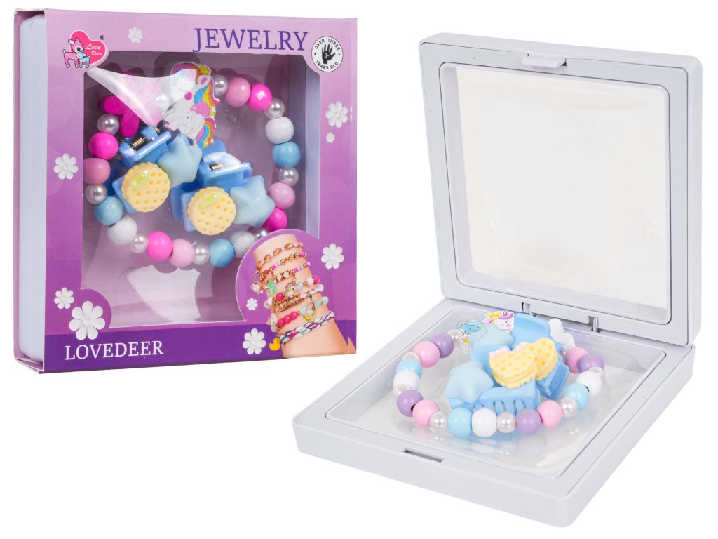 A unicorn jewelry set for children aged three and up. The set includes a beautiful bracelet made of multicolored wooden beads, pearls, and a unicorn element, as well as two hair clips. The set is crafted with attention to detail and vibrant colors.