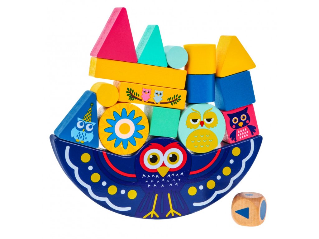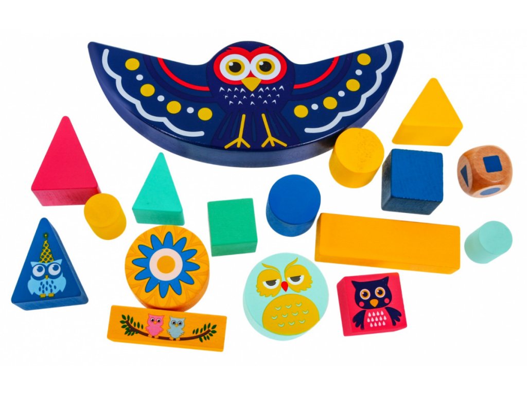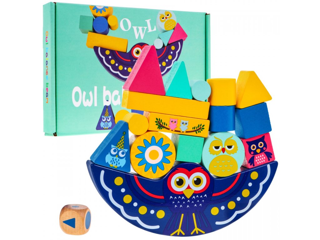| - wooden balancing owl (base), - 15 pieces of blocks of various shapes and colors, - Cube. |