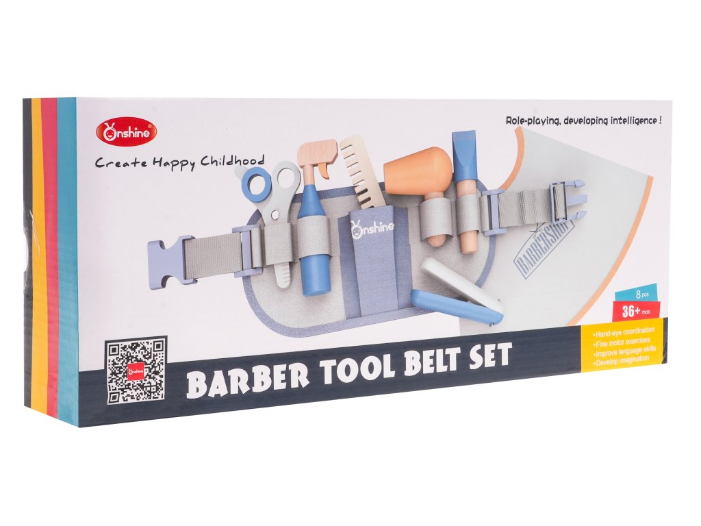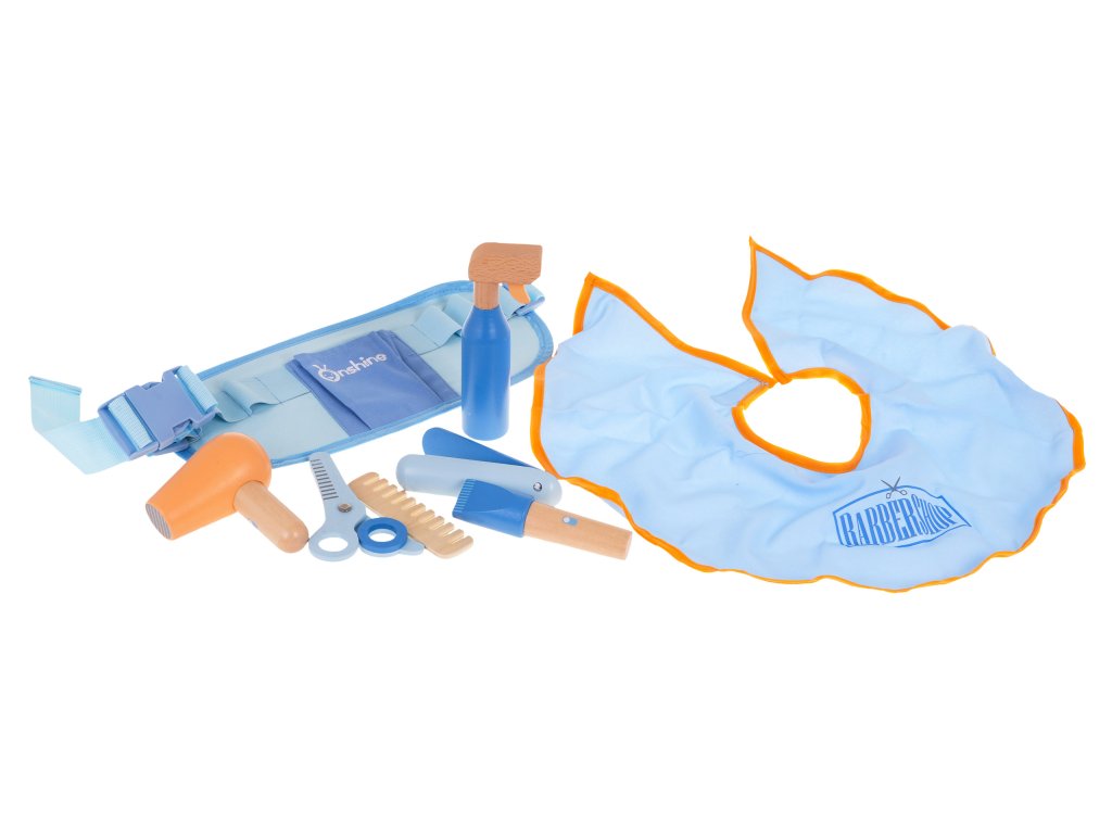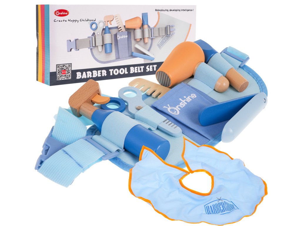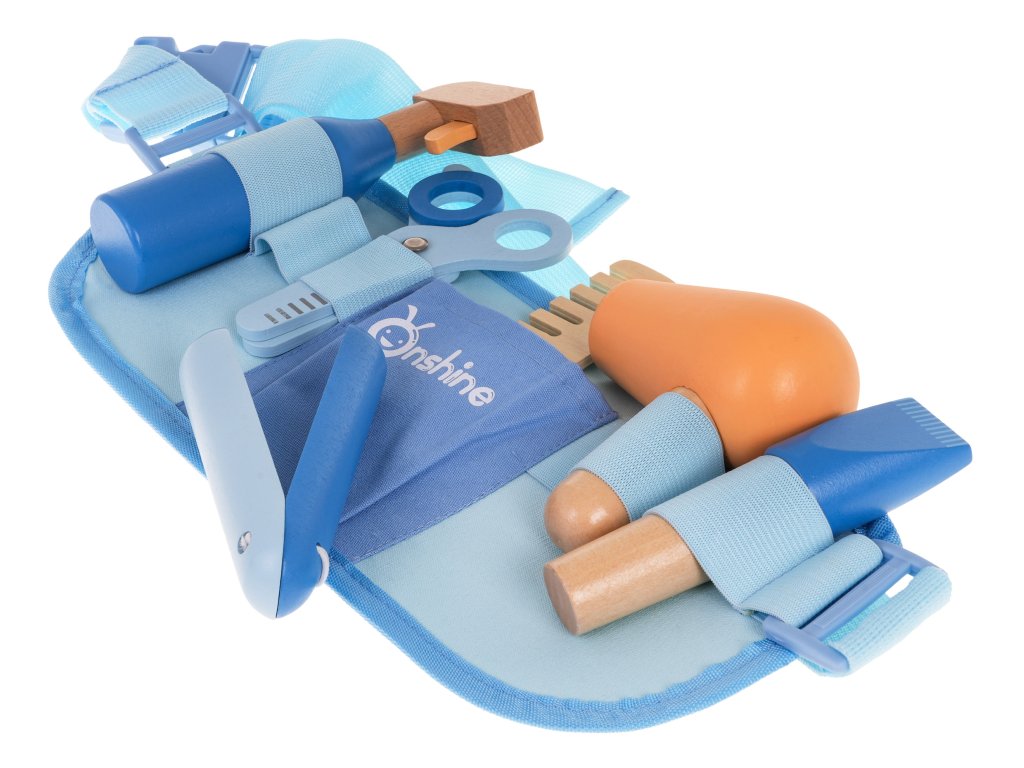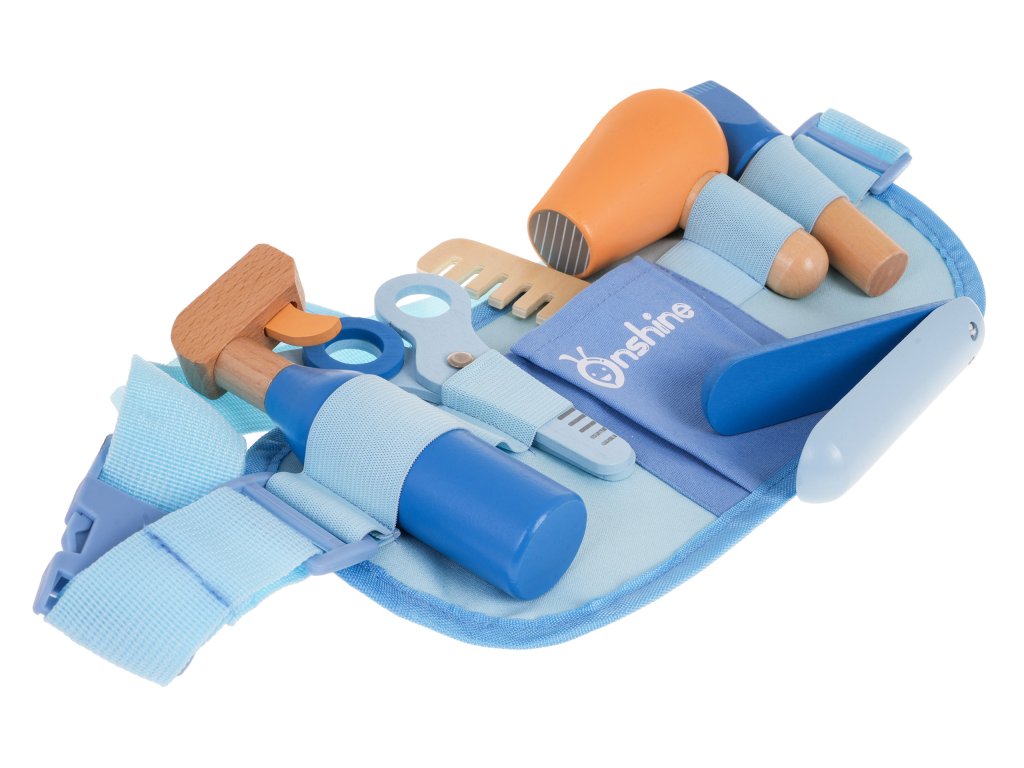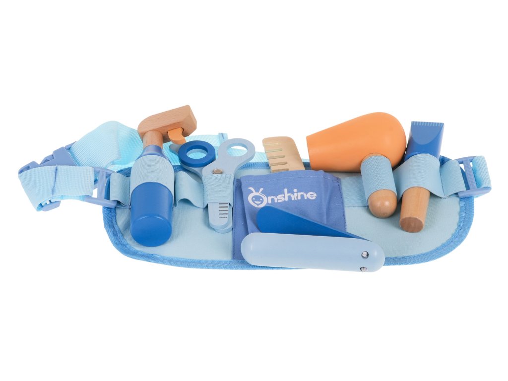 A wooden hairdressing set with an adjustable belt and accessories is suitable for children from 3 years of age. All hairdressing accessories are made of wood, do not have sharp edges and are safe and durable. The belt is adjustable and fastened with a snap. It has a pocket in the central part and five compartments that hold hairdressing scissors, a hair dryer, a straightener, a clipper, a comb and hairspray. Playing with this set will stimulate your child's imagination. |