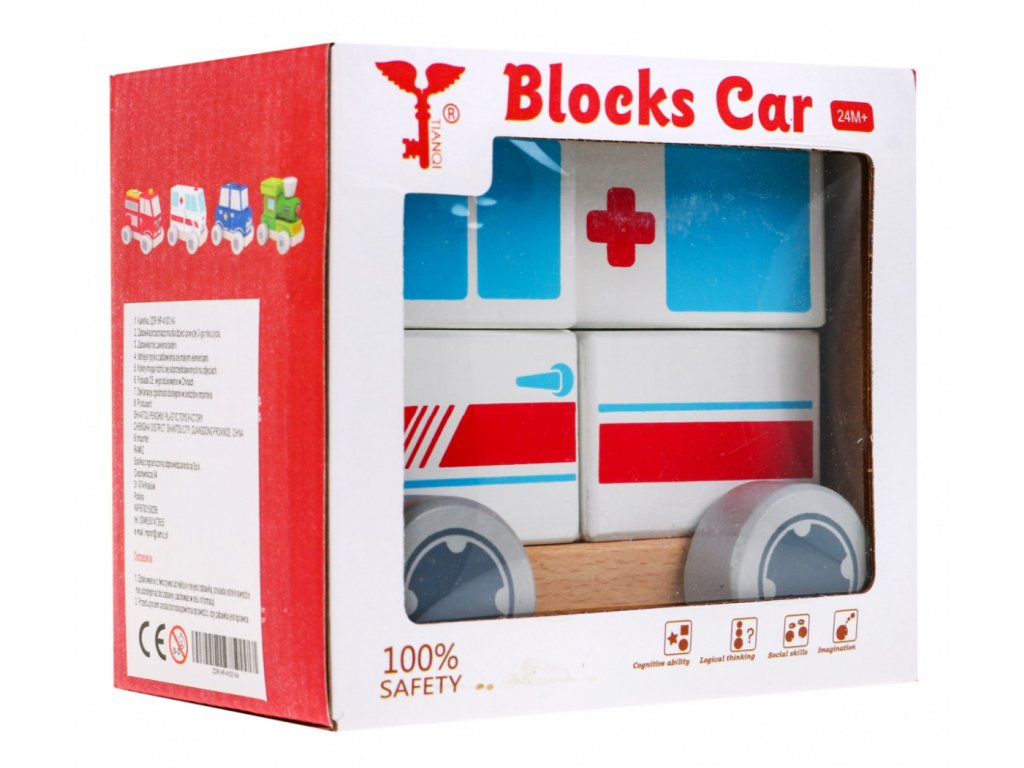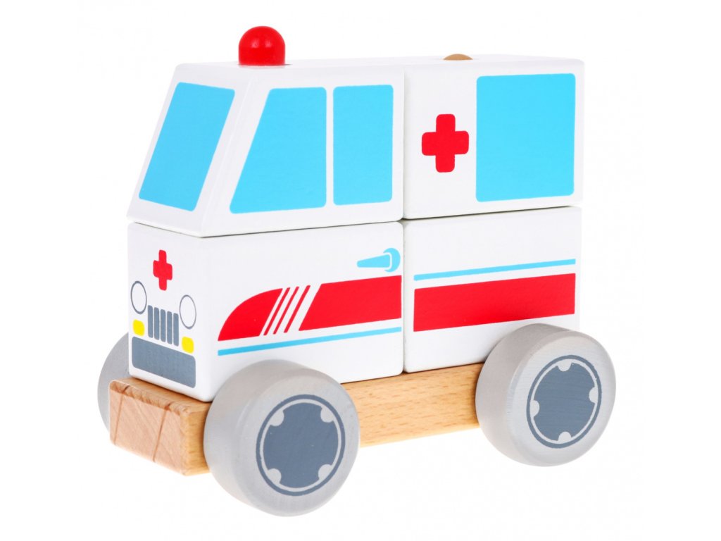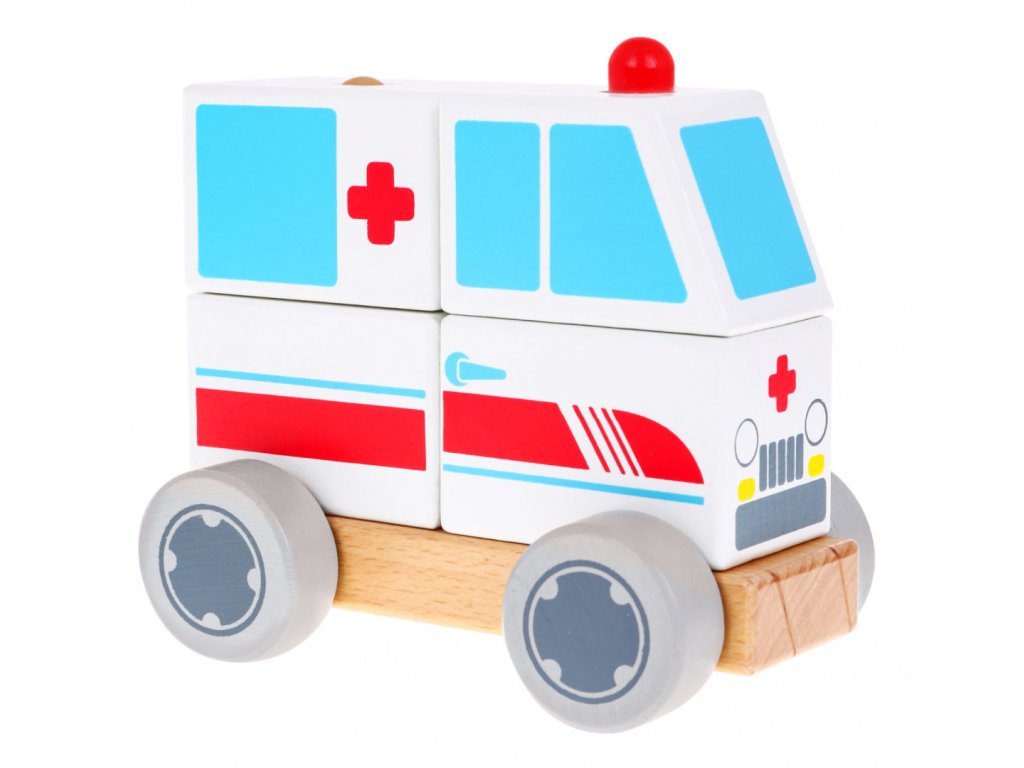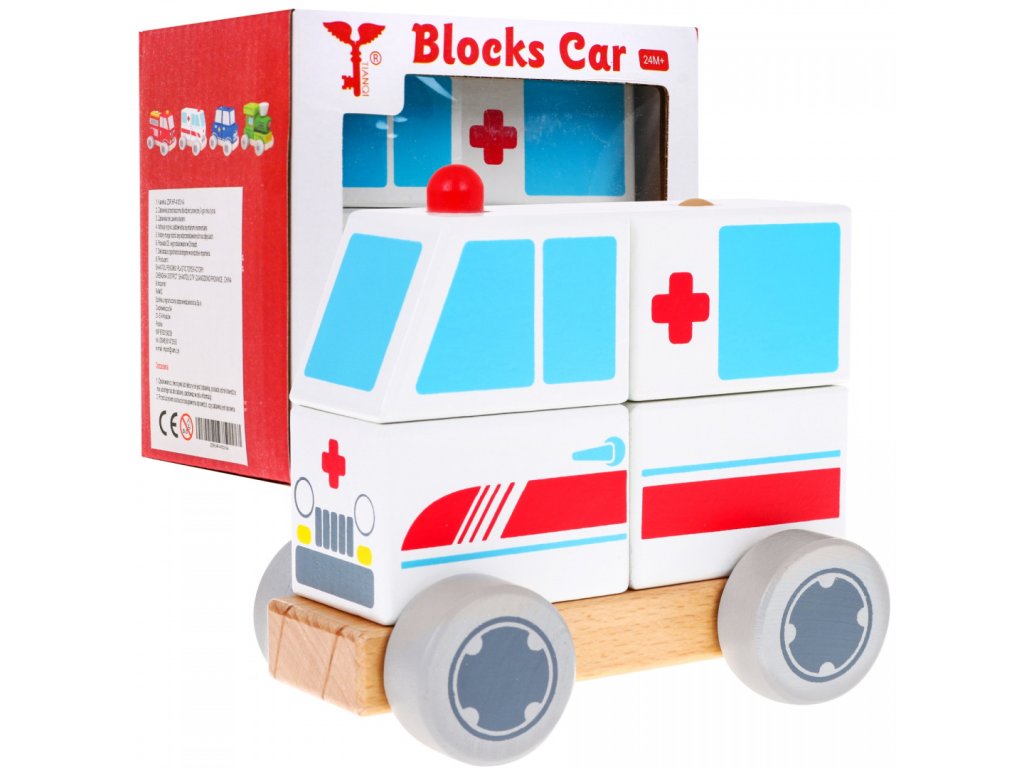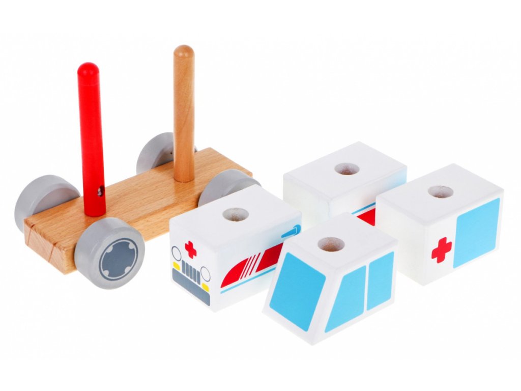 The wooden Ambulance car is a toy intended for creative children from the age of two. The ambulance consists of a base and four blocks. Wooden movable circles are attached to the stand on the sides, and 2 pegs on the top. The child puts blocks on the pegs to create a vehicle. All elements of the toy are made of wood, painted with non-toxic paints. Through play, the child supports the hand-eye coordination skills and teaches logical thinking. | |