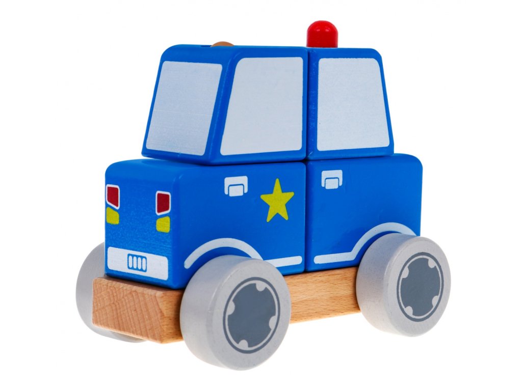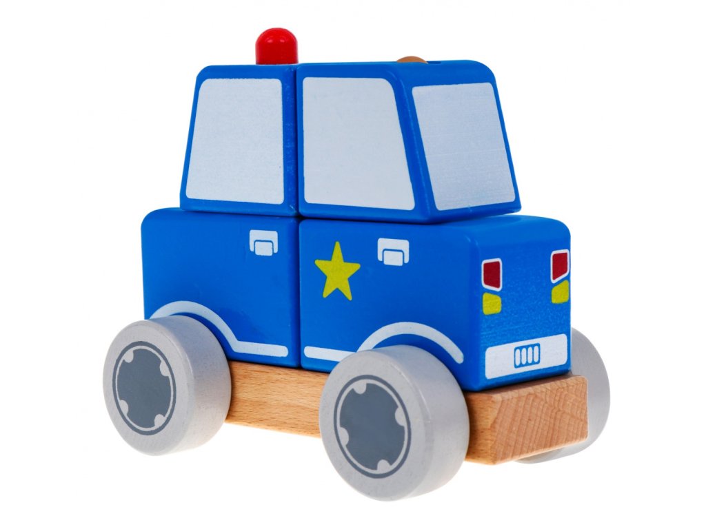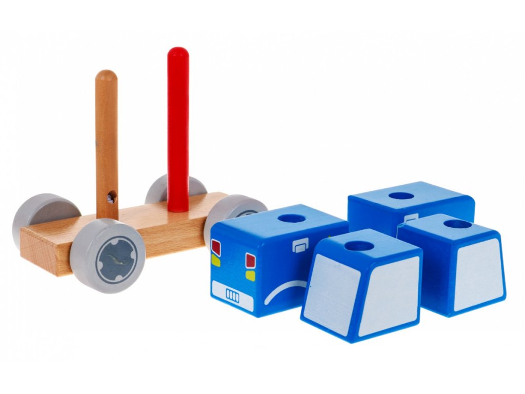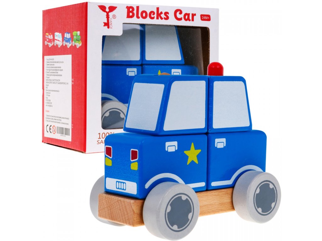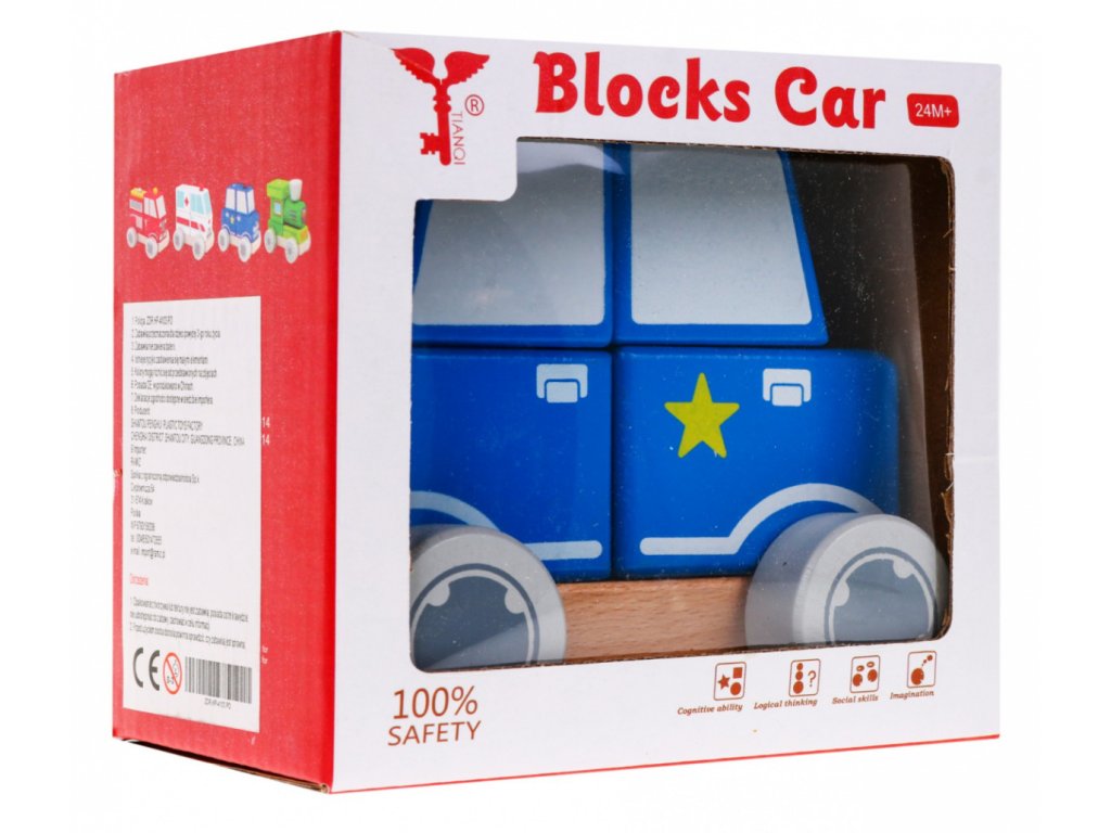 A wooden police car is a toy intended for creative children from the age of two. The car consists of a base and four blocks. Wooden movable circles are attached to the stand on the sides, and 2 pegs on the top. The child puts blocks on the pegs to create a vehicle. All elements of the toy are made of wood, painted with non-toxic paints. Through play, the child supports the hand-eye coordination skills and teaches logical thinking. | |
